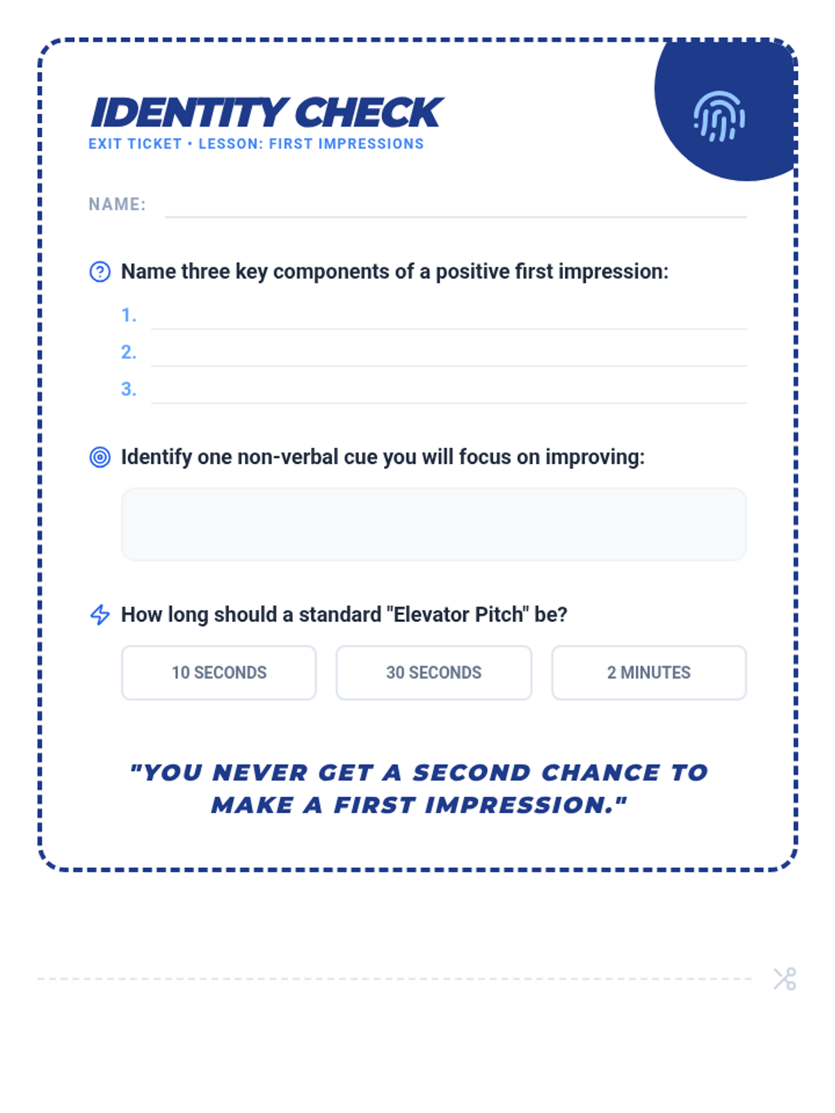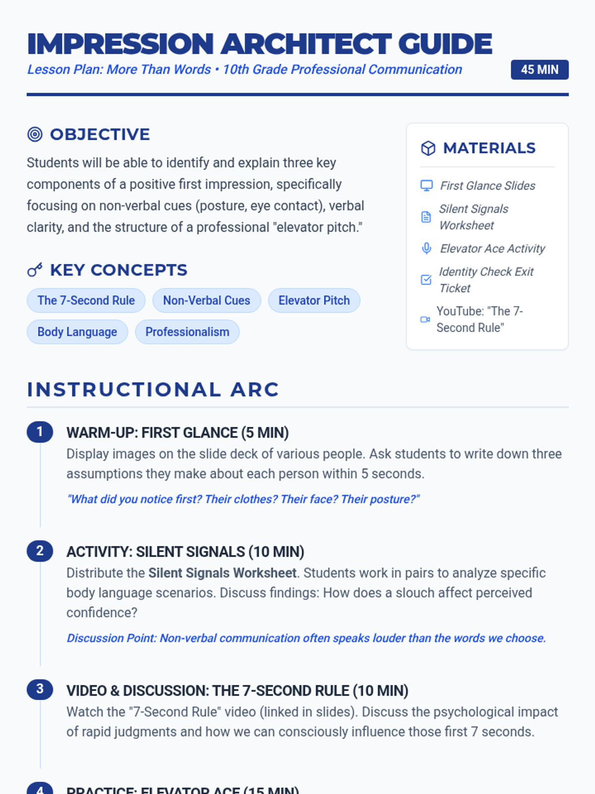 A comprehensive 45-minute lesson for 10th graders on the psychology and mechanics of first impressions, focusing on non-verbal communication and the "elevator pitch." Students analyze body language, practice confident introductions, and reflect on their personal branding.