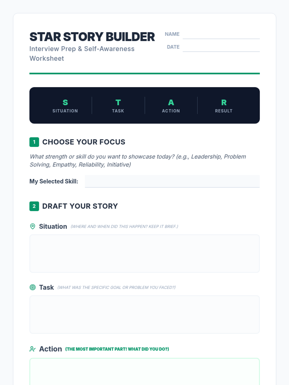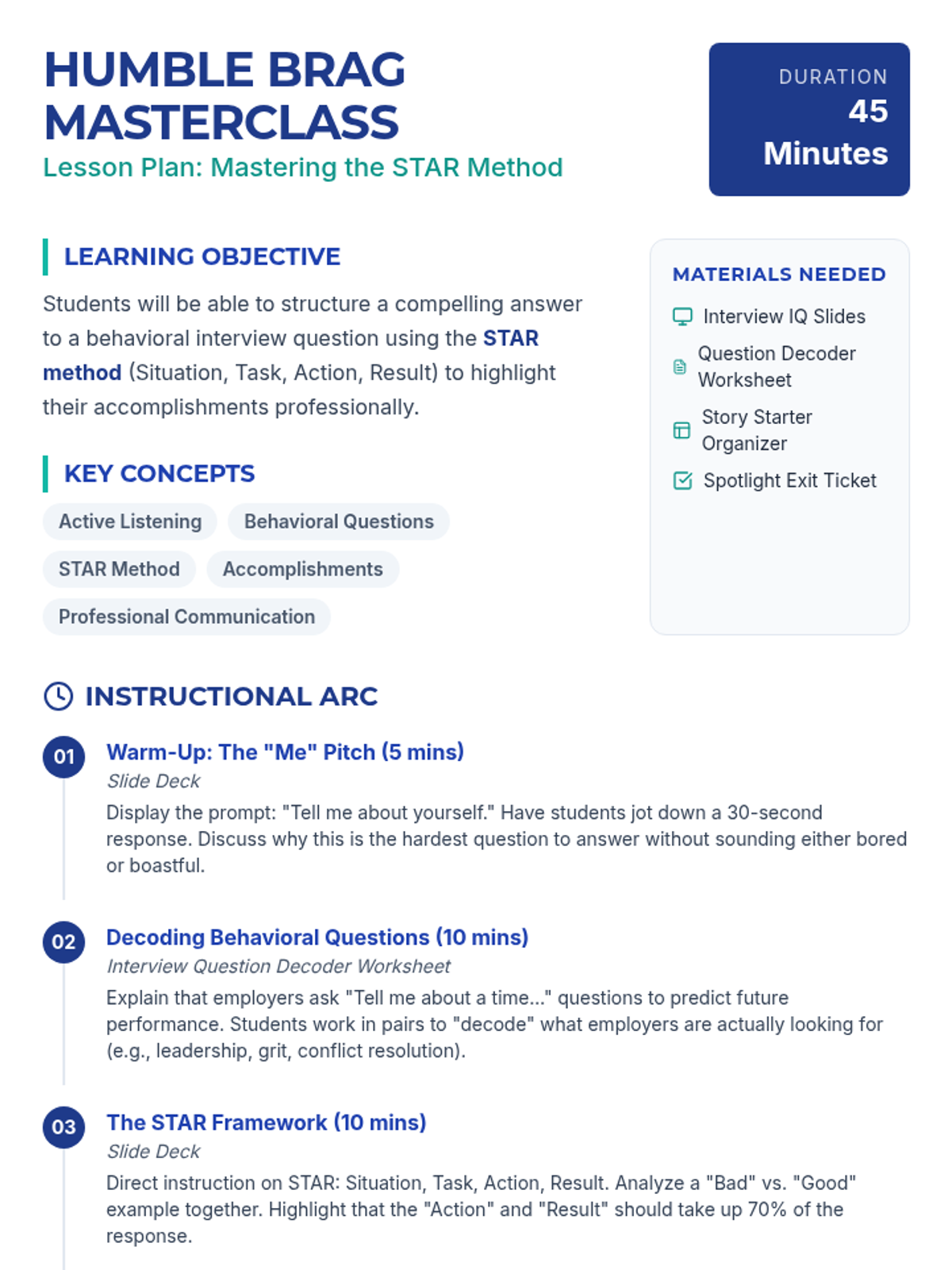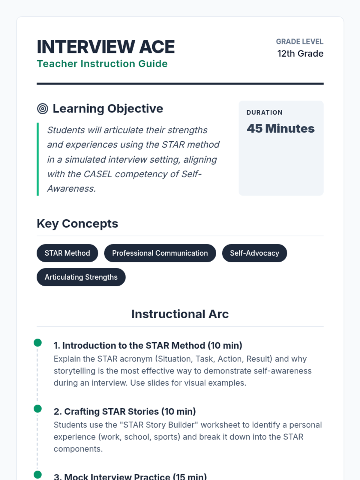 A comprehensive 45-minute lesson for 12th graders focused on mastering the STAR method for professional interviews. Students build self-awareness by identifying their strengths and framing their experiences into compelling narratives.