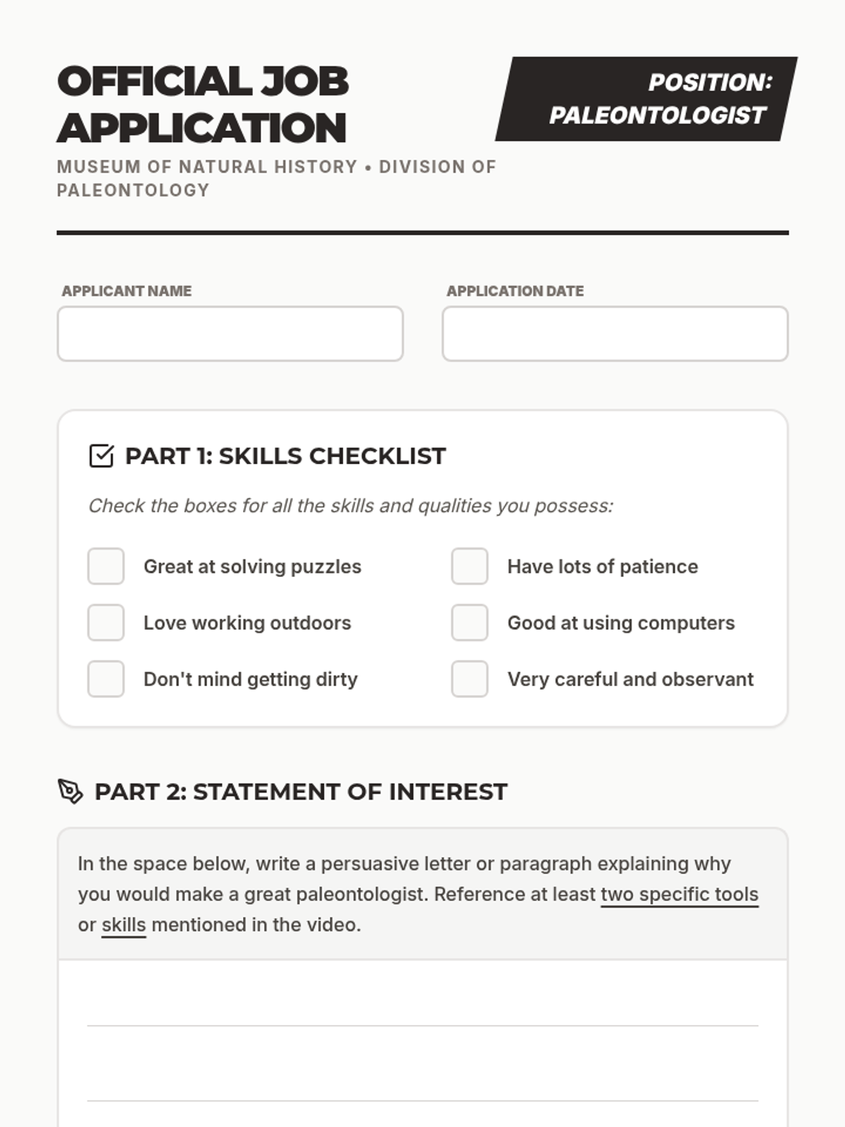Students explore the career of a paleontologist through a video, brainstorming session, and a creative job application activity focused on persuasive writing and scientific traits.