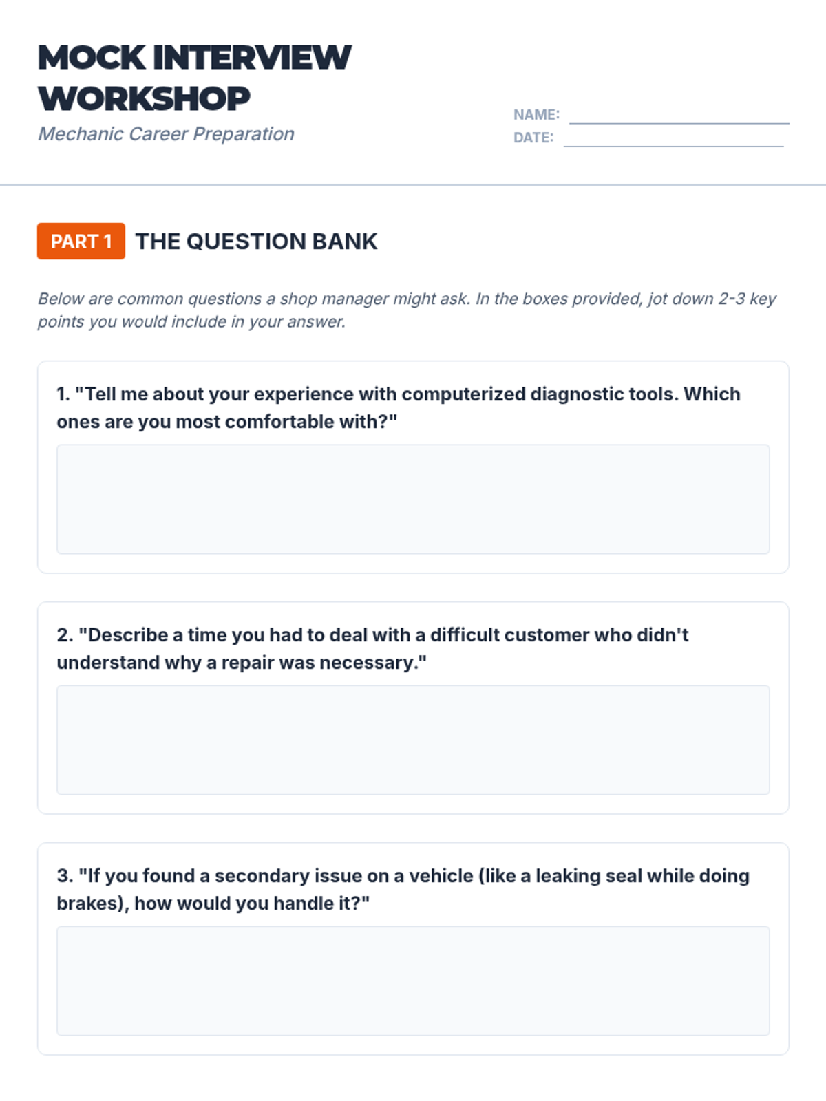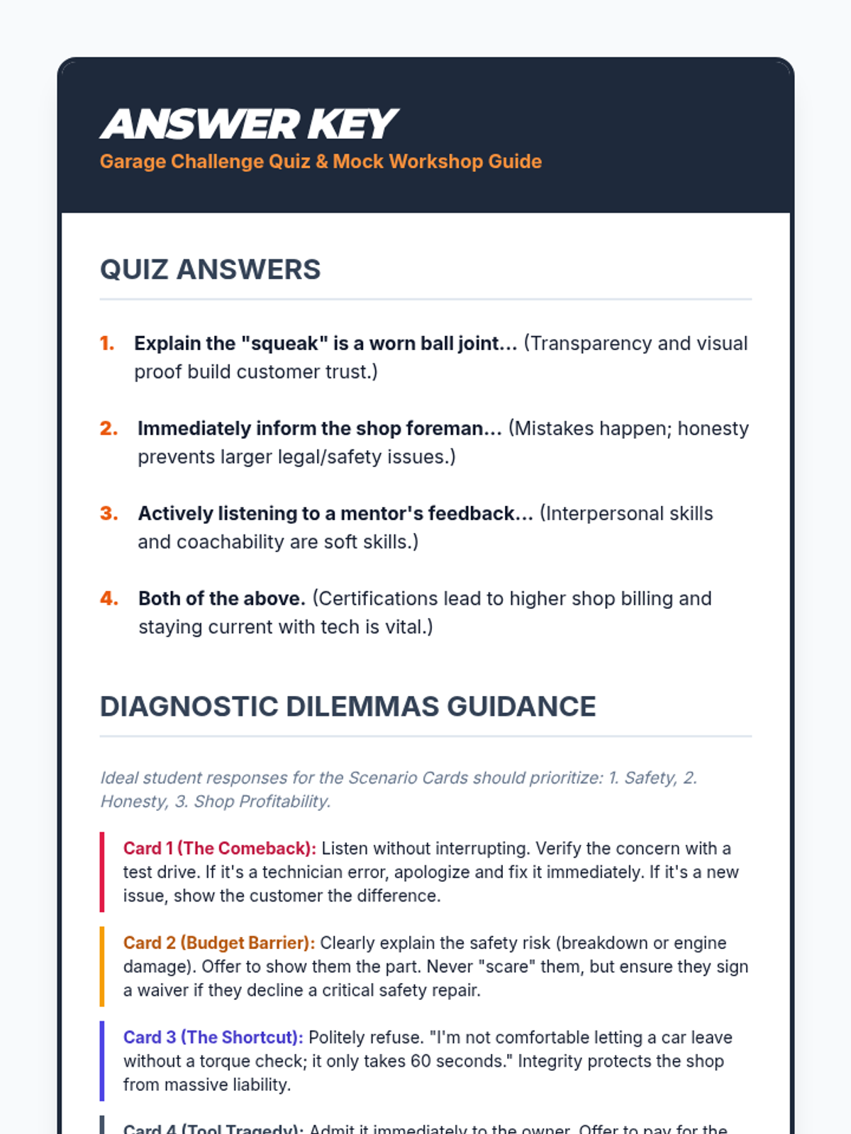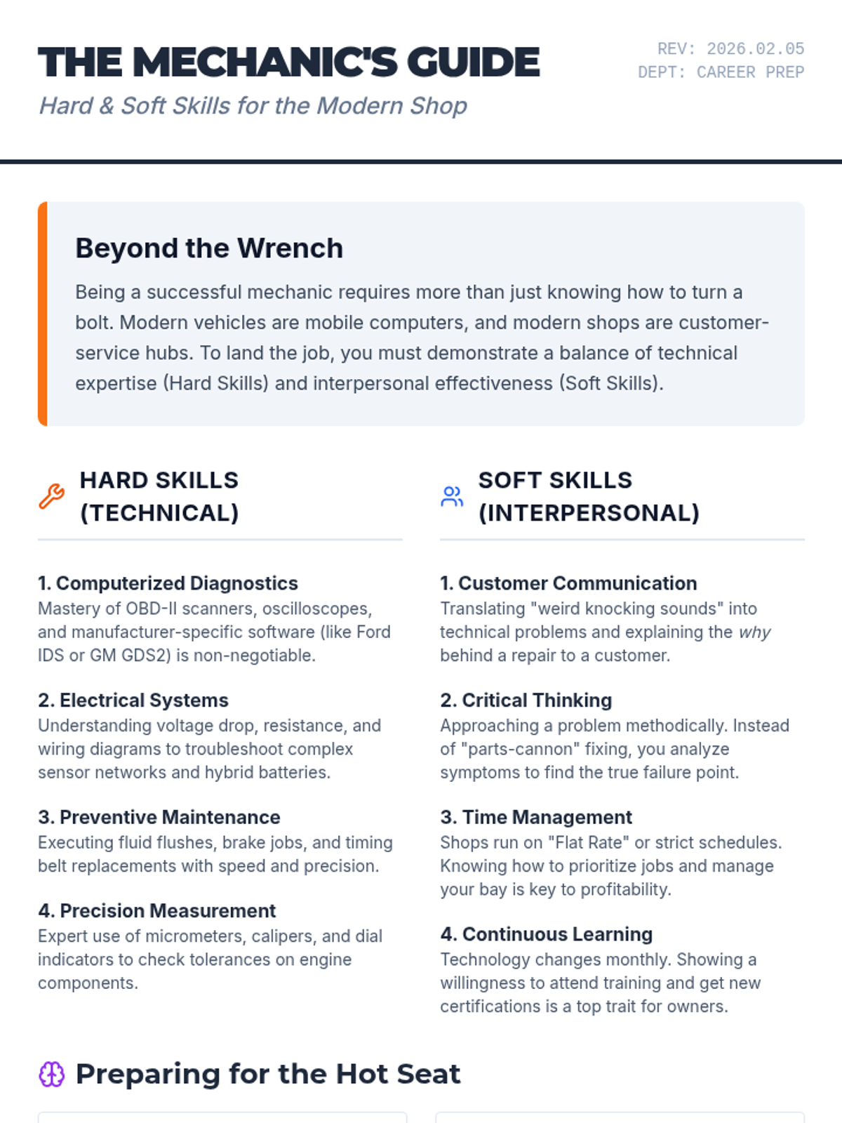This lesson prepares aspiring mechanics for job interviews by covering both hard technical skills and essential soft skills. It includes a comprehensive slide deck, a reading guide, practice worksheets, and a quiz to ensure candidates are ready for the garage.