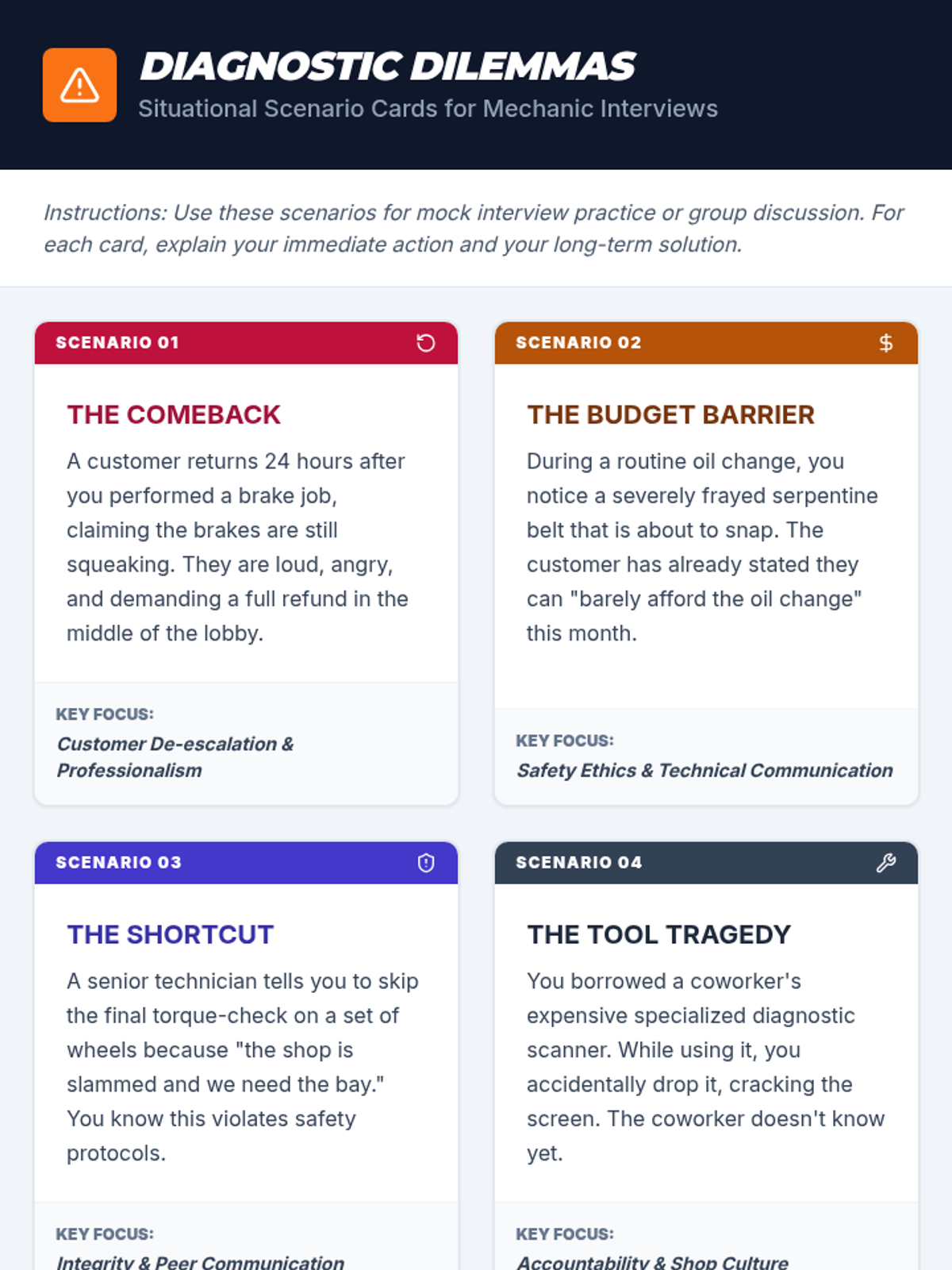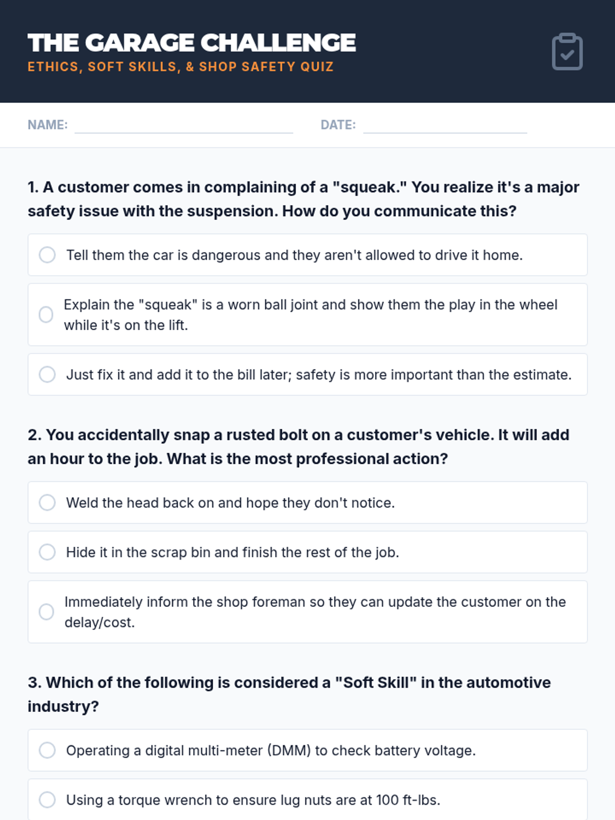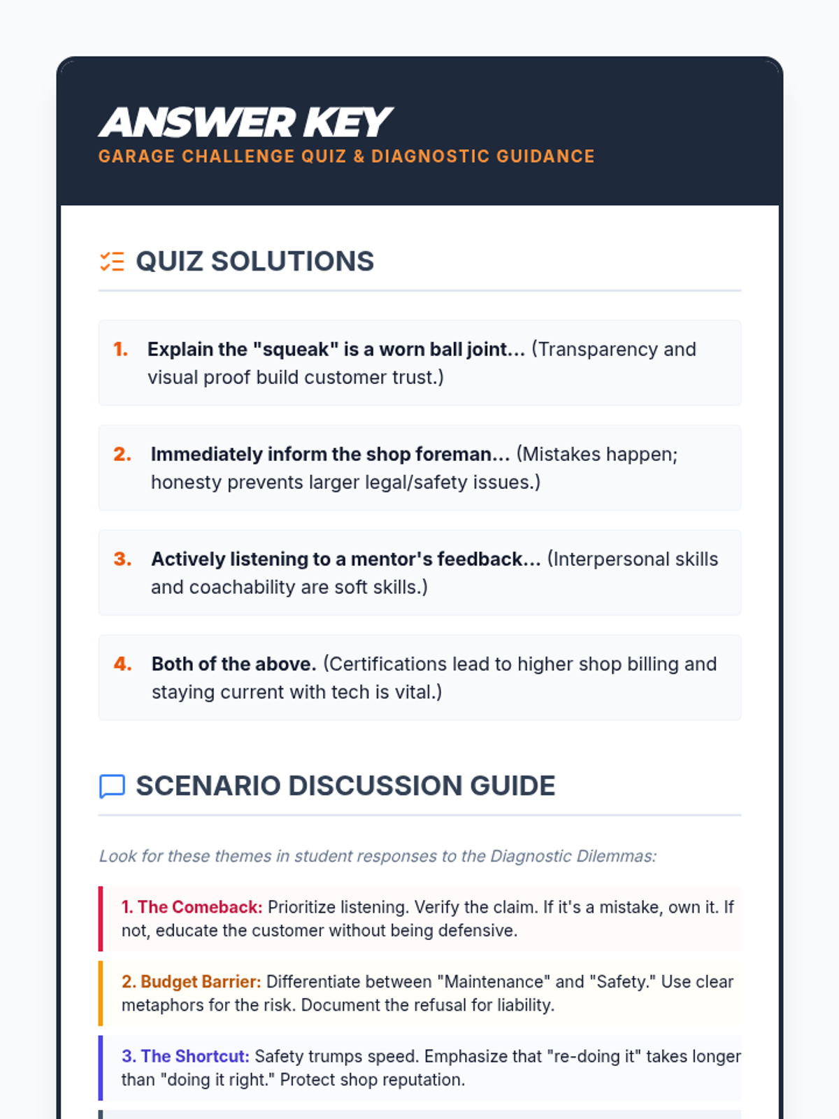 This lesson prepares aspiring mechanics for job interviews by covering both hard technical skills and essential soft skills. It includes a comprehensive slide deck, a reading guide, practice worksheets, and a quiz to ensure candidates are ready for the garage.