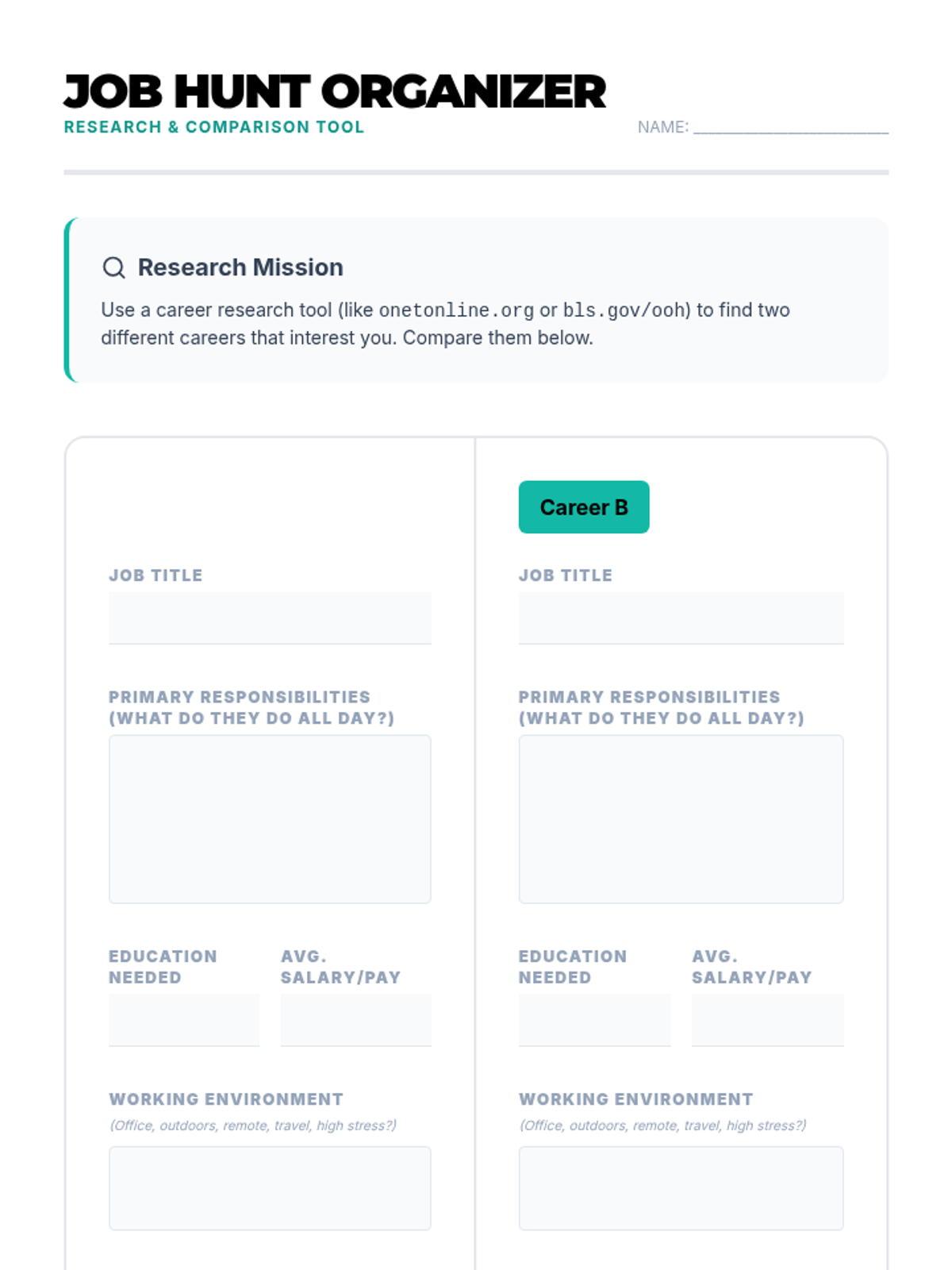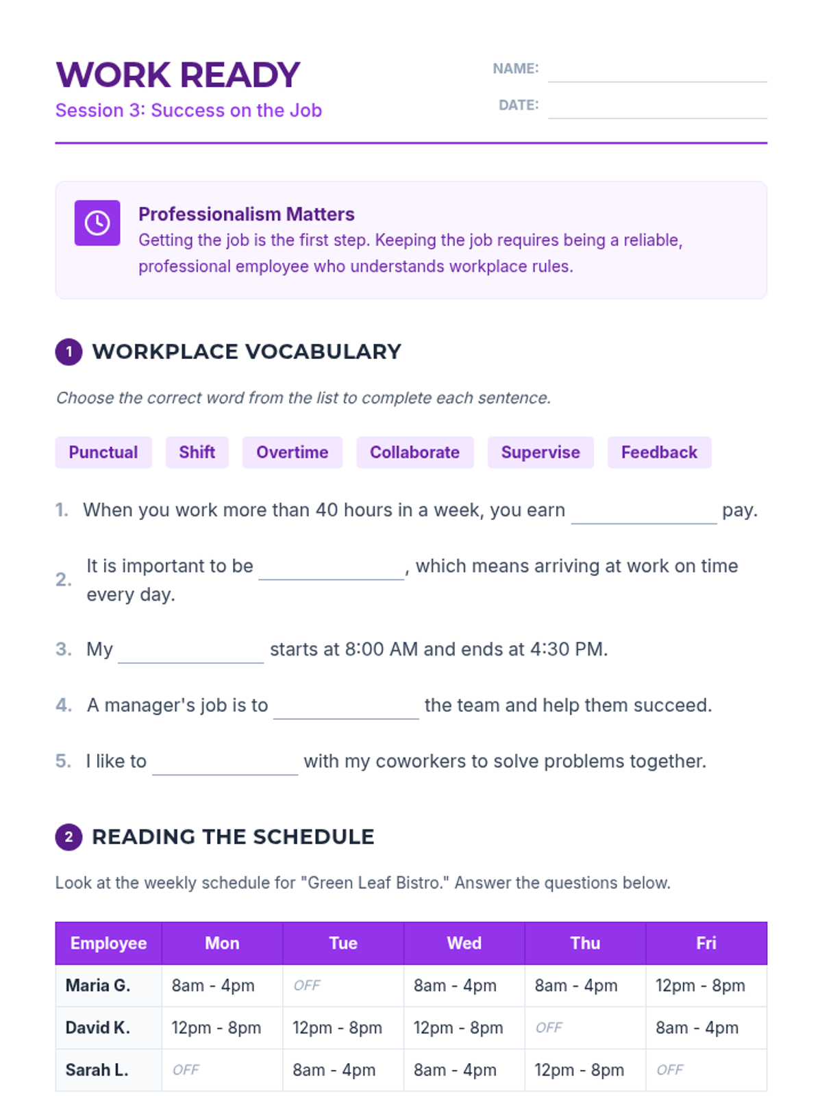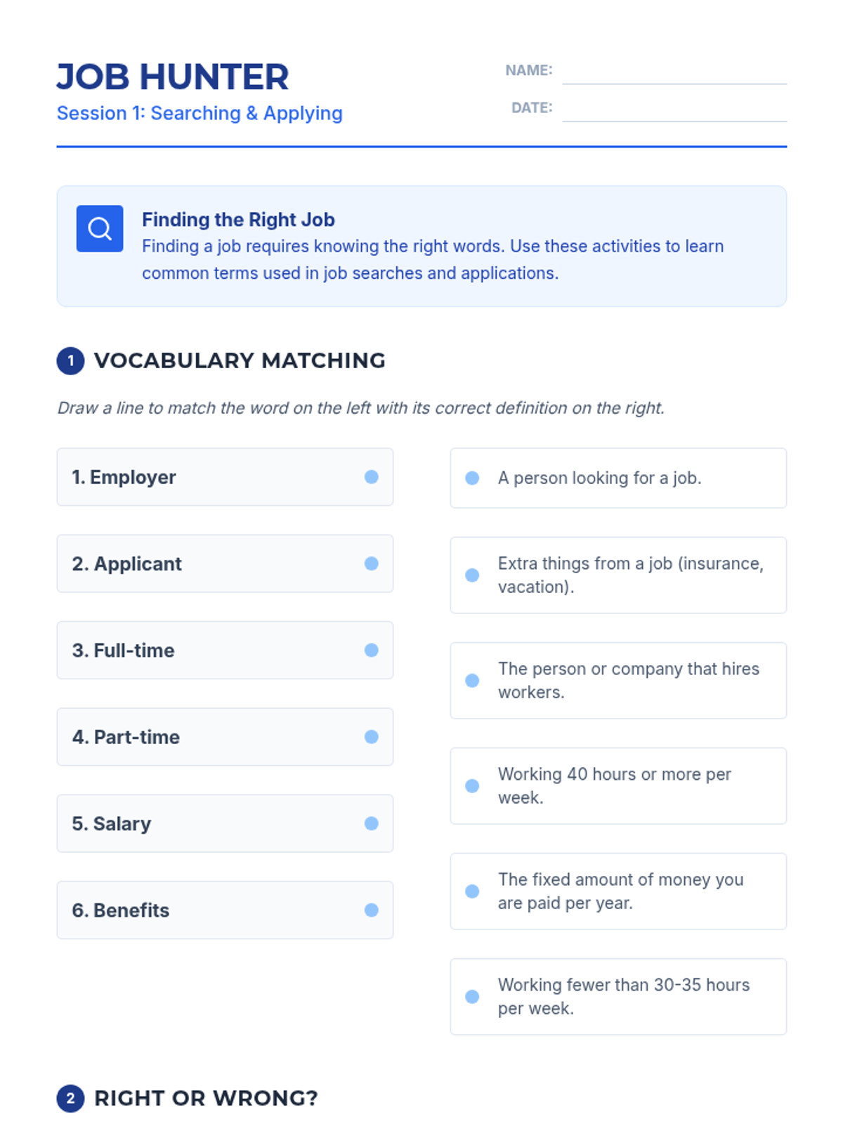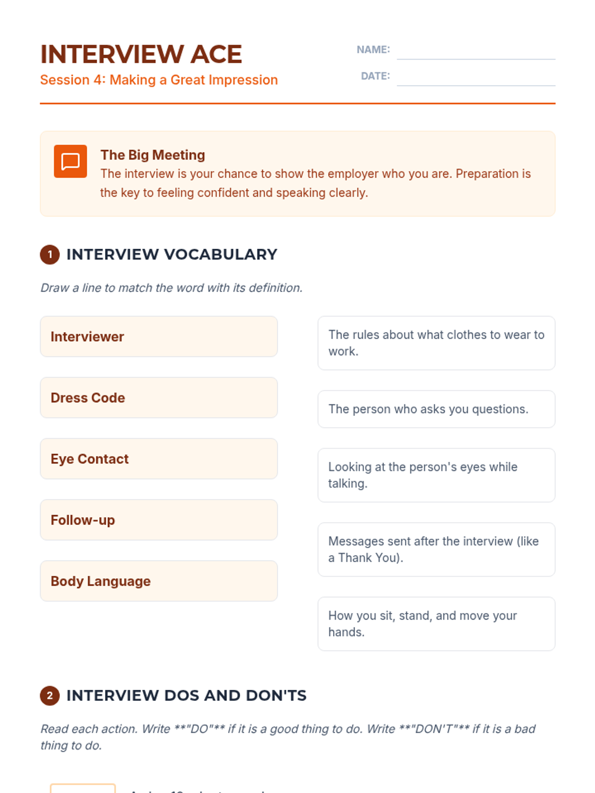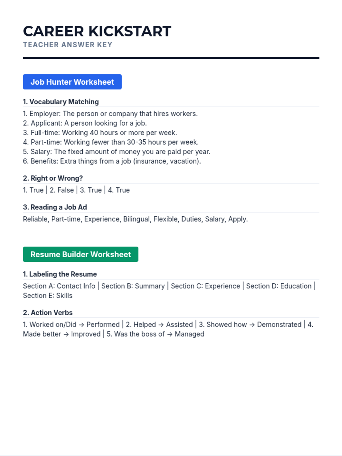 A comprehensive suite of independent worksheets designed for ELL students to master job search vocabulary, resume components, and workplace document literacy. This lesson covers essential skills for transitioning into the workforce with confidence.