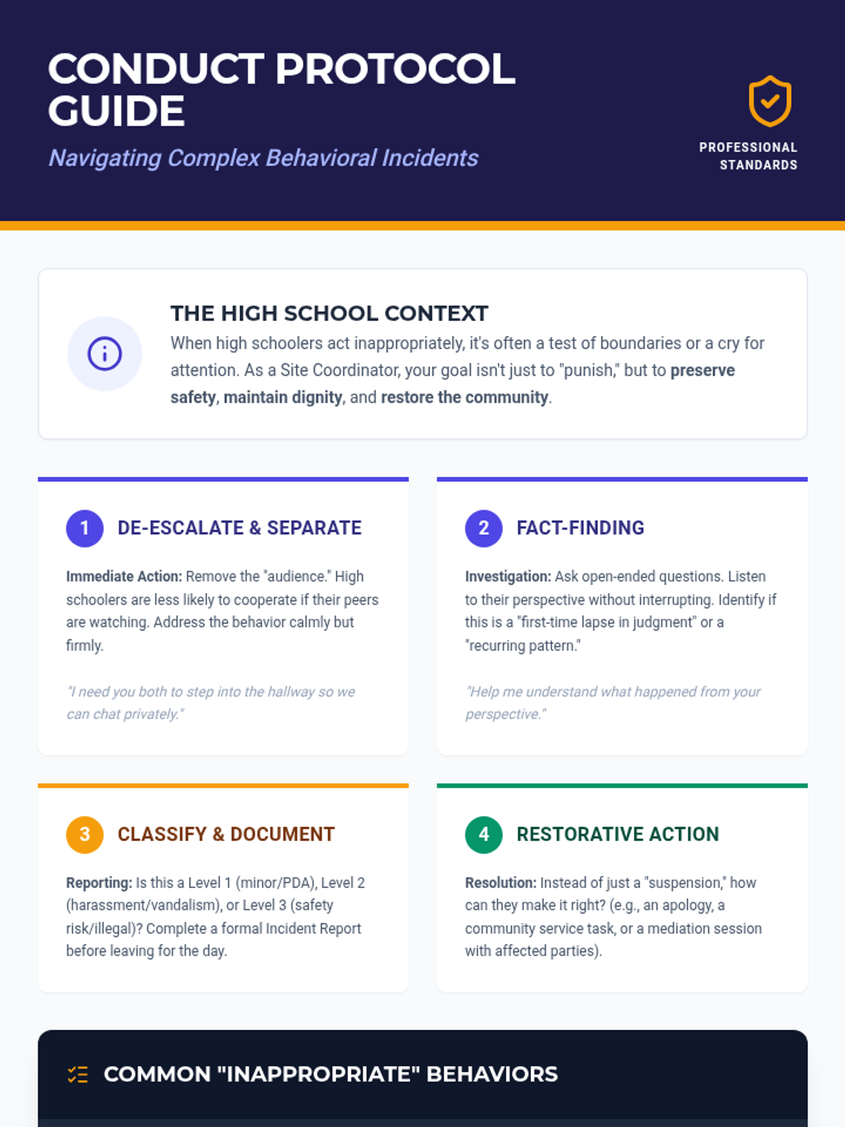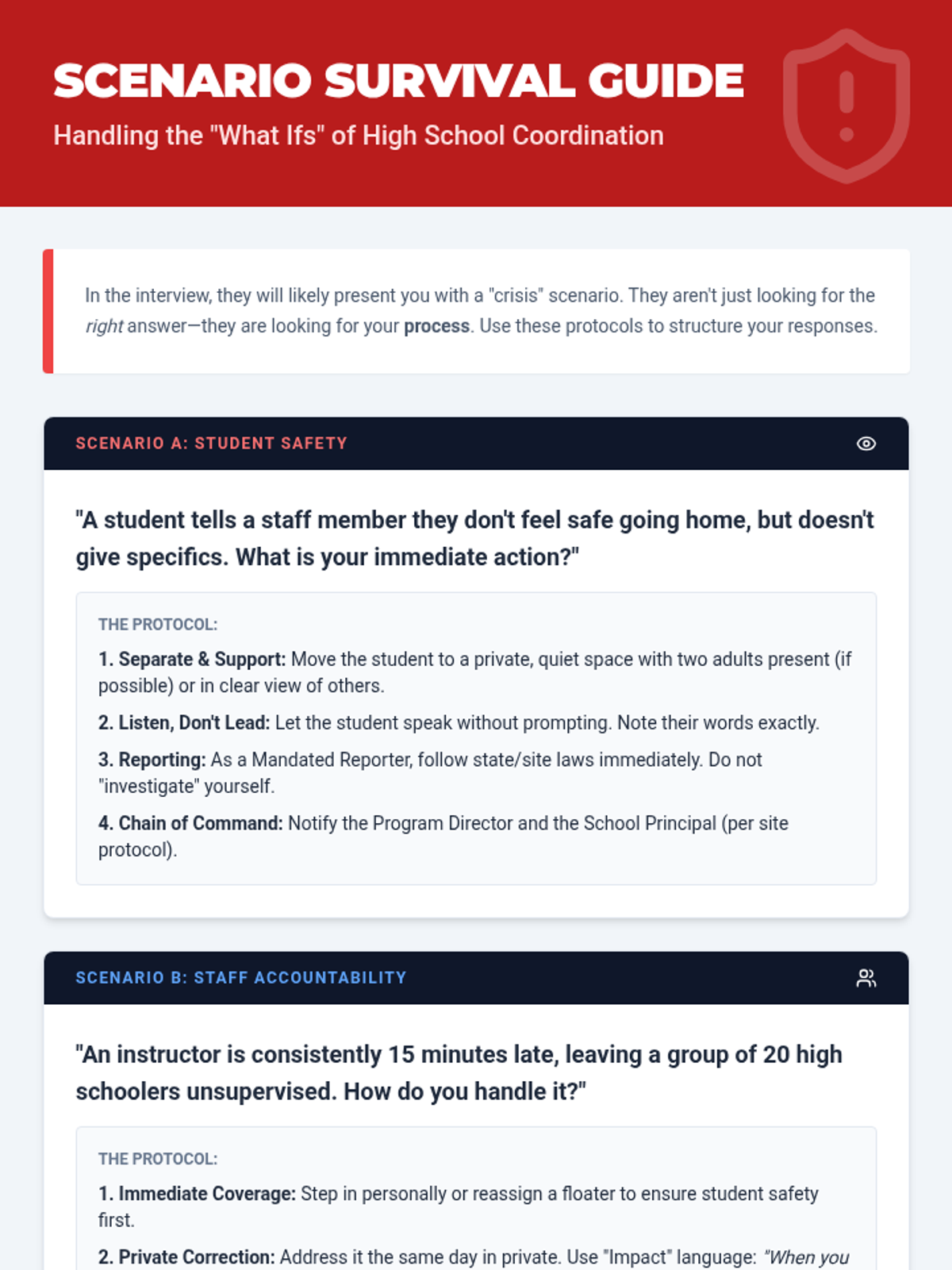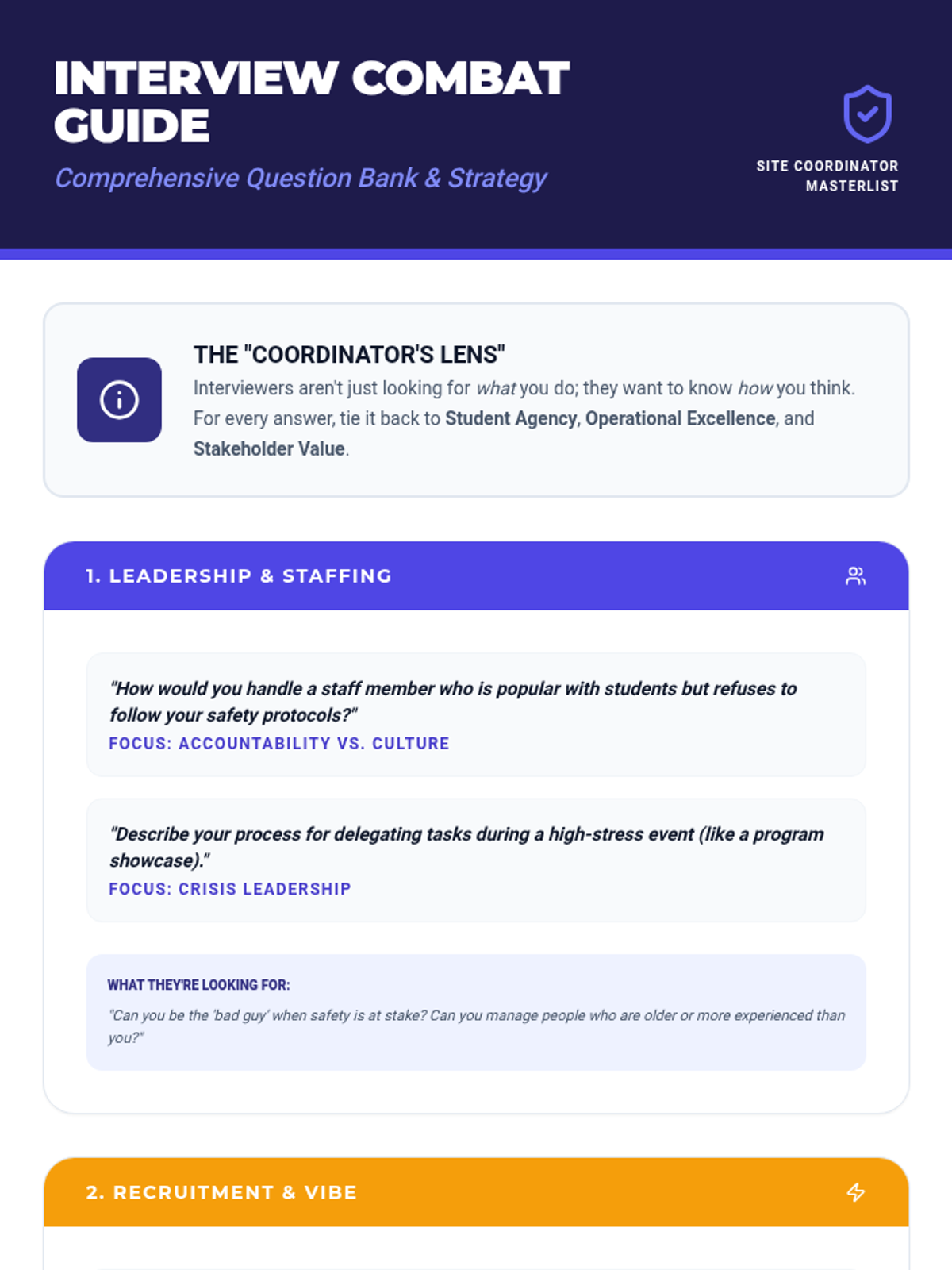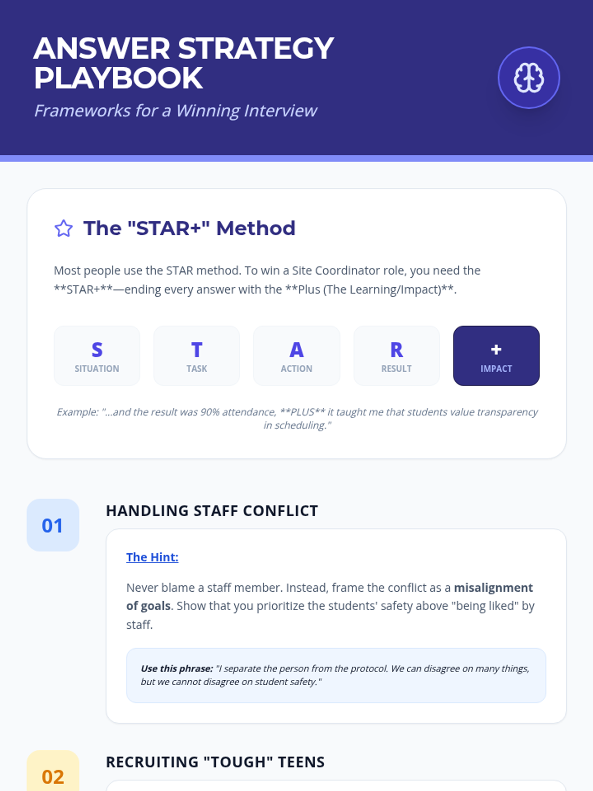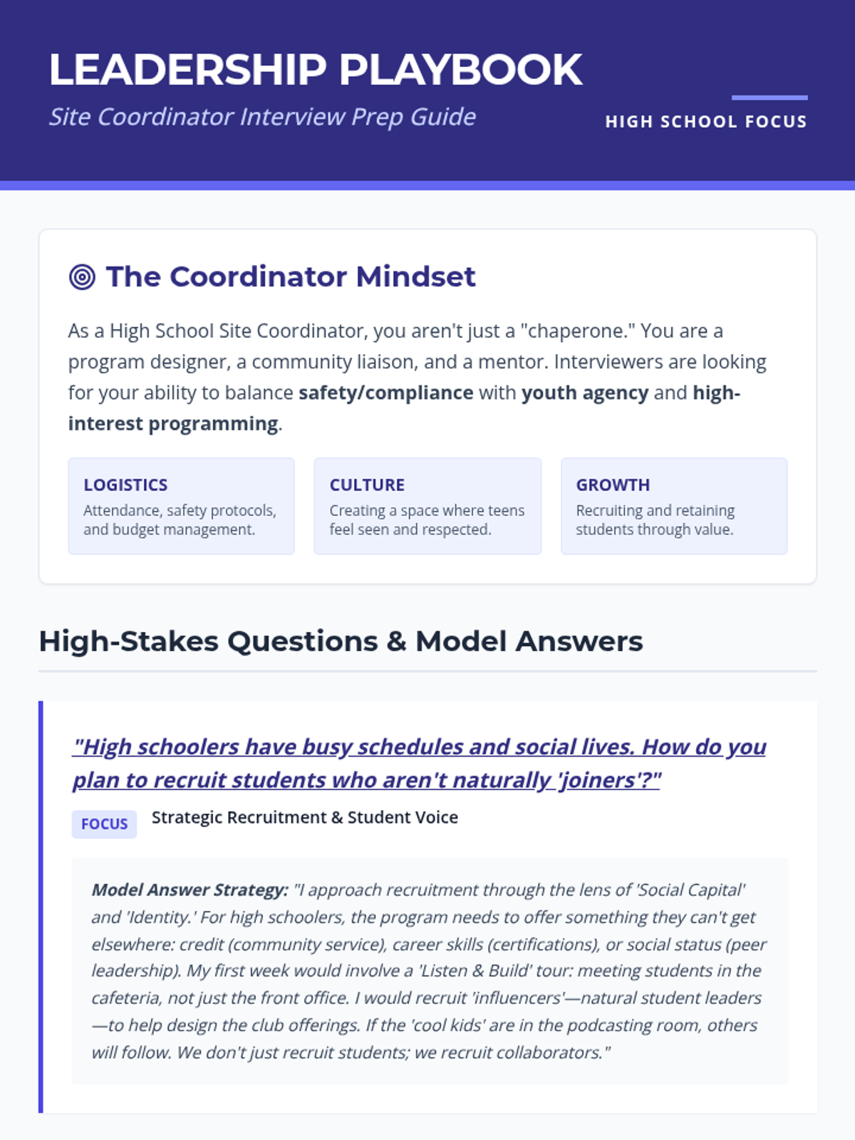 A comprehensive interview preparation package for a High School After-School Site Coordinator role, focusing on leadership, operations, and student recruitment strategies.
