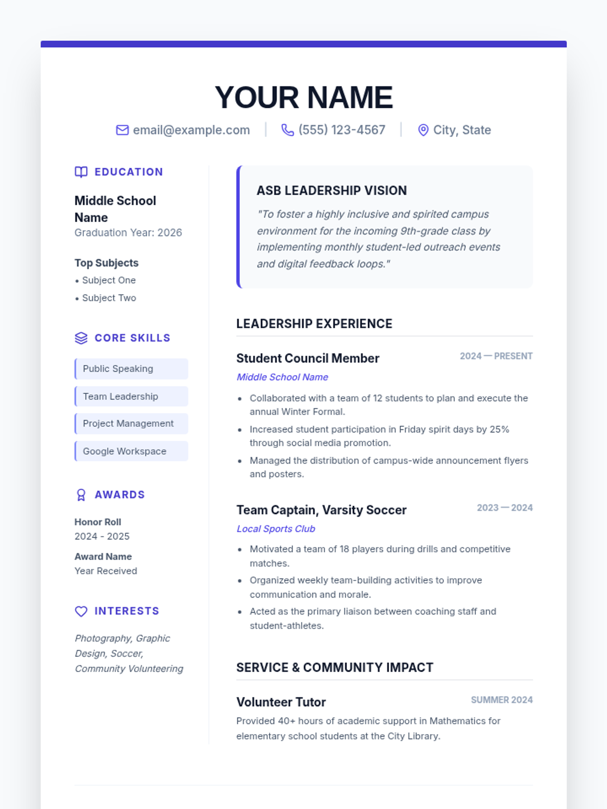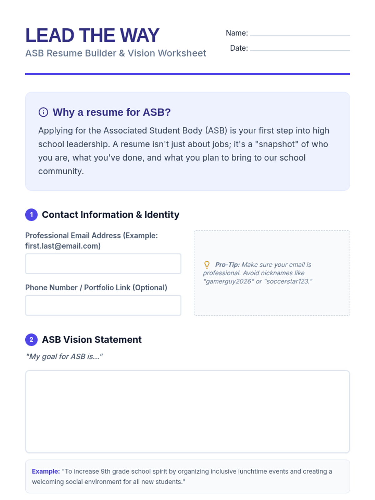 A comprehensive guide and template to help incoming 9th graders craft their first professional resume specifically for ASB applications, focusing on leadership, service, and vision.