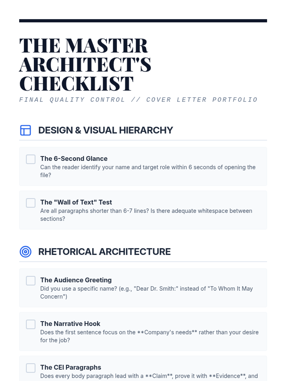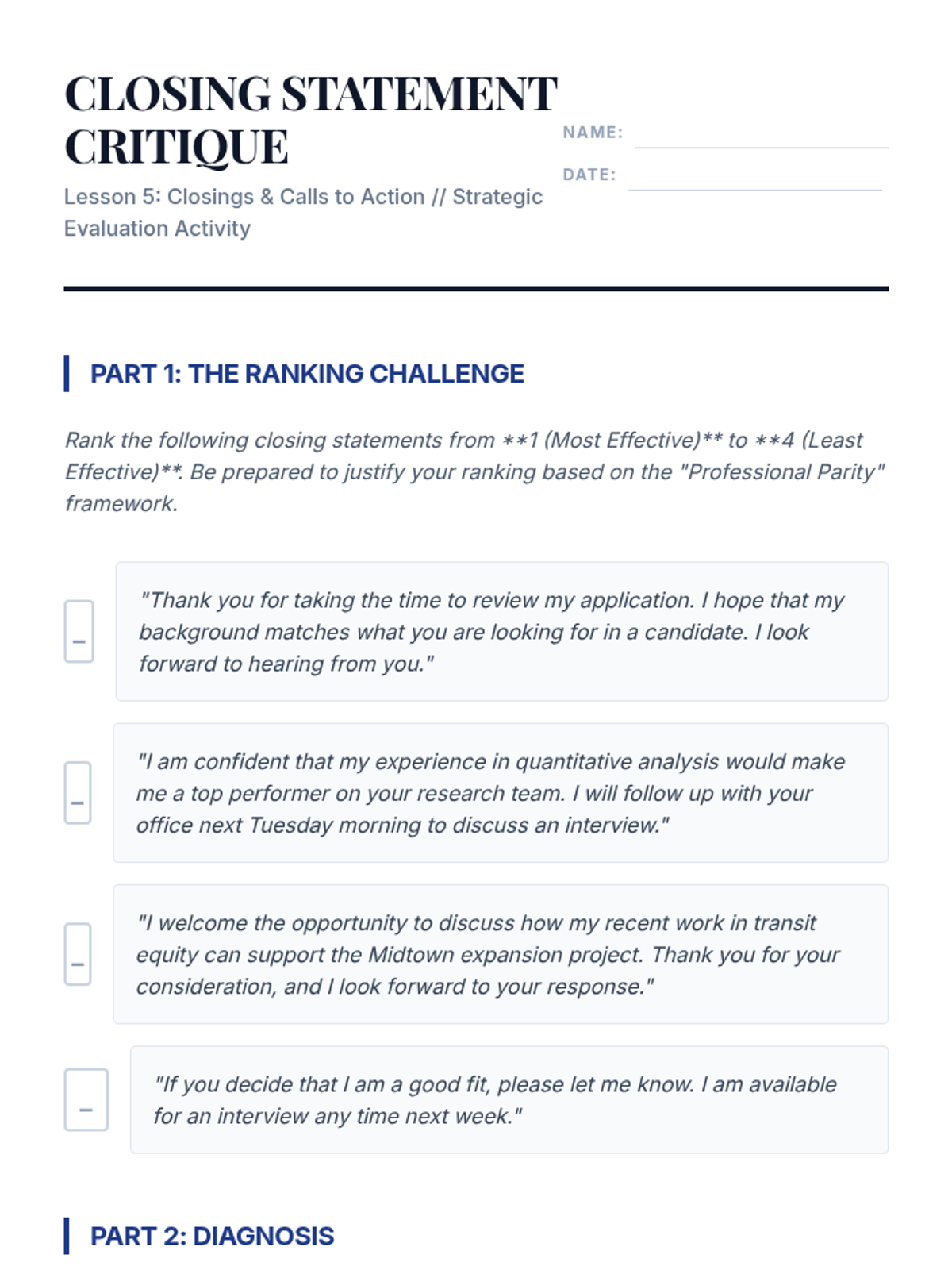 Focuses on the structural integrity and logical progression of the cover letter. Students use reverse outlining and paragraph reassembly to ensure their narrative flows effectively.