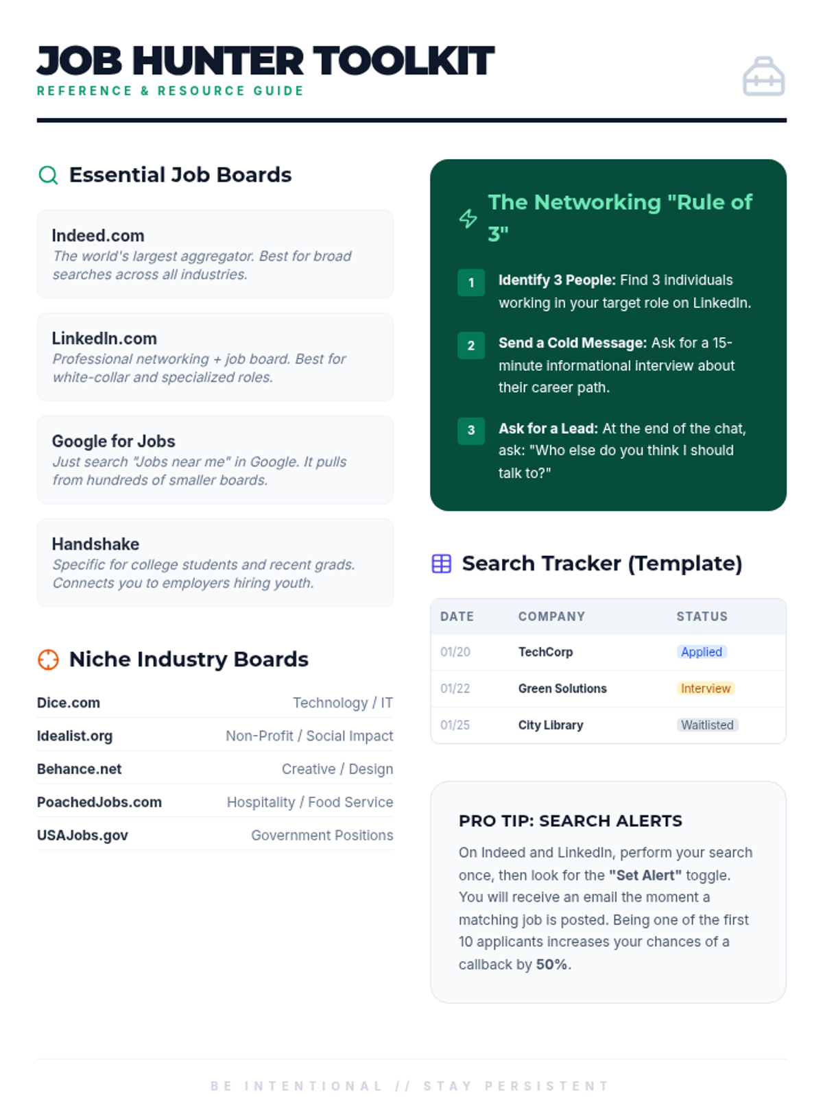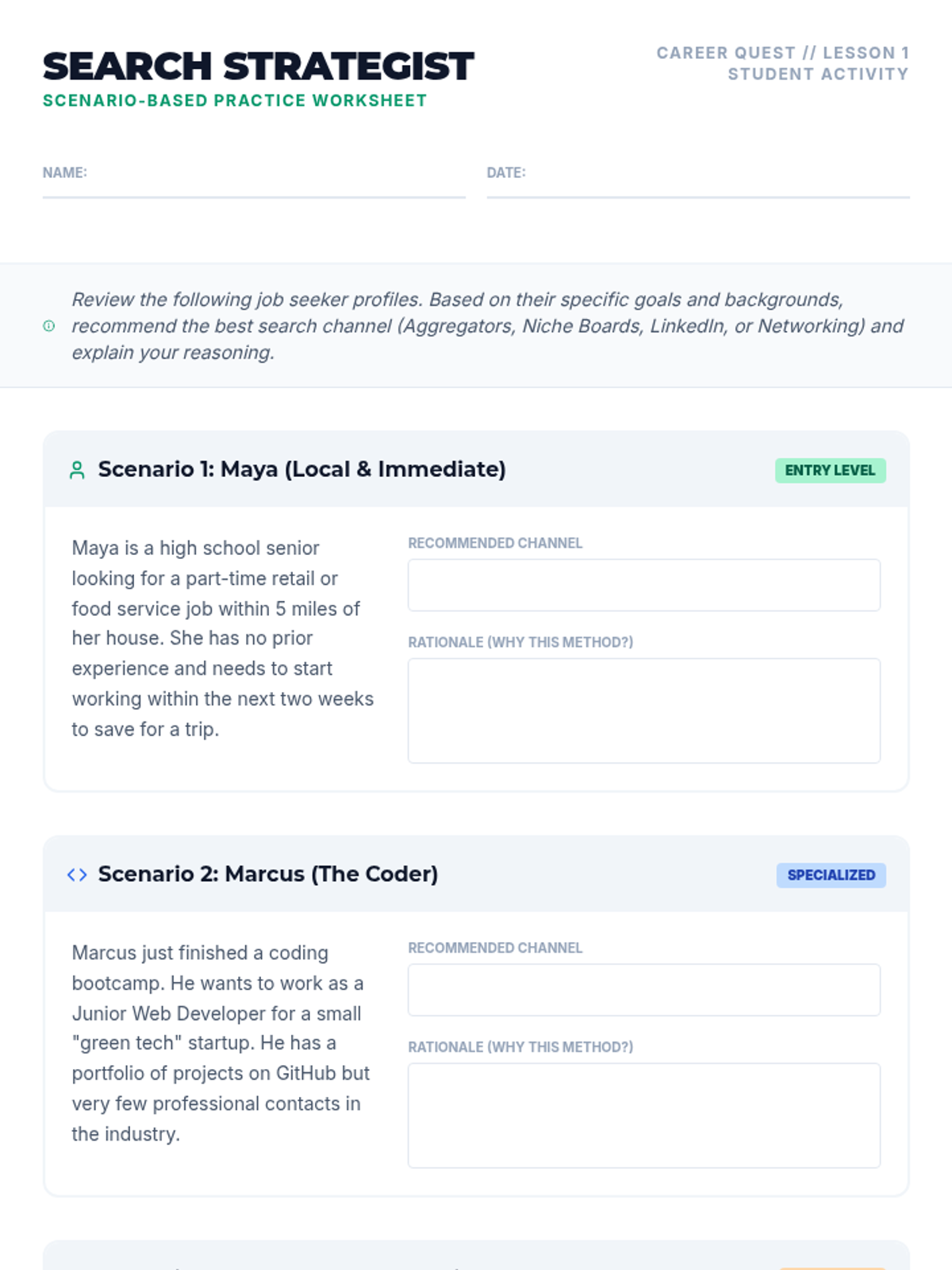 A comprehensive lesson on modern job search strategies, including online resources, networking techniques, and scenario-based practice to help students navigate the job market effectively.