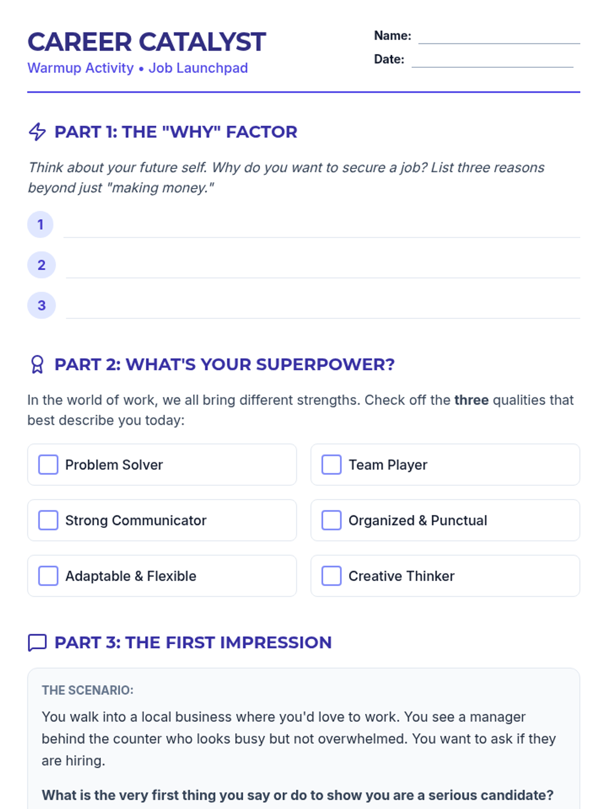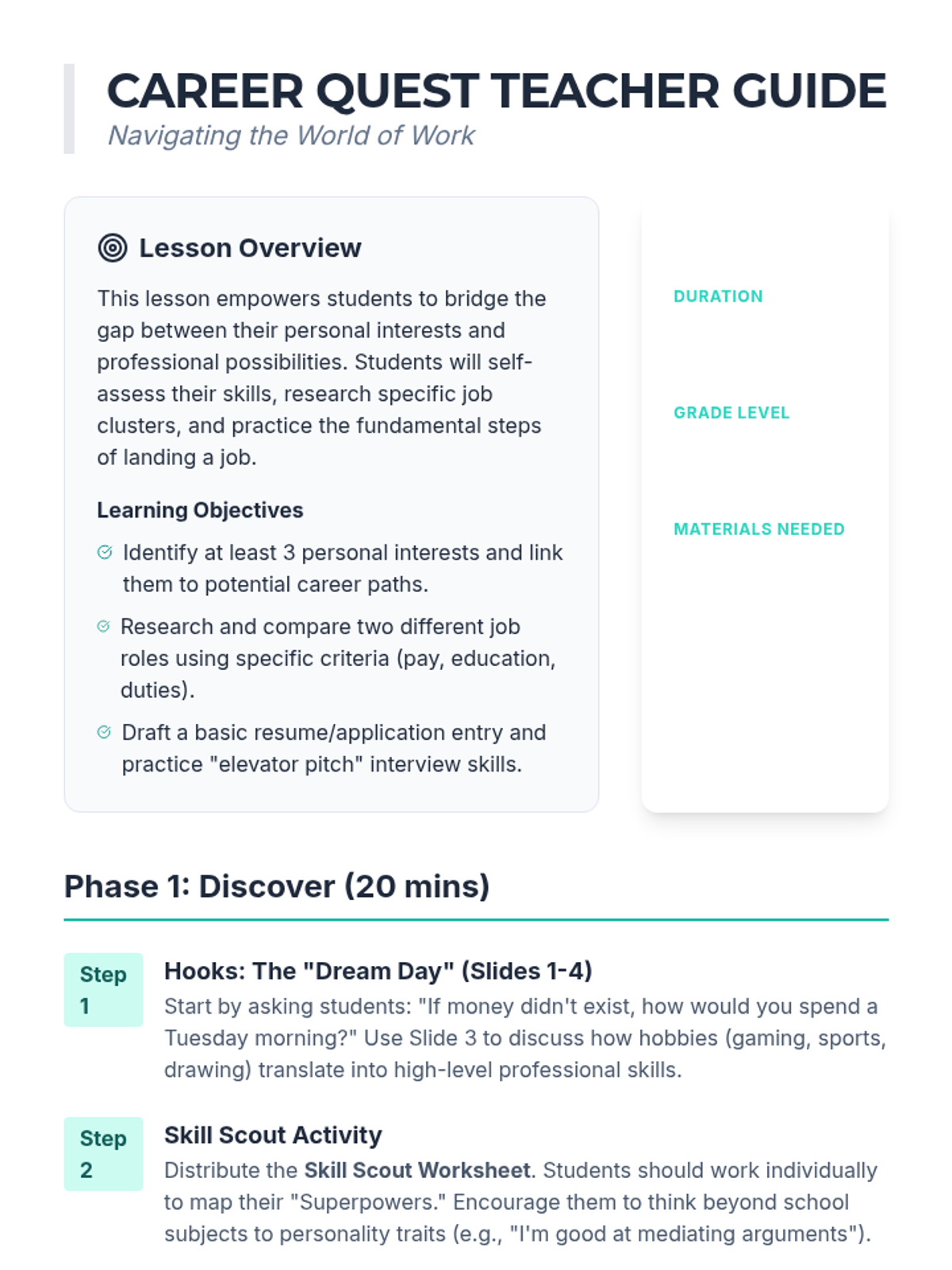 A comprehensive lesson designed to help students discover their strengths, research diverse career paths, and master basic job application and interview techniques through interactive research and role-play.