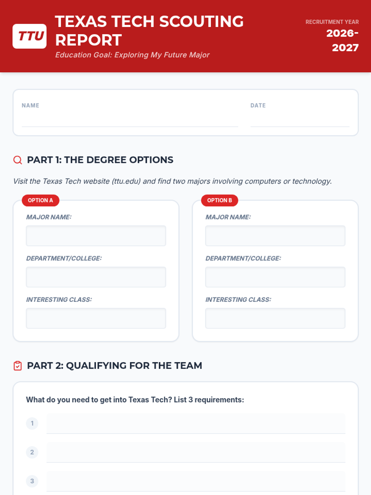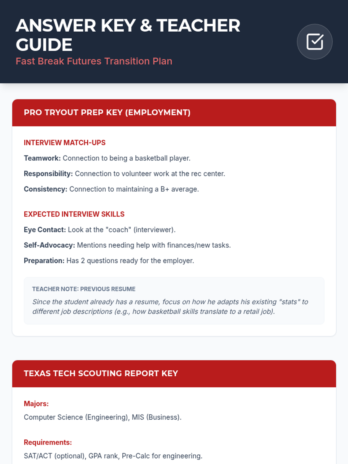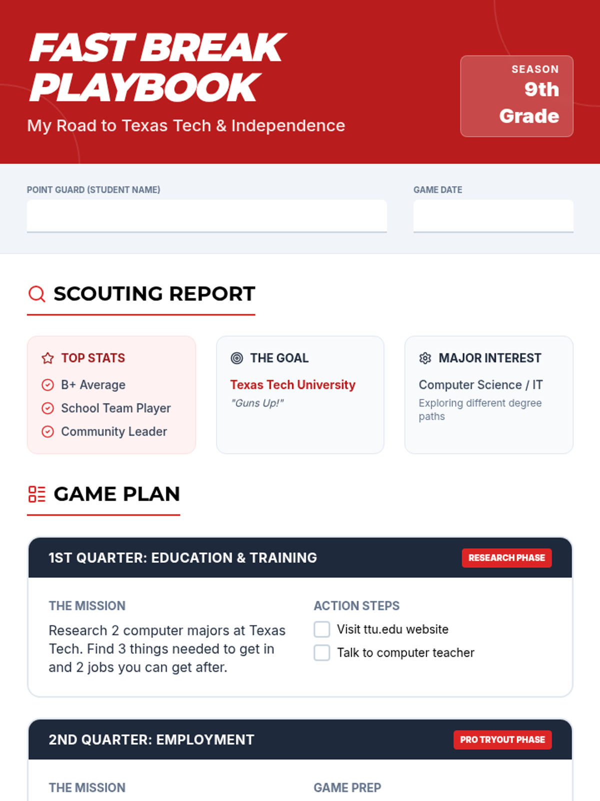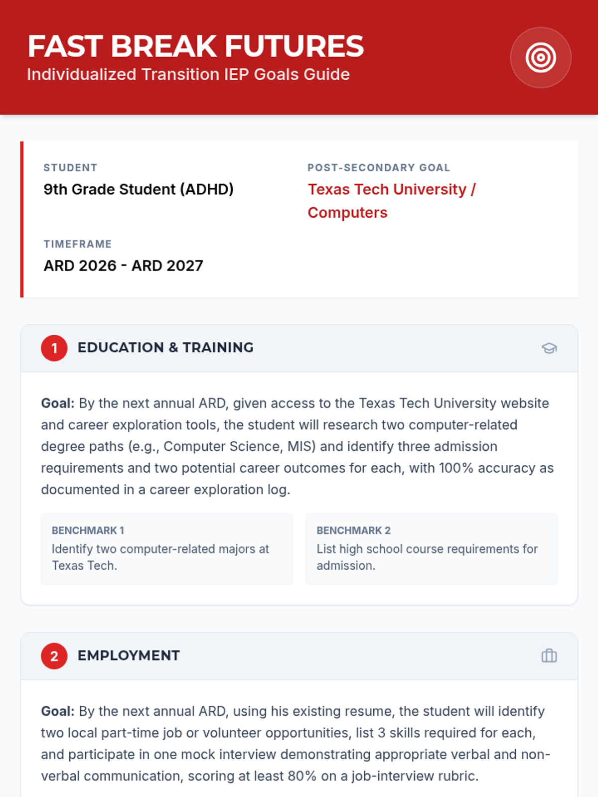 A comprehensive set of transition IEP goals and student-facing planning tools for a 9th-grade student with ADHD who is focused on college and community involvement. This lesson includes formal goal documentation and a student-friendly 'Playbook' for tracking progress towards Texas Tech and future independence.