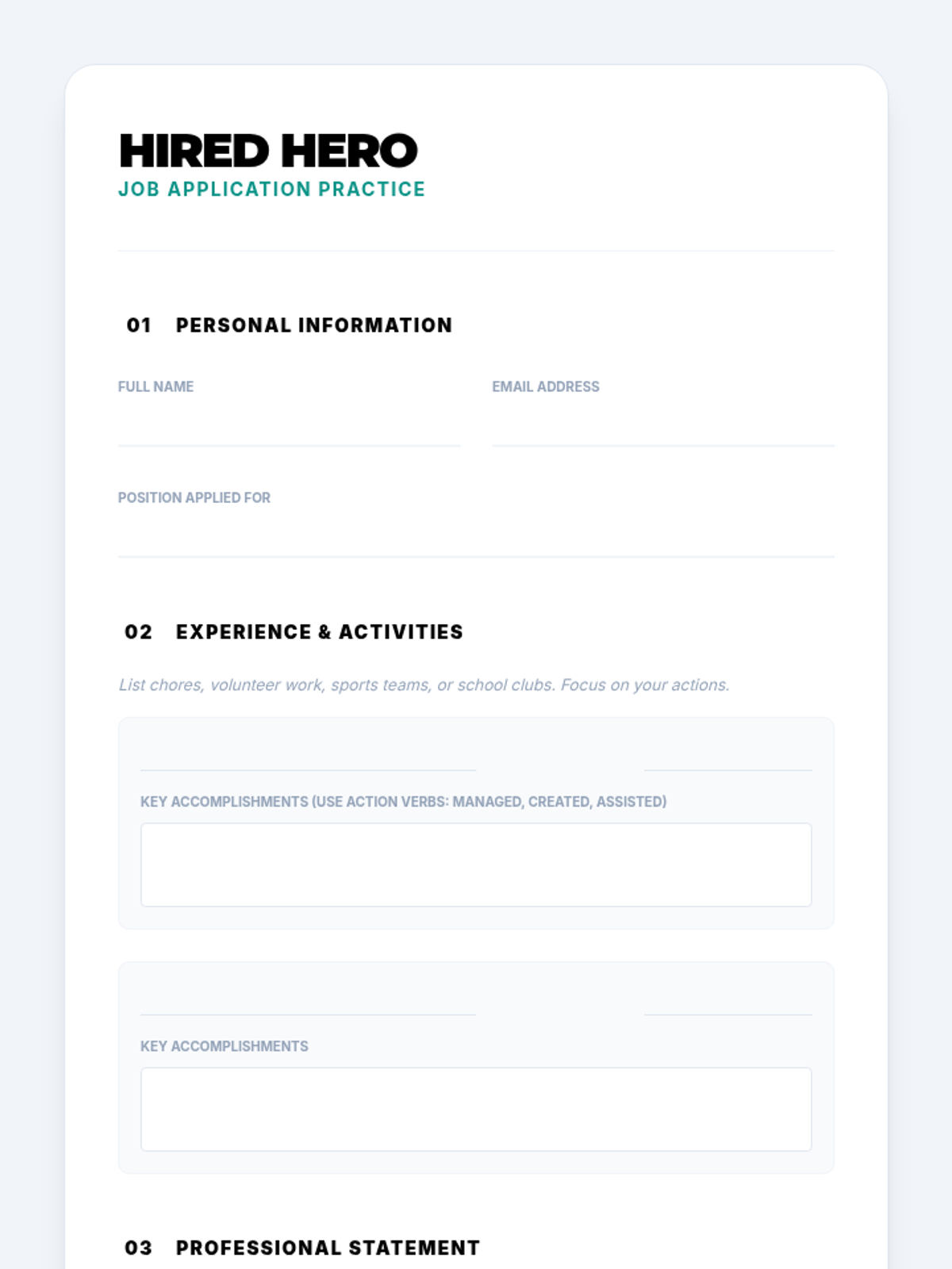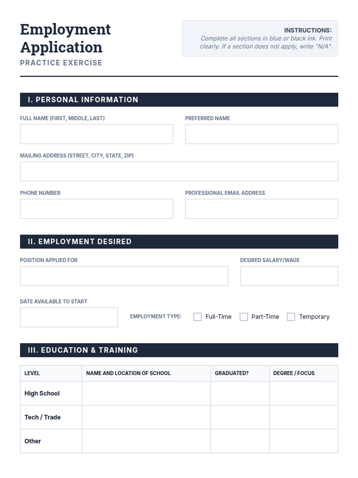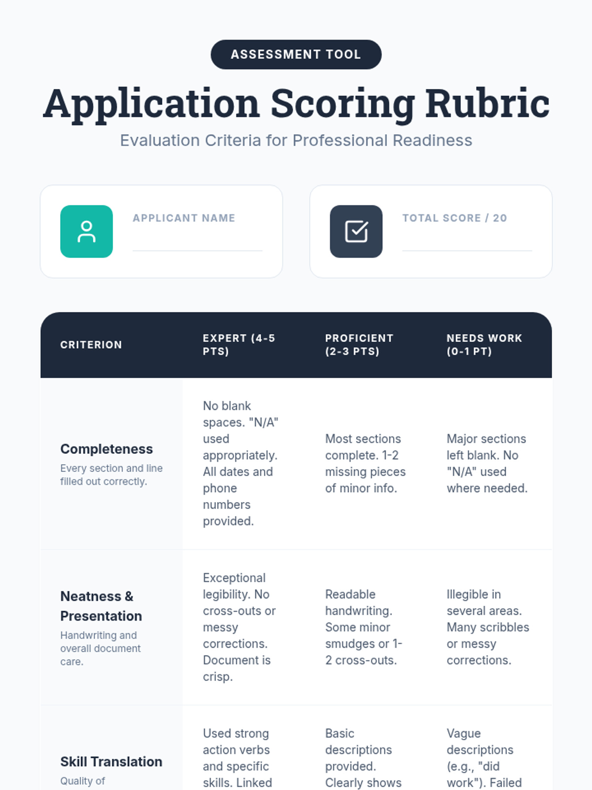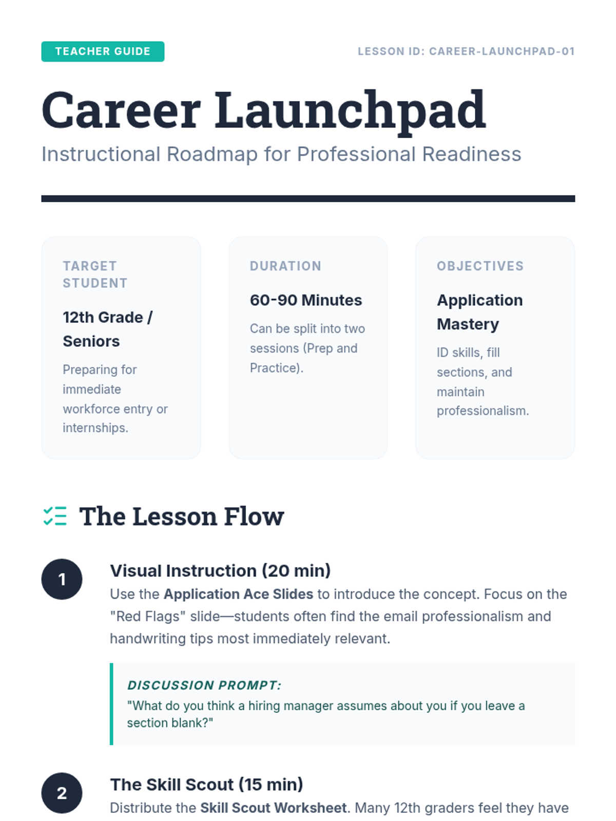 This lesson prepares 12th-grade students for the workforce by teaching them how to identify their professional skills and accurately complete a standard job application. Students will move from self-reflection to practical application with a focus on professionalism and attention to detail.