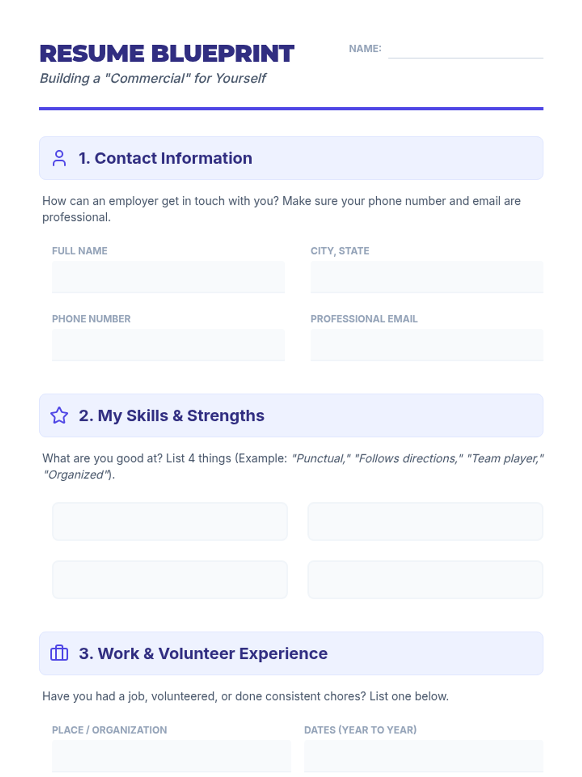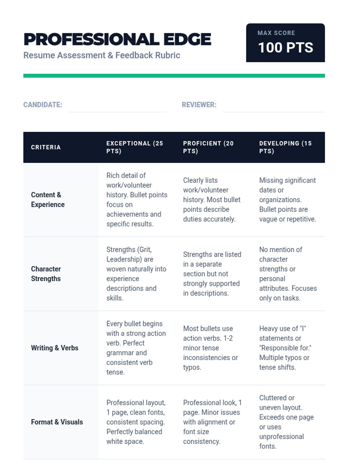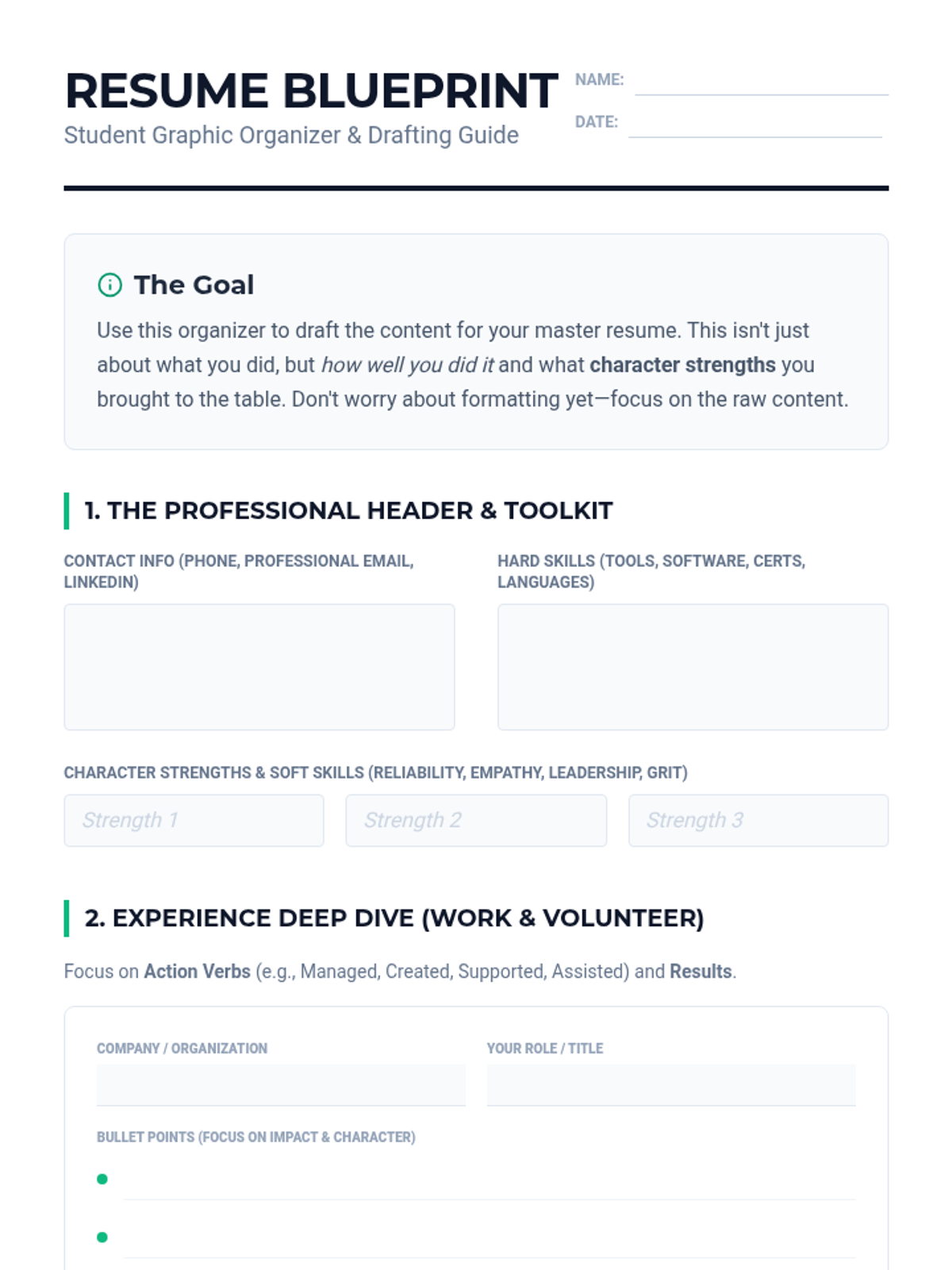 An intensive 85-minute session for high school seniors to craft a professional, strength-based resume that showcases their work history, volunteerism, and personal character.