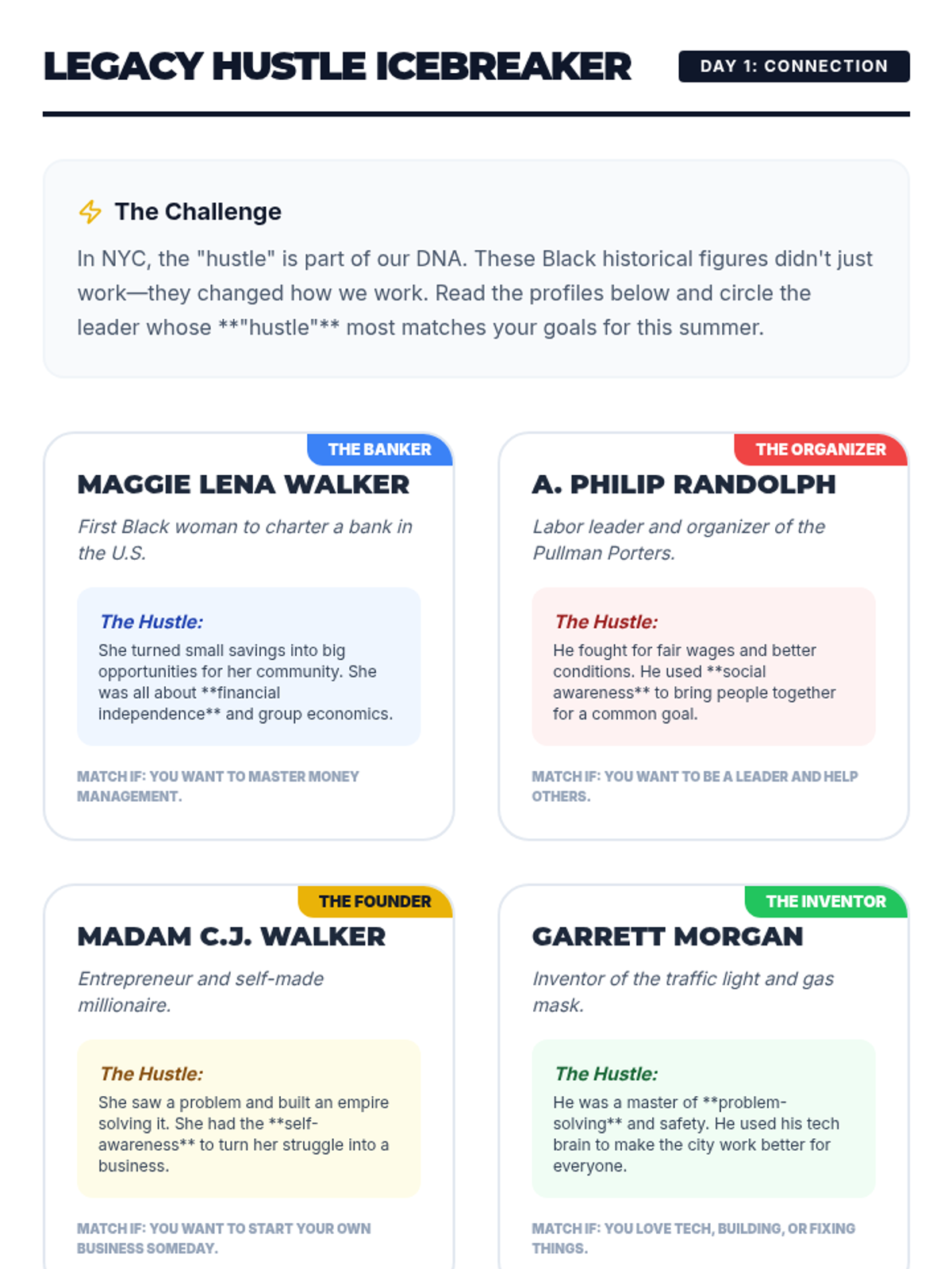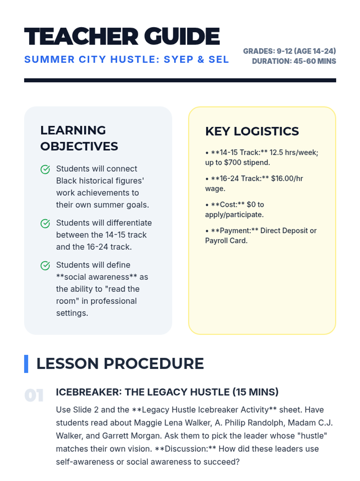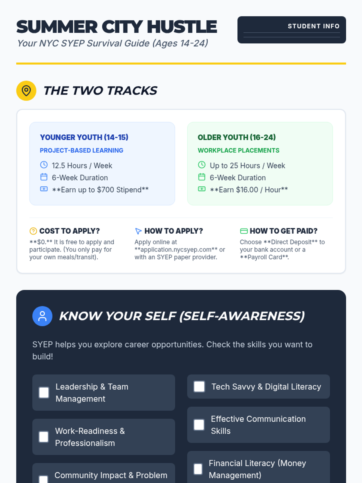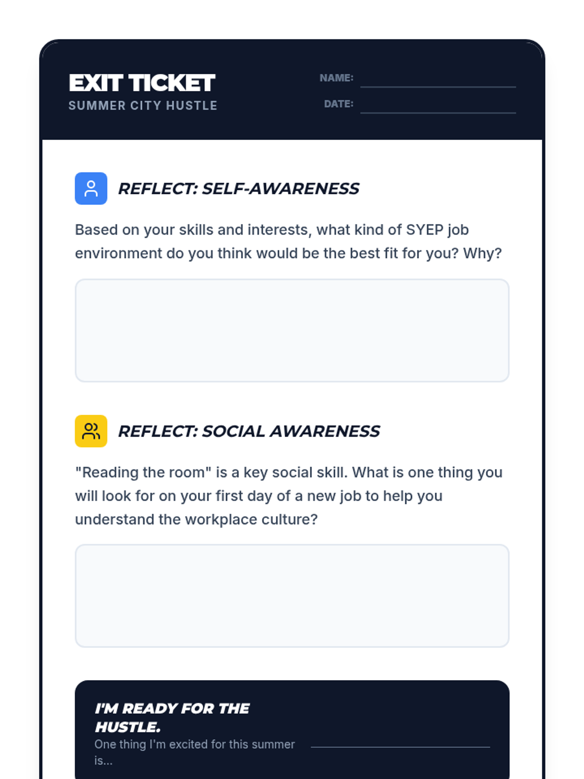 This lesson introduces 14-year-olds to the NYC Summer Youth Employment Program (SYEP), focusing on how self-awareness and social awareness help teens find the right fit and succeed in their first professional experience.