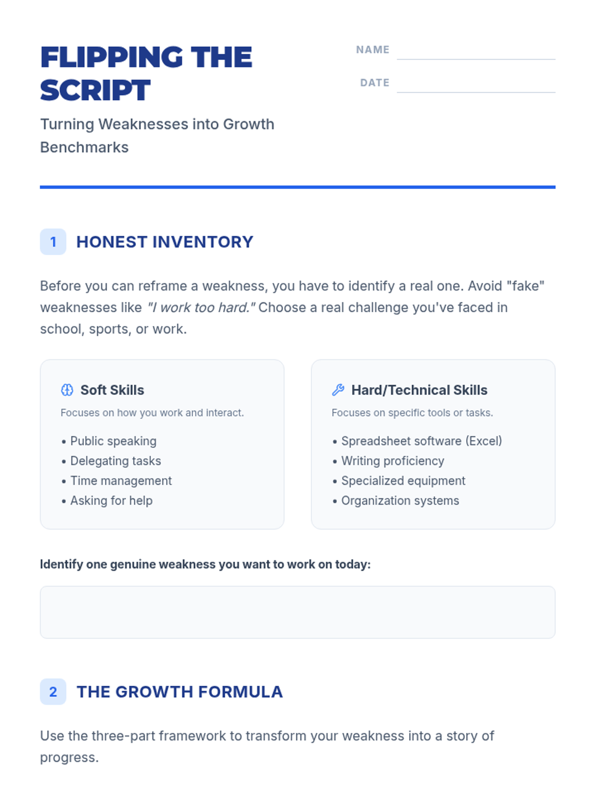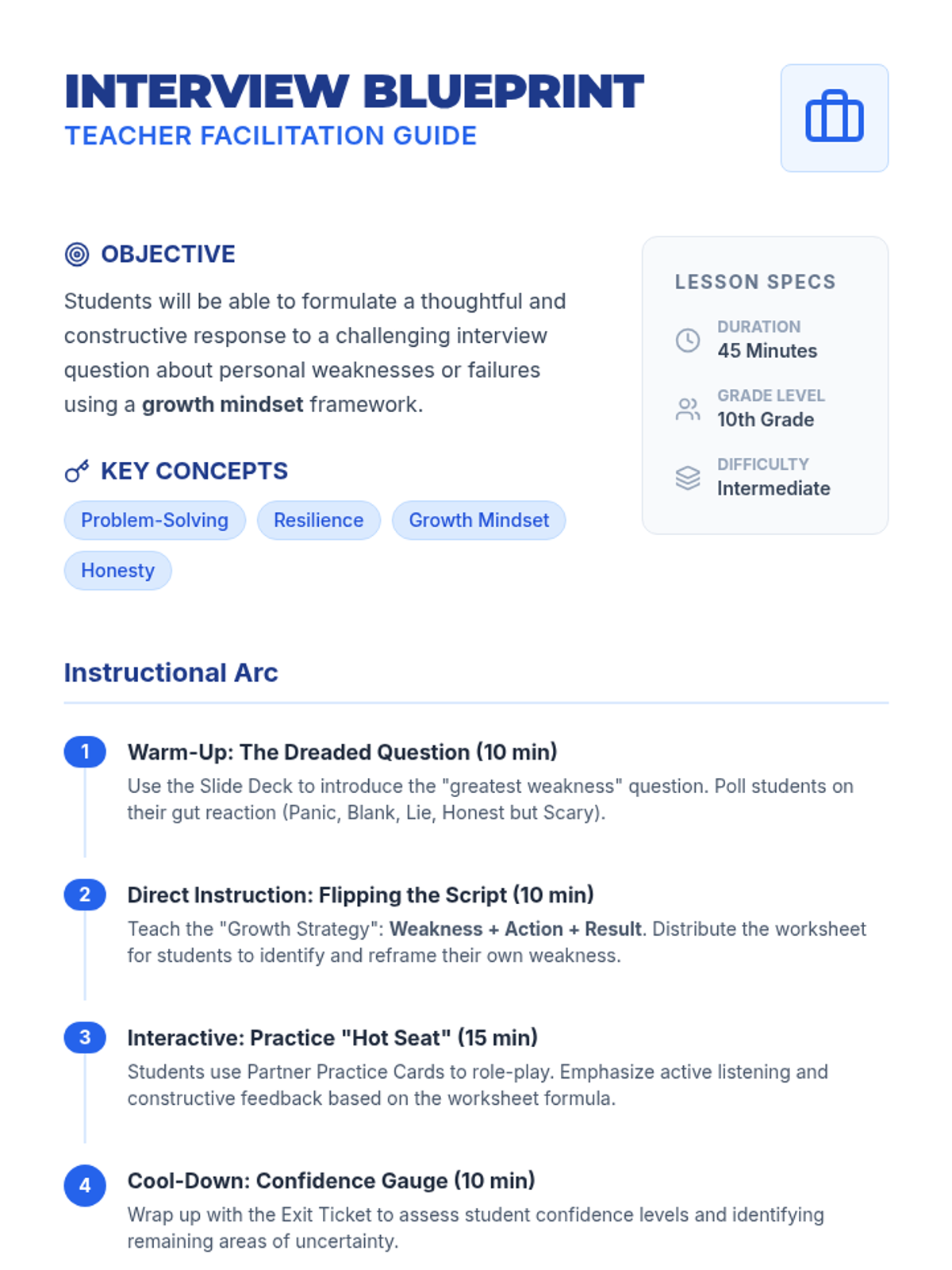 A lesson focused on equipping students with strategies to handle difficult interview questions, specifically focusing on personal weaknesses and past failures using a growth mindset approach.
