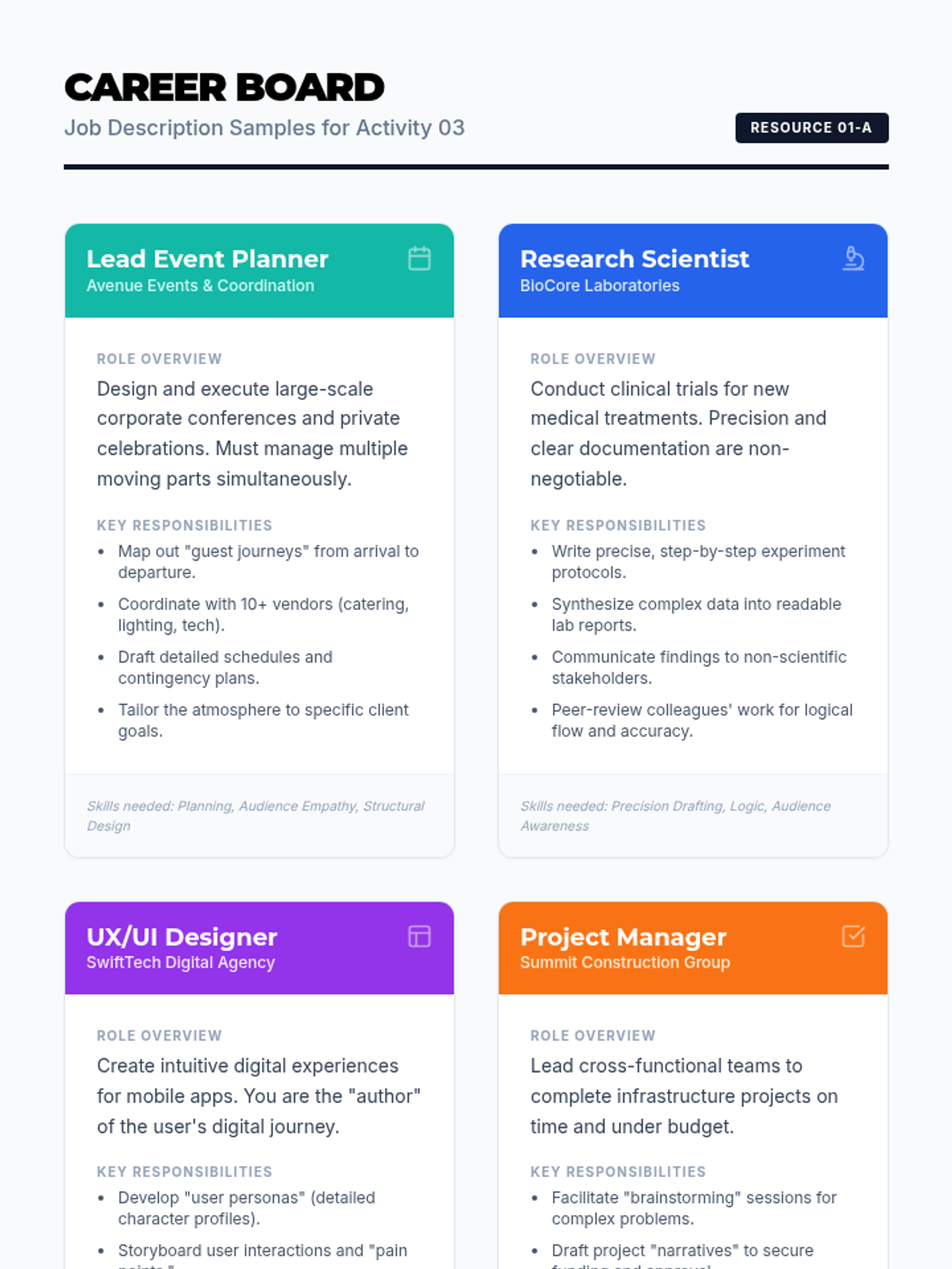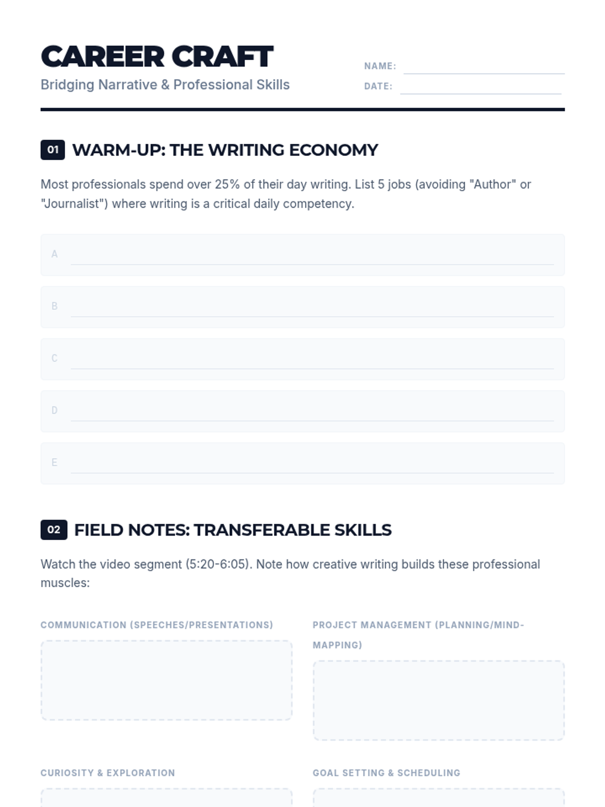 A lesson that bridges creative writing skills with professional competencies, helping students see how narrative elements like audience awareness and planning translate to diverse careers.