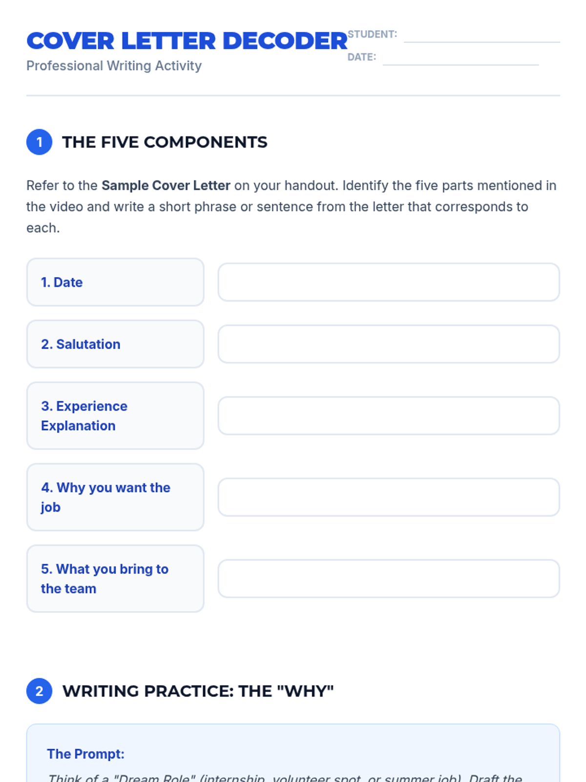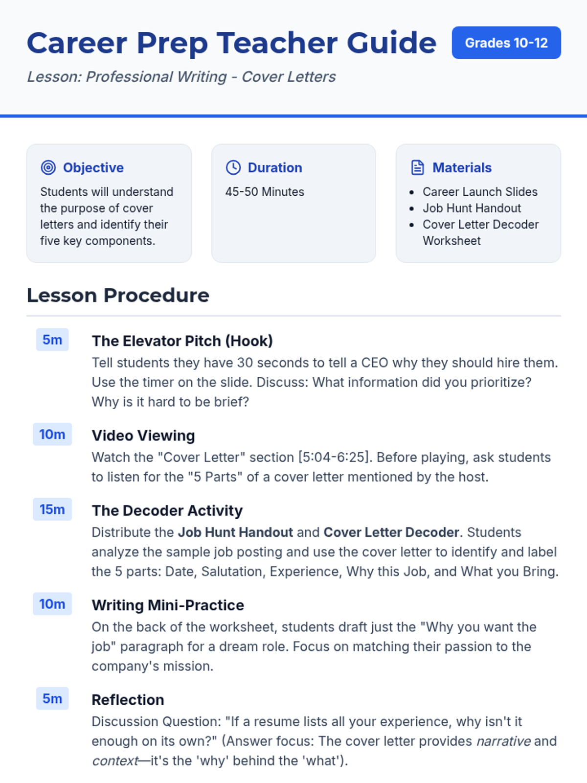 A high school lesson focused on the components and purpose of cover letters, featuring video analysis, sample document review, and a targeted writing exercise. Students learn to frame their experience as 'language power' to access career opportunities.