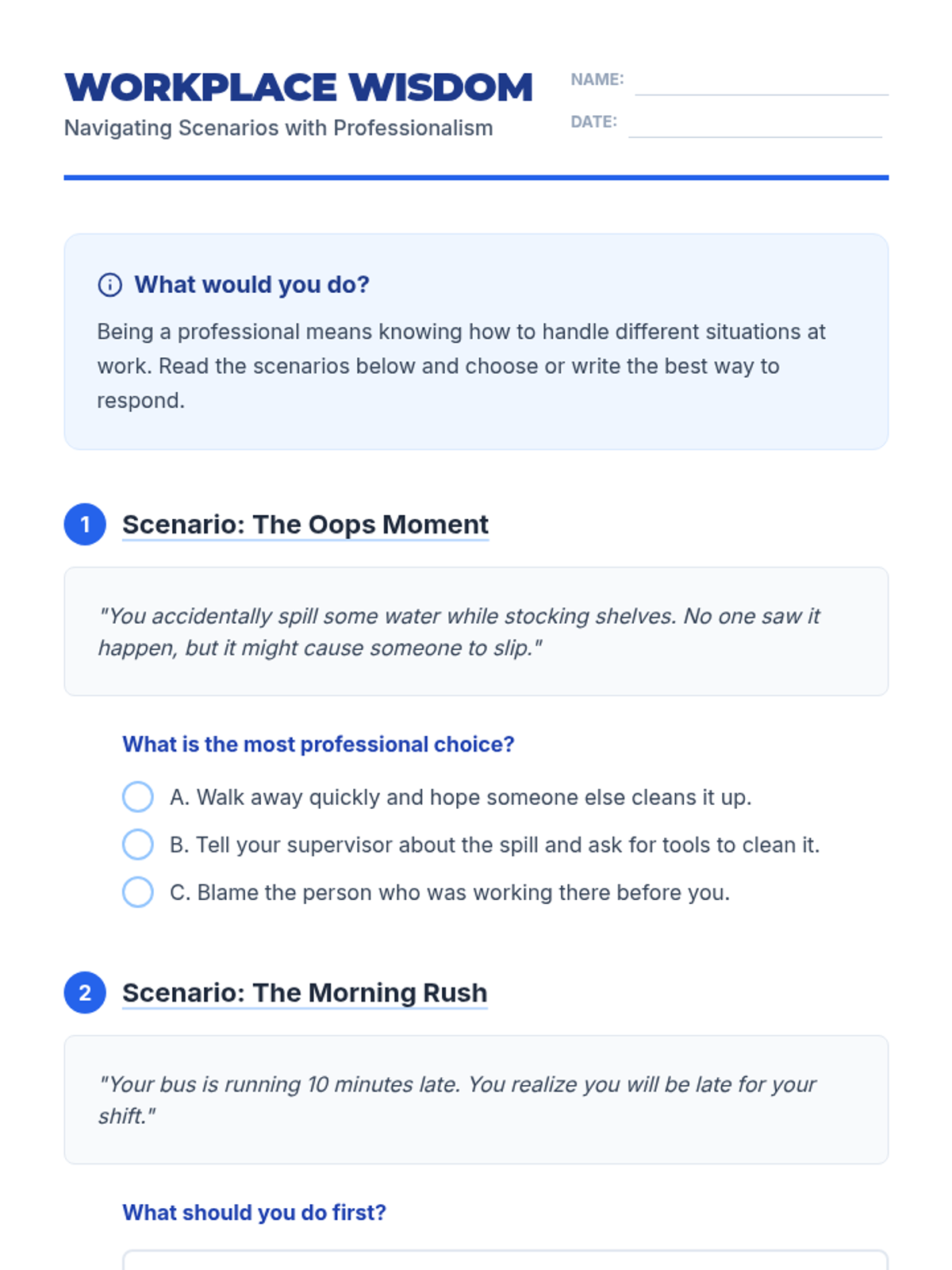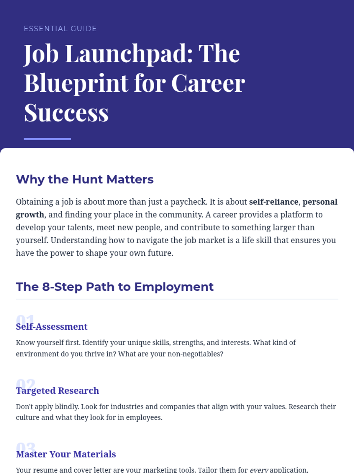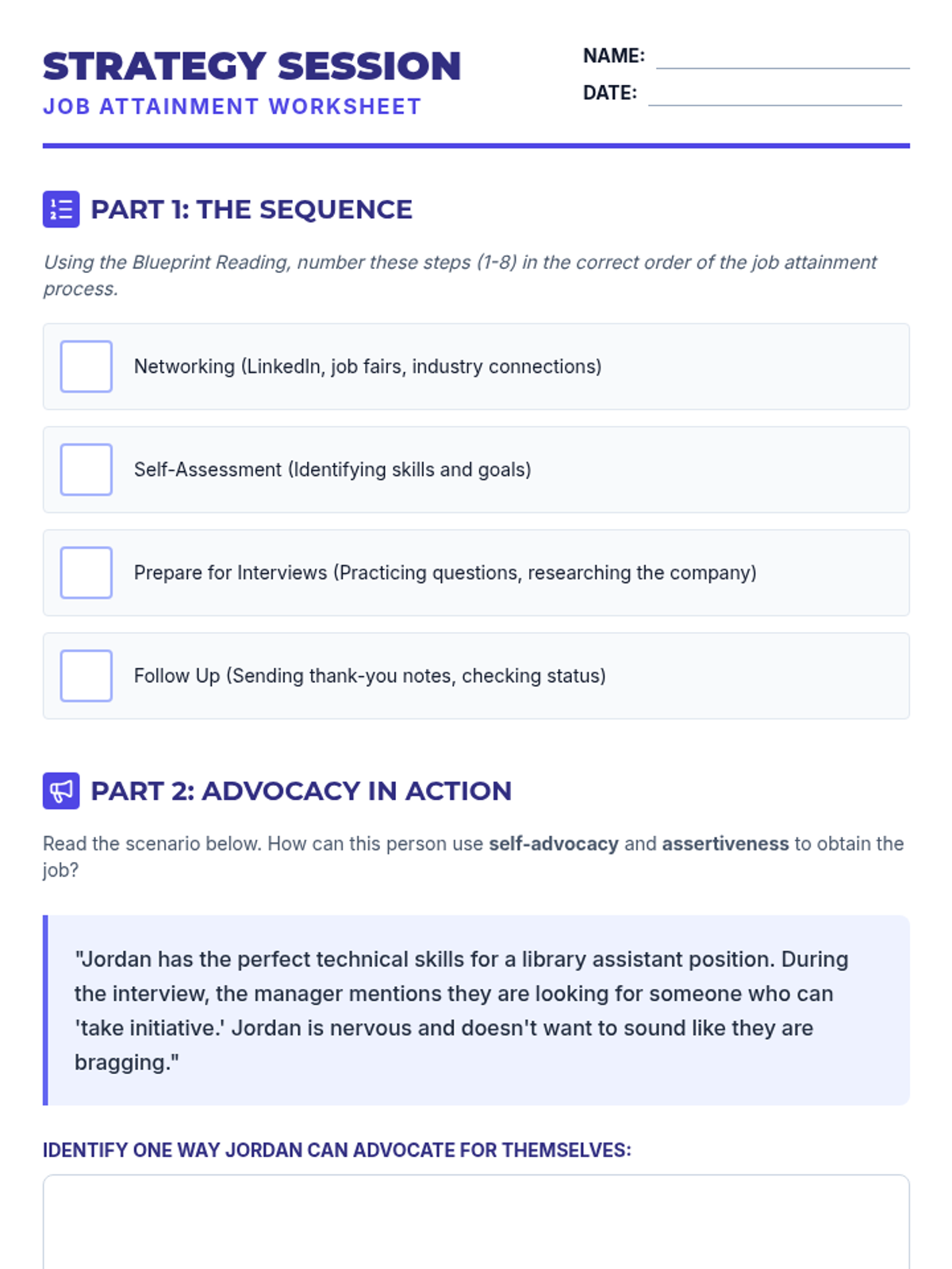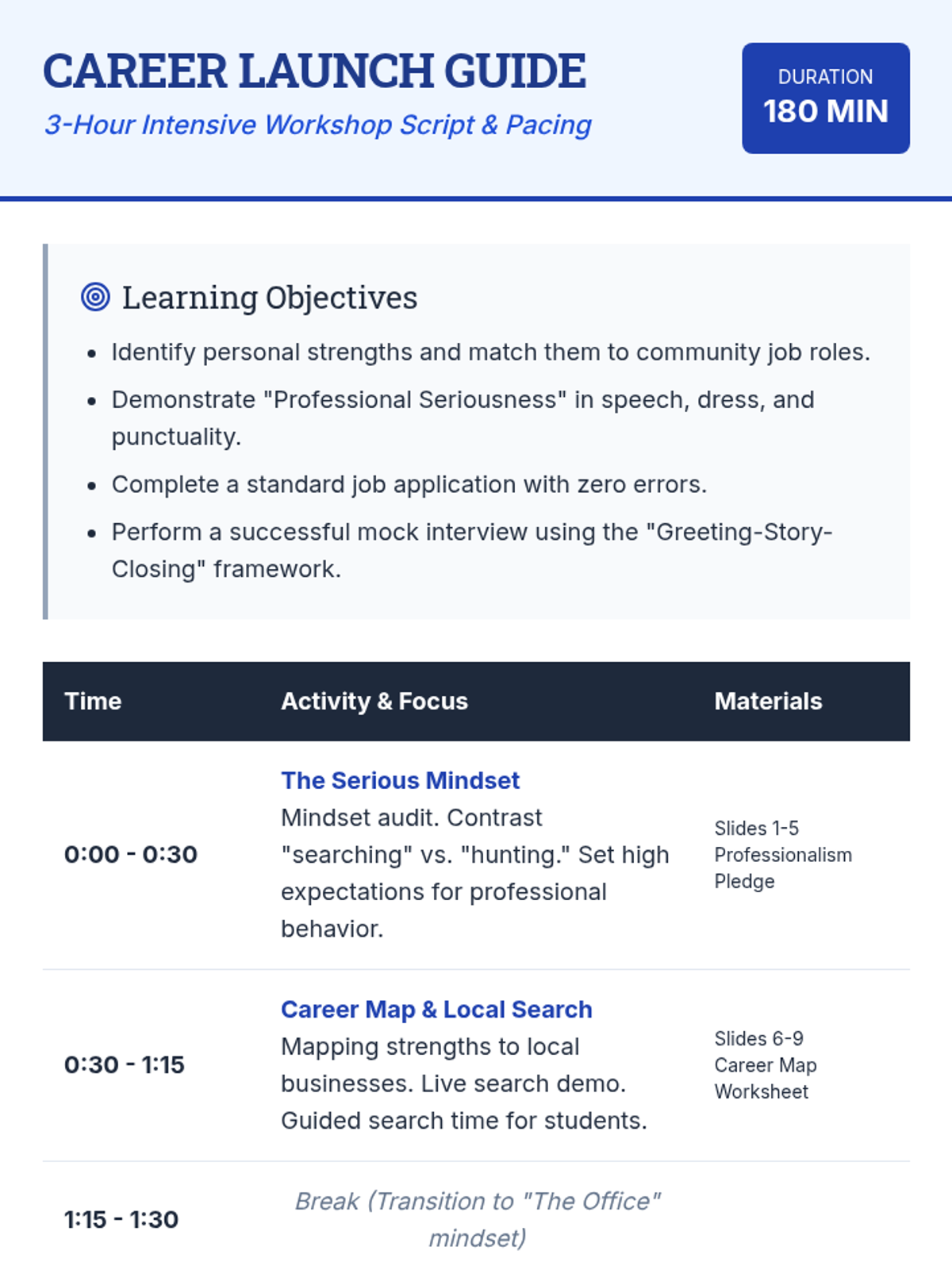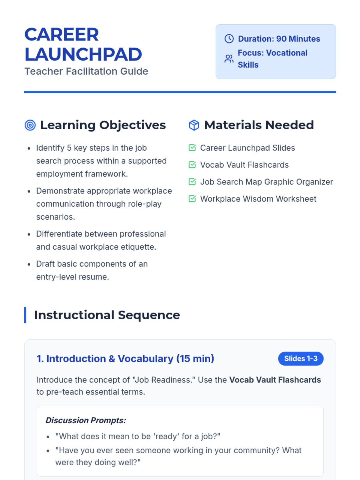 A comprehensive 3-hour lesson designed for adults with disabilities, focusing on effective job searching, the application process, interview readiness, and maintaining a professional, 'serious' mindset.