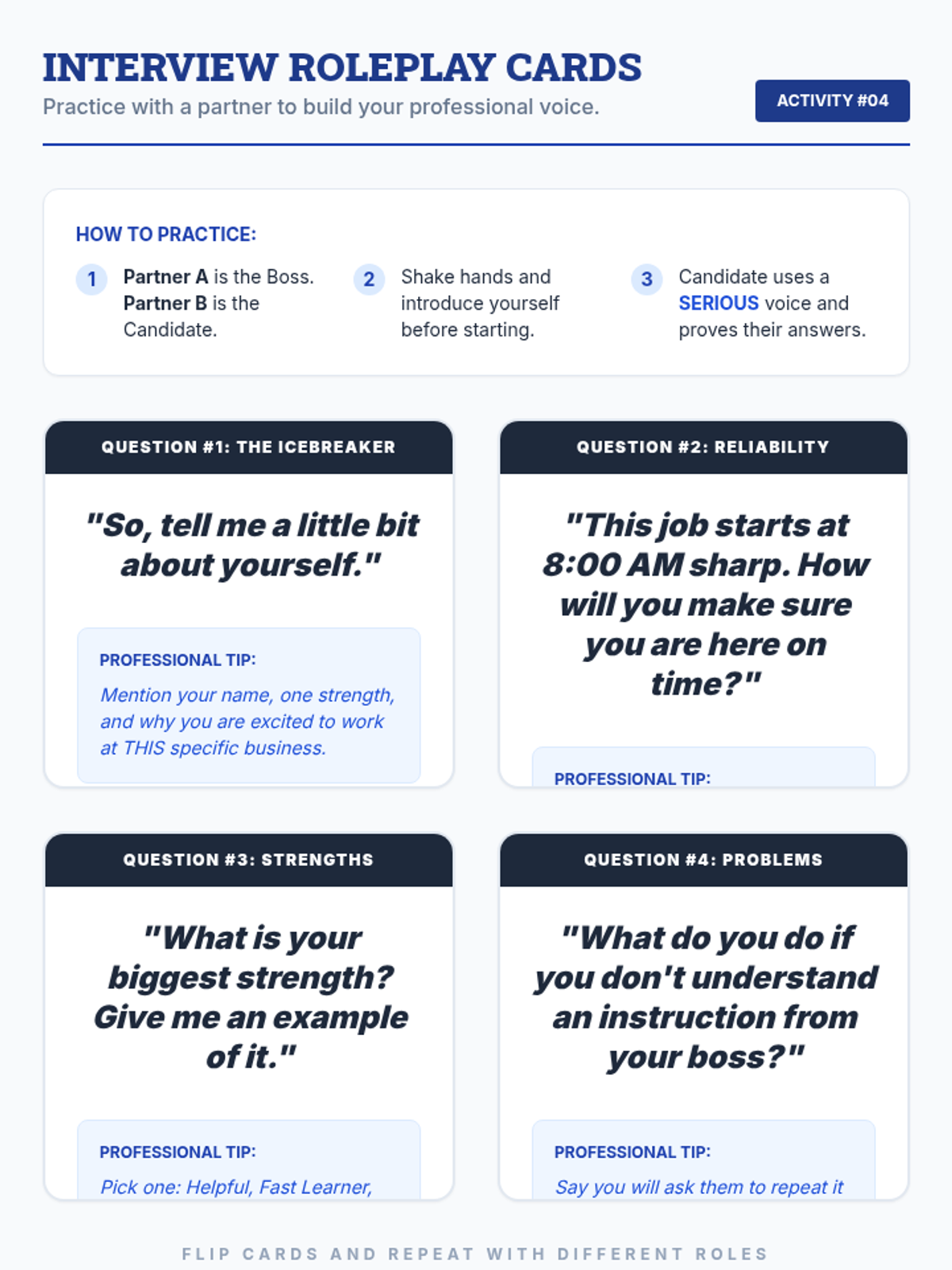 Practicing simple, common interview questions through role-play and visual prompt cards.