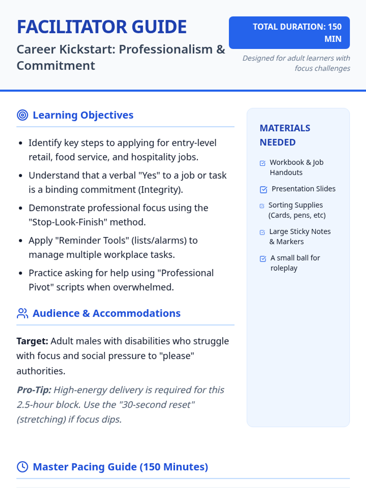 A comprehensive 120-minute training session for adult males with disabilities, focusing on job application skills, the importance of reliability, and professional behavior in retail, hospitality, and food service. The lesson emphasizes moving beyond 'just saying yes' to genuine commitment and focus.