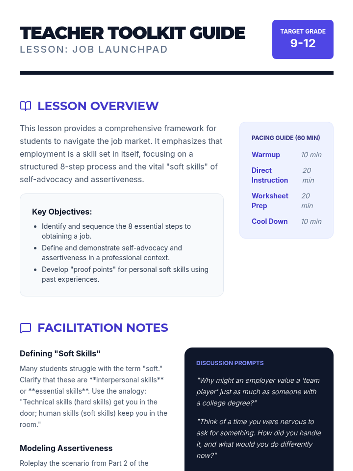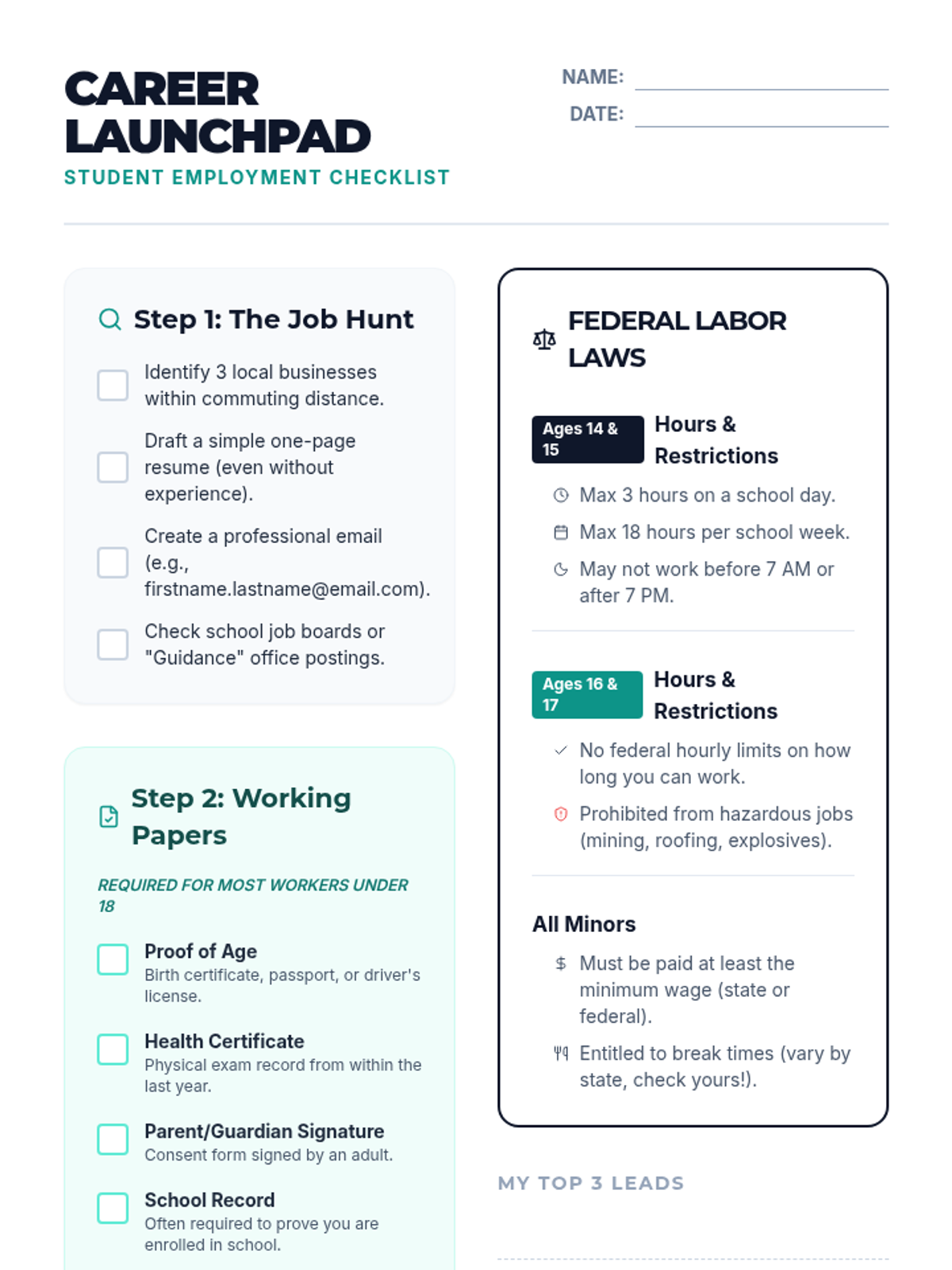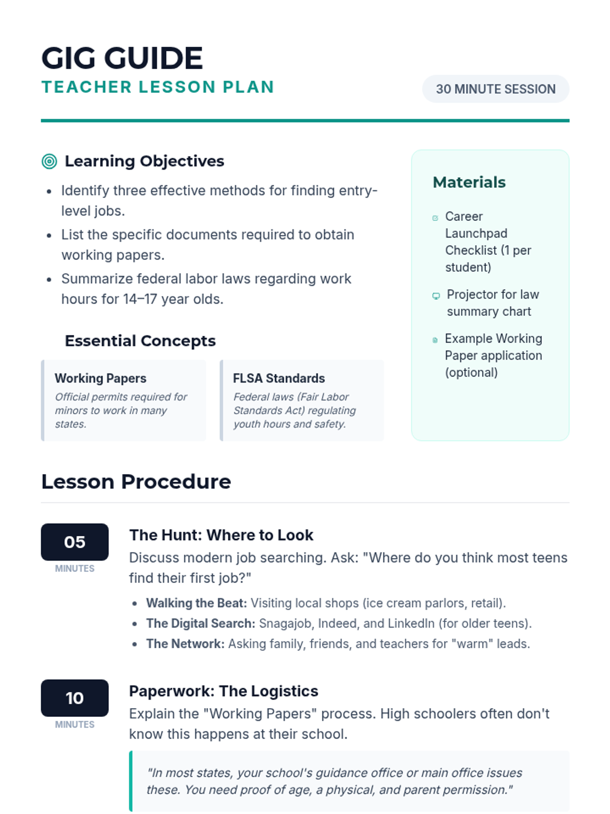 A concise 30-minute lesson designed to equip high school students with the essential knowledge to find their first job, secure necessary working papers, and understand federal labor laws regarding hours and safety.