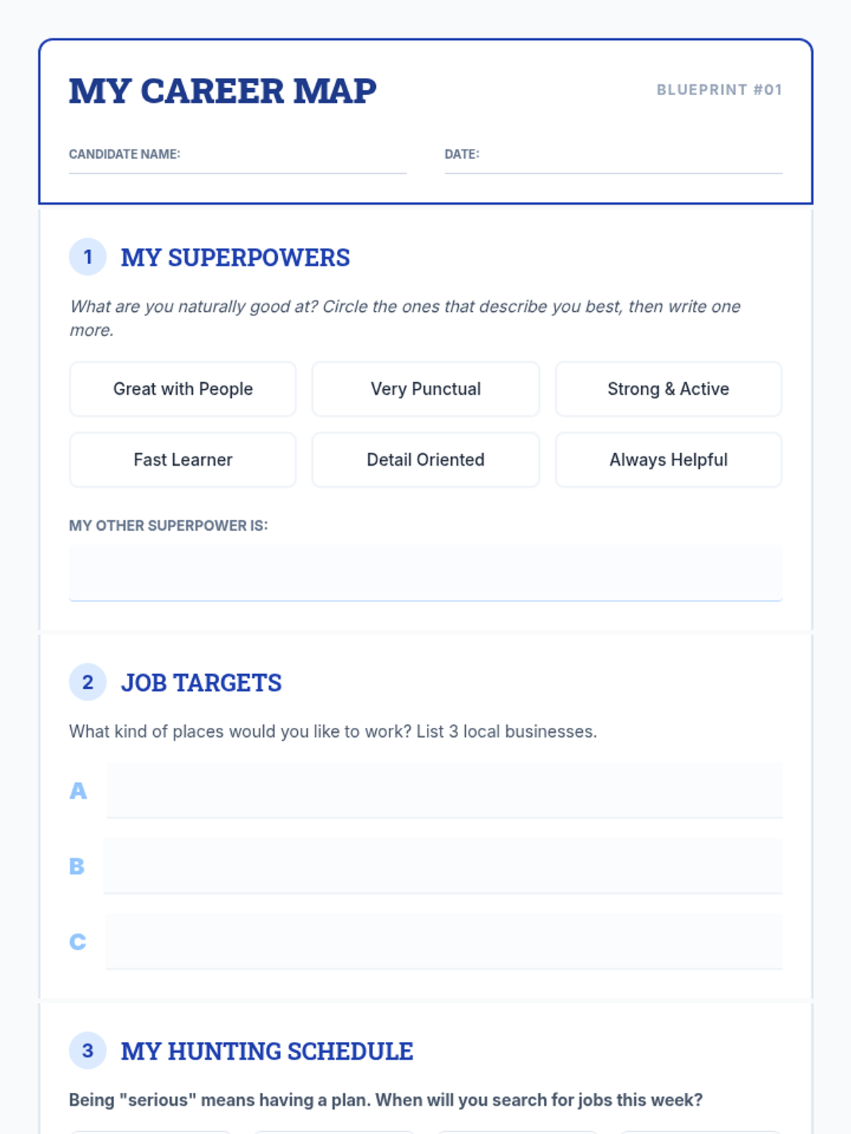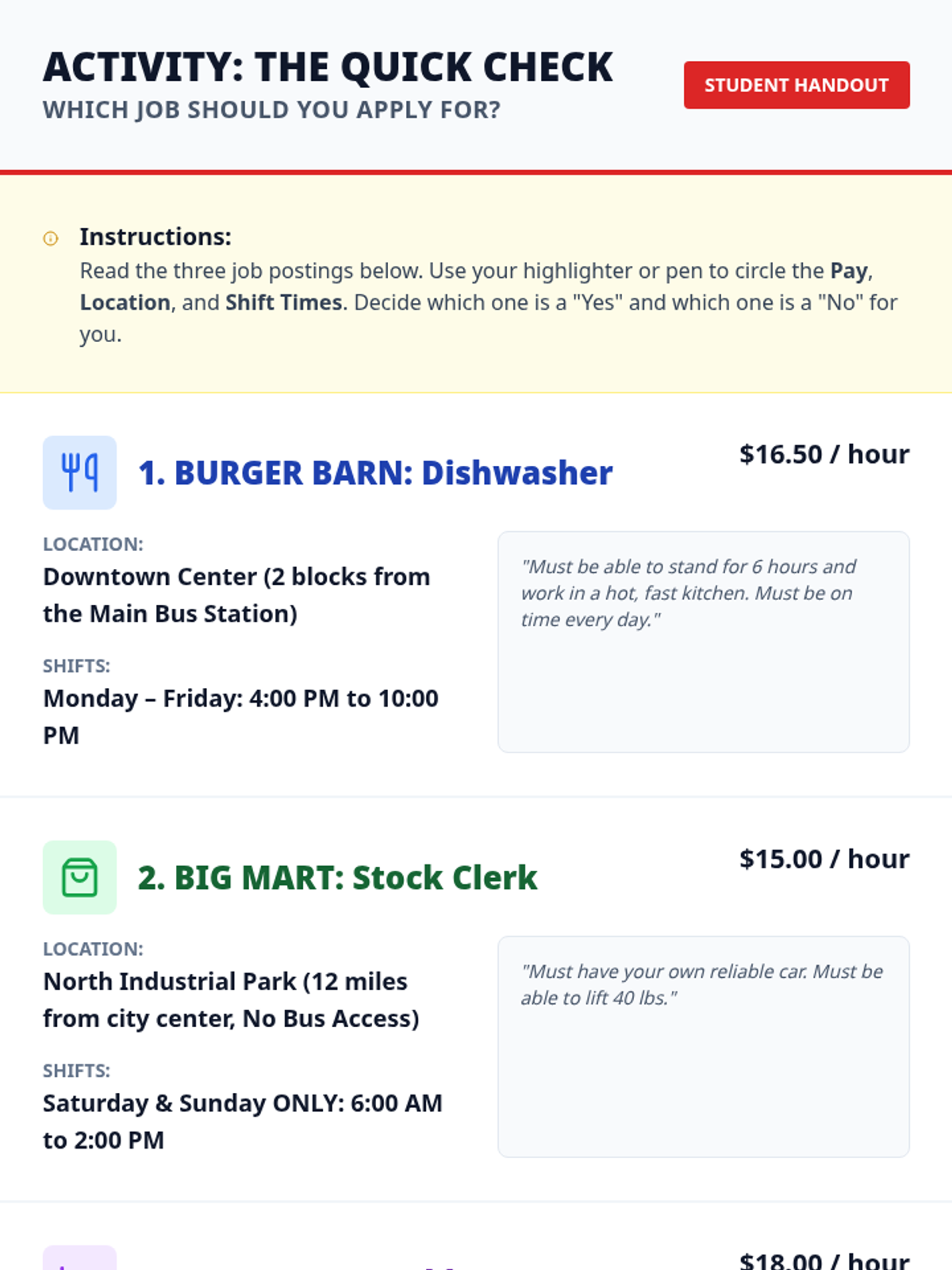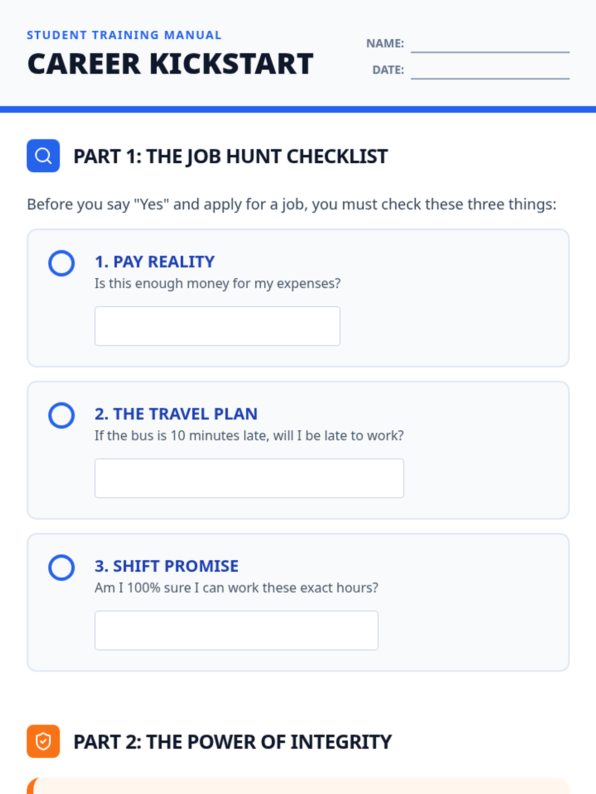 A concise 30-minute lesson designed to equip high school students with the essential knowledge to find their first job, secure necessary working papers, and understand federal labor laws regarding hours and safety.