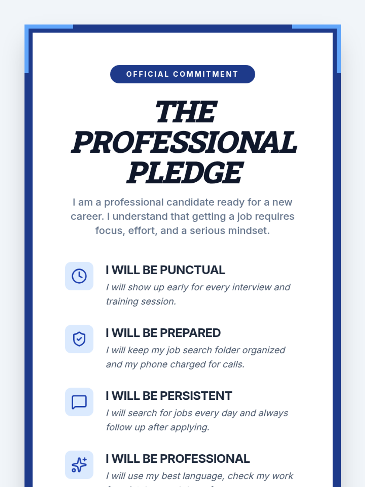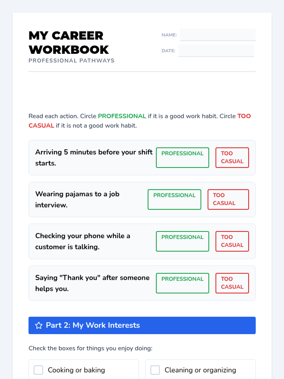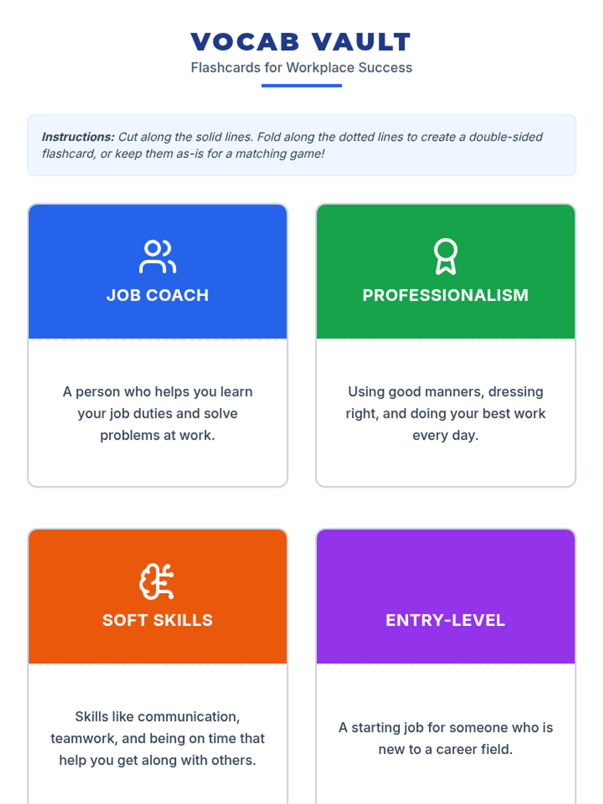 A 3-hour foundational session covering personal strengths, professional behavior, and basic application skills. Includes hands-on activities tailored for individual instruction and accessible learning.