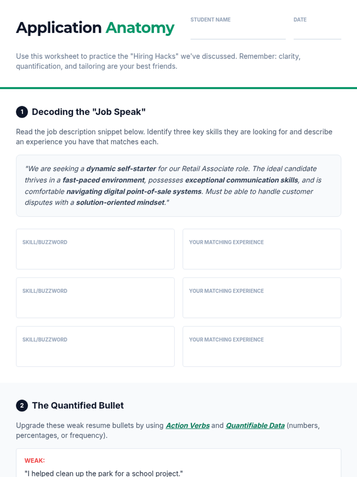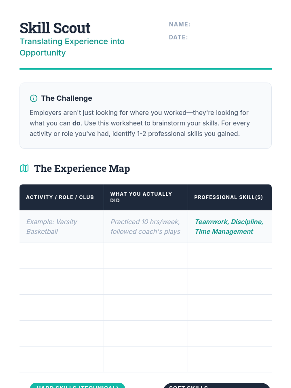 This workshop helps students mine their daily lives for relevant content, mapping activities like babysitting, sports, or student council to professional soft and hard skills.