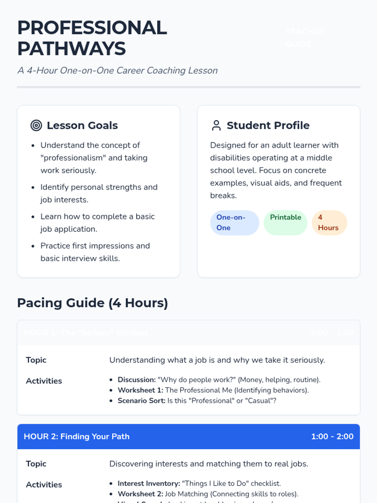 A comprehensive 4-hour one-on-one lesson designed for adults with disabilities at a middle school level, focusing on professionalism, job applications, and workplace skills.