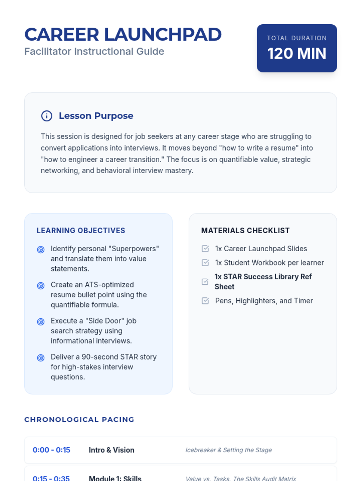A comprehensive 120-minute training session covering self-assessment, resume building, job search strategies, and interview techniques for job seekers.