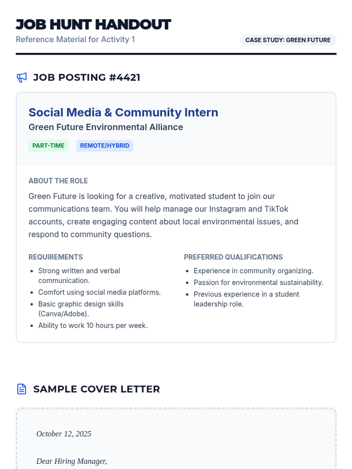 Students select a 'dream' high school internship or summer job and submit their cover letter emphasizing transferable skills. They participate in a mock hiring committee to review anonymized letters and decide who to interview based on potential shown.