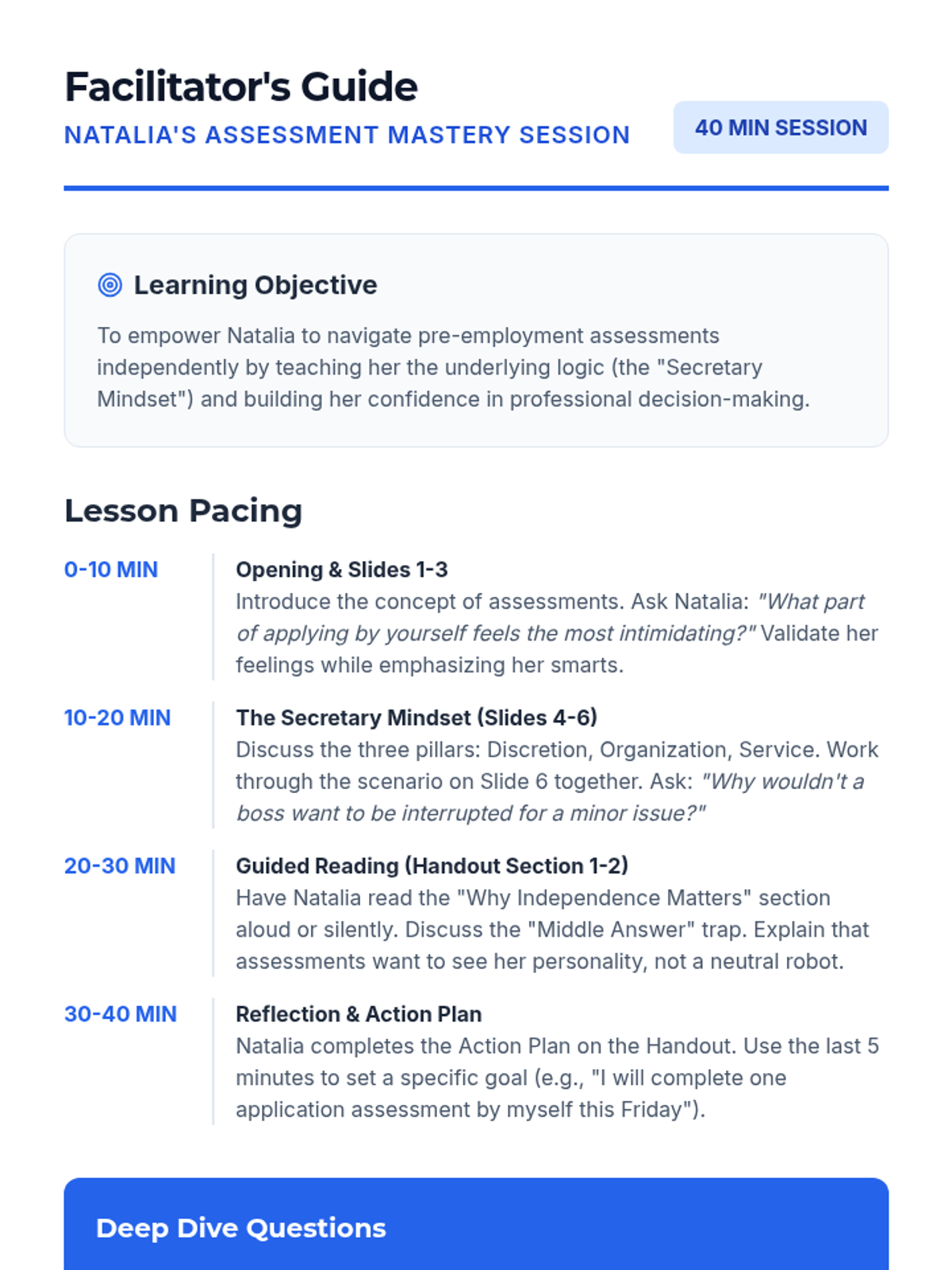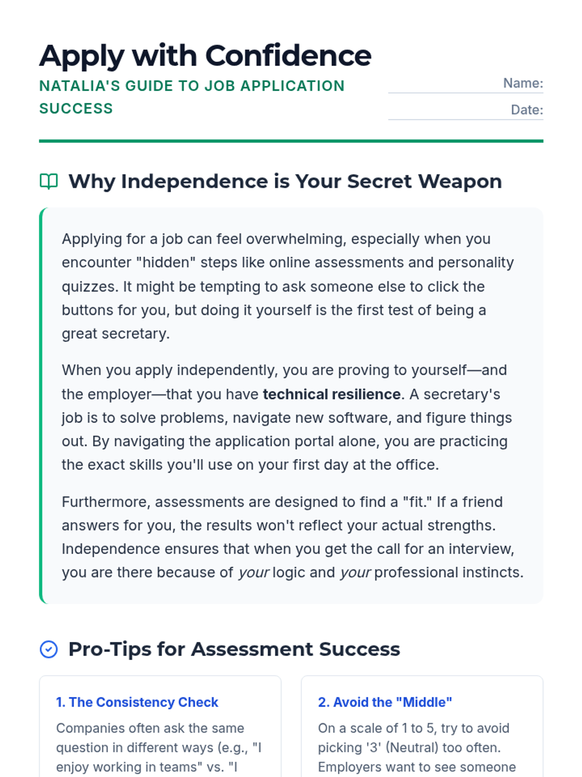 This lesson helps students like Natalia master pre-employment assessments for secretary and administrative roles, focusing on the logic behind situational judgment tests and the importance of independent application.