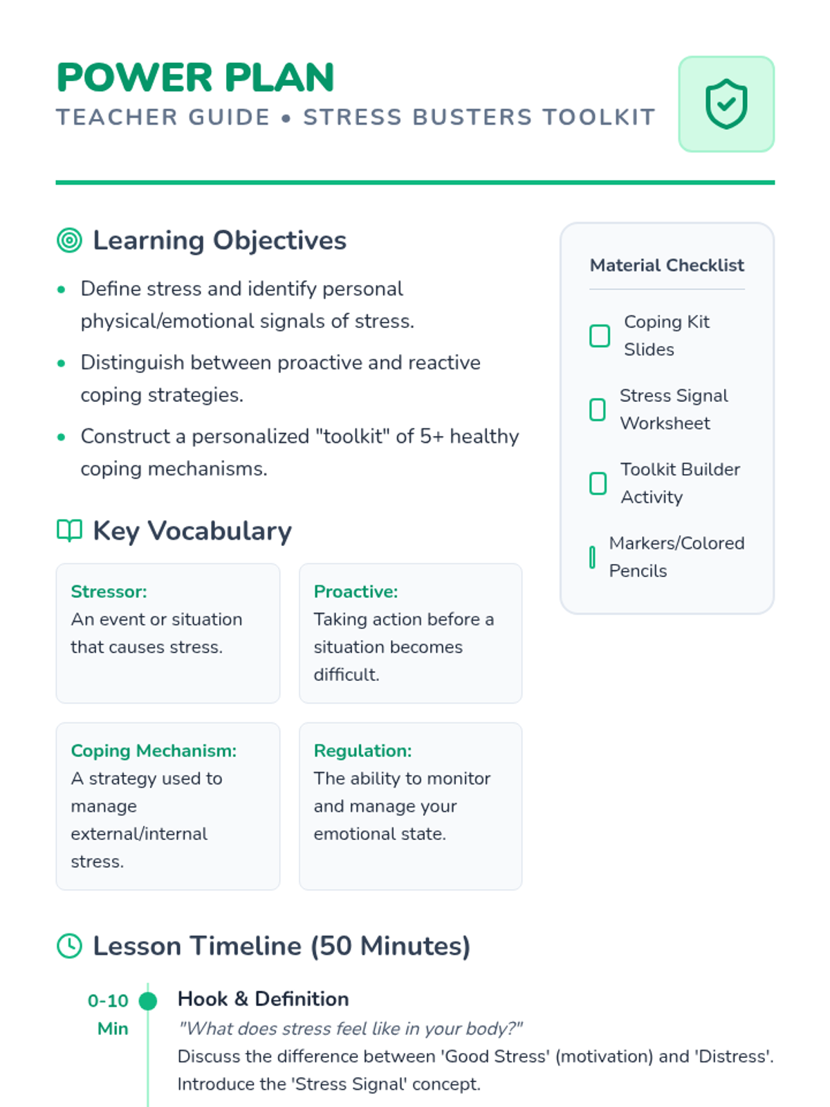 A lesson focused on developing emotional intelligence through identifying and practicing various coping strategies and regulation techniques.