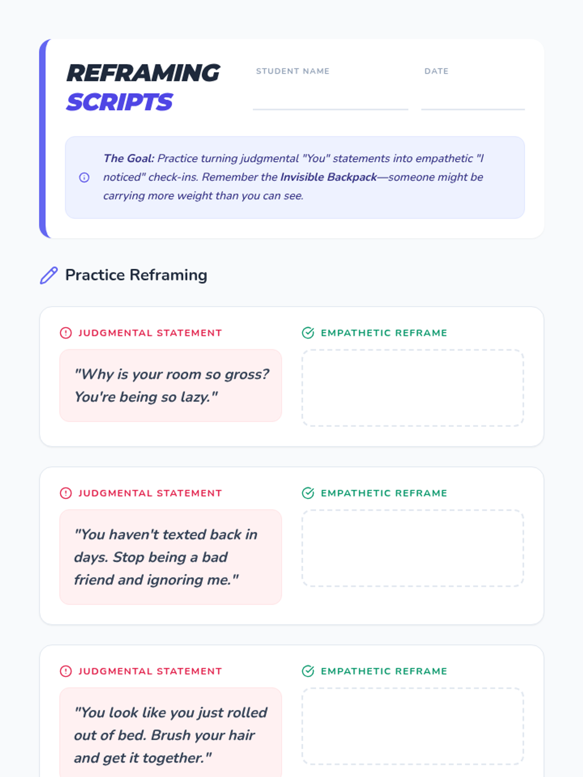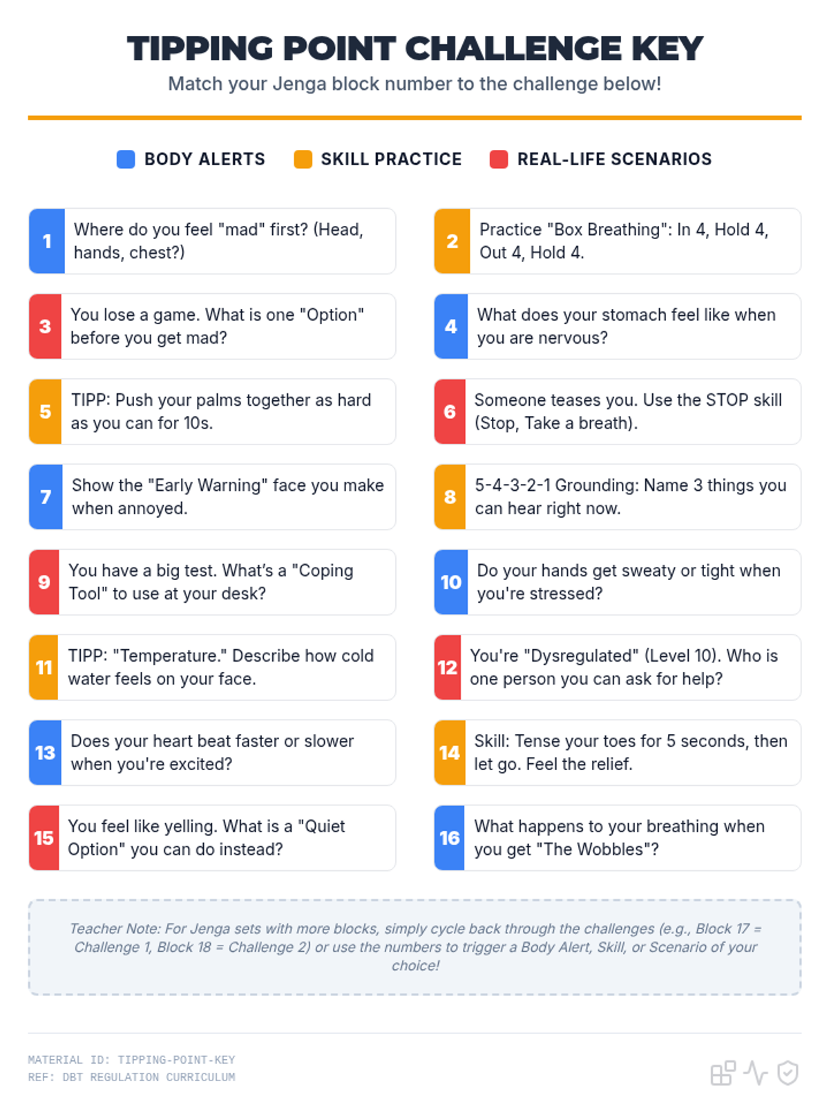 Counseling & Life SkillsSelf-AwarenessBasic Emotion RecognitionComplex Emotion IdentificationEmotional Nuance & Mixed FeelingsBuilding Positive Self-ImageRecognizing Strengths & Growth AreasAccurate Self-AssessmentPersonal Values IdentificationCultural & Individual Identity ExplorationValues-Based Decision MakingSelf-ManagementStop-and-Think StrategiesDelaying GratificationIndependent Impulse ManagementIdentifying Stress TriggersShort-Term Goal SettingSMART Goals DevelopmentGoal Monitoring & AdjustmentBuilding Perseverance & ResilienceInternal Motivation DevelopmentComprehensive Stress Reduction PlanningSocial AwarenessRecognizing Others' FeelingsDemonstrating EmpathyRespecting Individual DifferencesUnderstanding Cultural DiversityComplex Empathetic ResponsesMultiple Viewpoint ConsiderationMulti-Perspective AnalysisChallenging Stereotypes & BiasRelationship SkillsActive ListeningClear Verbal & Nonverbal CommunicationBuilding Positive FriendshipsWorking Cooperatively in GroupsCommunicating Personal BoundariesRespecting Others' BoundariesAssertive ExpressionPeaceful Problem-SolvingContributing to Team GoalsComplex Conflict NavigationMediation & NegotiationHealthy Romantic RelationshipsResponsible Decision-MakingDaily Problem IdentificationBrainstorming Multiple SolutionsEvaluating Pros & ConsRecognizing Risks & ConsequencesApplying Ethical FrameworksInformed Risk-Benefit DecisionsRoot Cause AnalysisMindfulnessMindful BreathingBody Scan MeditationDaily Mindfulness ApplicationDaily Self-Care RoutinesBalancing Life DemandsAdvocating for Wellness NeedsMental Health SupportUnderstanding Anxiety SymptomsWorry Management StrategiesProgressive Muscle RelaxationRecognizing Depression SignsBuilding Mood-Supporting RoutinesBehavioral Activation for MoodUnderstanding Grief StagesHealthy Grief CopingCreative Expression of LossBehavioral SupportDaily Check-In ProceduresDaily Goal Setting & ReviewRecognizing Escalation Warning SignsRequesting Breaks & SupportSelf-Calming During DistressUnderstanding Positive ReinforcementToken Economy ImplementationBehavior Chart TrackingAnalyzing Behavior PatternsIdentifying Antecedents & ConsequencesDetermining Behavior FunctionFunction-Based InterventionsIndividualized Behavior ContractsData-Driven Behavior AdjustmentTherapeutic ApproachesThoughts-Feelings-Behaviors ConnectionRecognizing Thinking PatternsChallenging Negative ThoughtsPositive Self-Talk PracticeThought Record TrackingAdvanced Cognitive RestructuringComprehensive CBT PlansBehavioral Activation TechniquesBuilding Positive ExperiencesExposure Hierarchies for AnxietyPresent-Moment AwarenessNon-Judgmental ObservationSelf-Soothing & DistractionComplex Emotion LabelingReducing Emotional Vulnerability (PLEASE)DEAR MAN CommunicationGIVE Skills for RelationshipsFAST Skills for Self-RespectRadical Acceptance PracticeCrisis Survival Skills (TIPP)Understanding Trauma EffectsTrauma Responses & TriggersIdentifying Trauma FeelingsGrounding TechniquesRegulation During Trauma DistressSafe Place VisualizationProcessing Through NarrativeDeveloping Trauma StoryPersonalized Safety PlanningGroup SupportTurn-Taking & SharingGroup Conversation SkillsSharing in Supportive EnvironmentLearning from Similar ChallengesBuilding Community & BelongingNavigating Peer RelationshipsGroup Skill PracticeGroup Mental Health EducationStress & Anxiety UnderstandingCrisis Support & SafetyKnowing When to Seek HelpIdentifying Mental Health CrisesGrounding During CrisisUsing Crisis HotlinesBuilding Support NetworksAccessing Mental Health ResourcesWarning Signs & Coping StrategiesDeveloping Personal Safety PlansUnderstanding Suicide Warning SignsGatekeeper Skills for PeersDigital LiteracySocial MediaTechnology BasicsProductivity ToolsInternet and Online ResearchWeb Design and PublishingDigital CitizenshipOnline Safety and PrivacyEmerging TechnologiesFinancial LiteracyMaking Financial DecisionsBanking and AccountsConsumer SkillsSaving and InvestingCredit and DebtEmployment and IncomeTaxesInsuranceMajor PurchasesEconomic ConceptsFinancial PlanningCollege & Post-Secondary PlanningCareer ExplorationUnderstanding Post-Secondary OptionsCollege Research & SelectionAdmission RequirementsCollege Application ProcessPersonal Statement WritingFAFSA CompletionScholarship Search & ApplicationsUnderstanding Student LoansContinuing Education PlanningInterview PreparationResearching EmployersCommon Interview QuestionsSTAR Method ResponsesProfessional Interview PresenceVirtual Interview SkillsInterview Follow-UpJob Search SkillsUnderstanding Job PostingsEffective Job Search StrategiesNetworking for OpportunitiesResume Writing BasicsAction Verbs & AchievementsTailoring Resumes to JobsCover Letter WritingProfessional ReferencesProfessional CommunicationBusiness Email EtiquettePhone & Voicemail ProfessionalismMeeting ParticipationPresentation SkillsProfessional Work EthicTime Management & ProductivityTeamwork & CollaborationAdaptability & FlexibilityProblem-Solving at WorkConstructive FeedbackWorkplace RightsUnderstanding Employment LawsPay & Benefits UnderstandingWorkplace SafetyAnti-Discrimination & Harassment