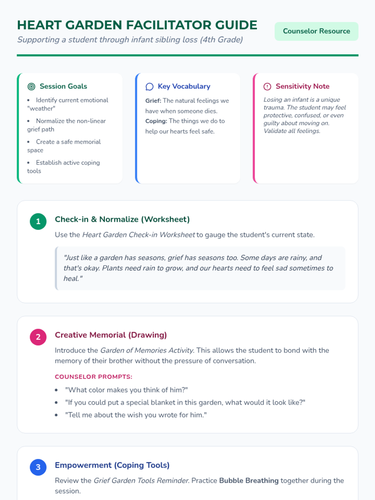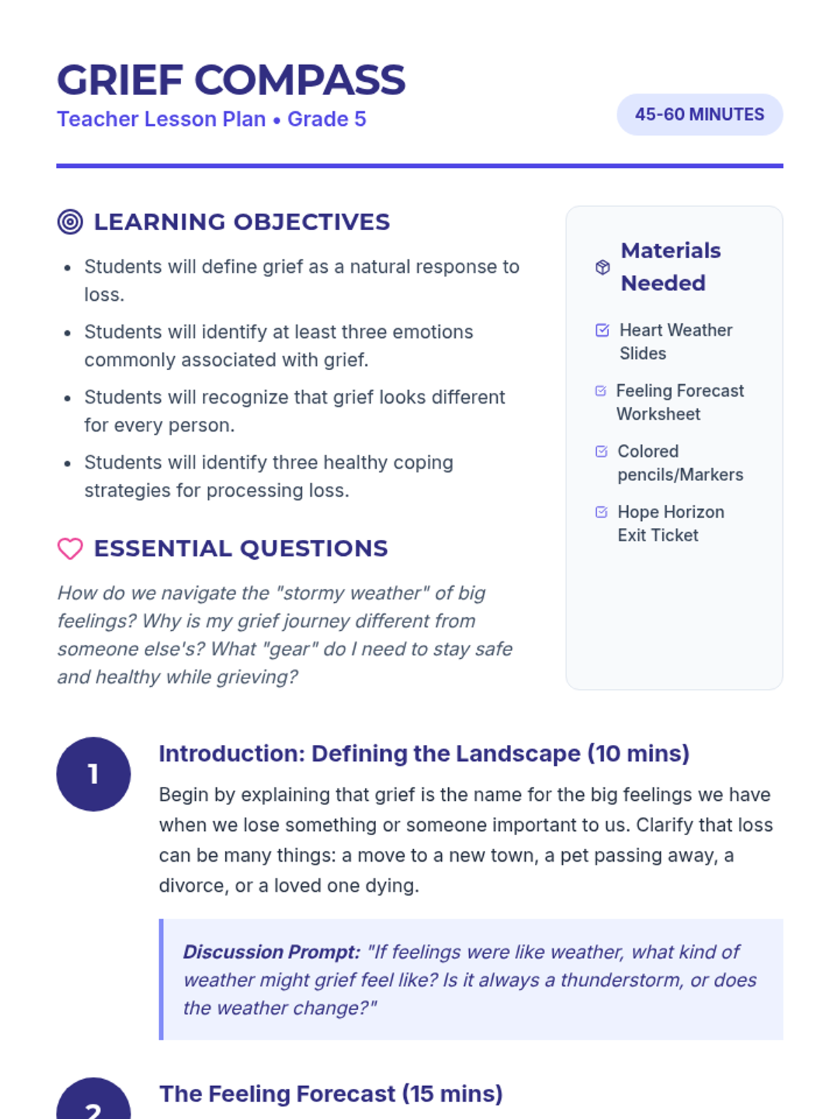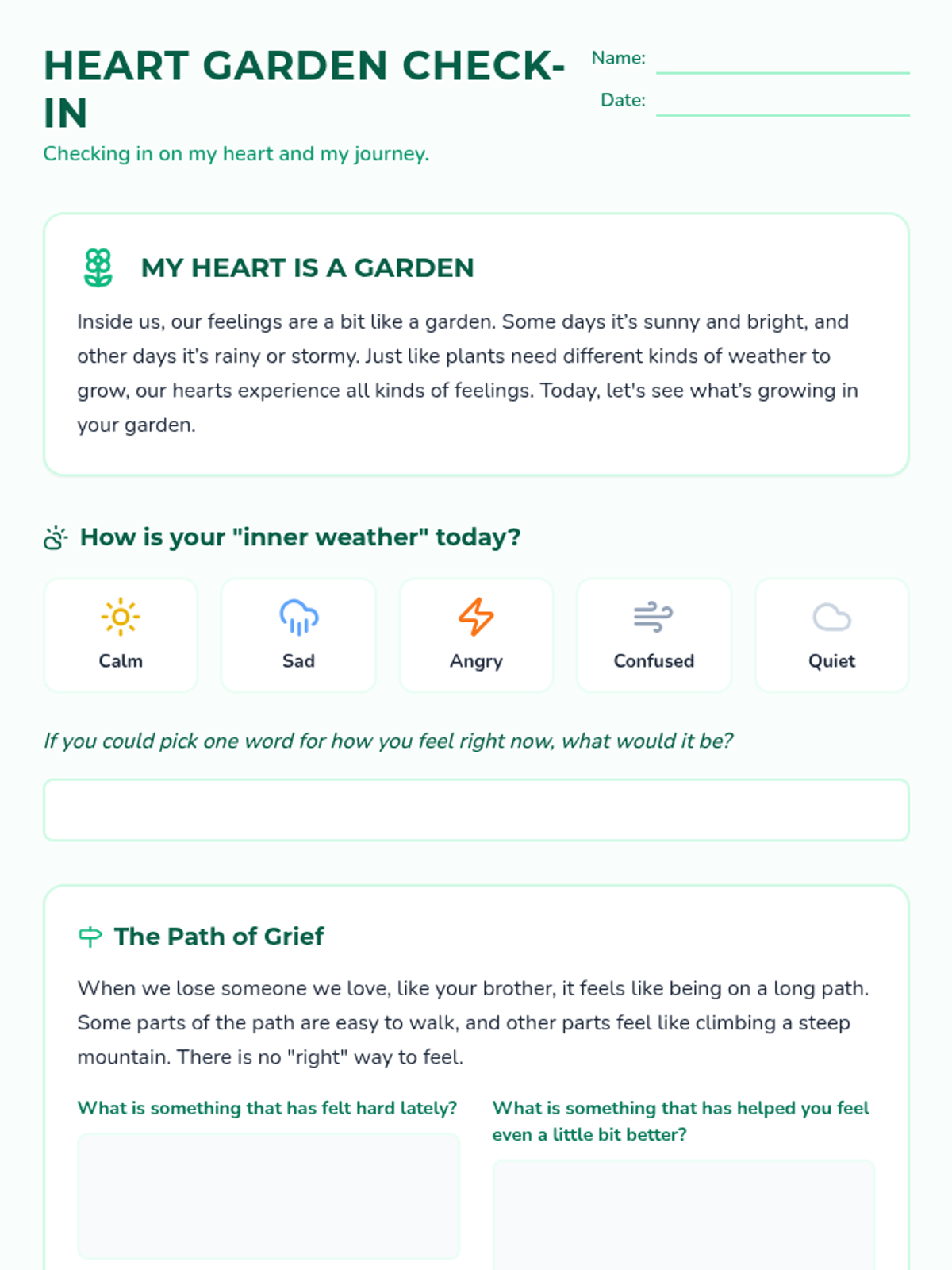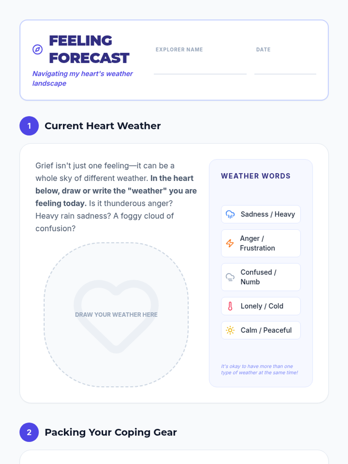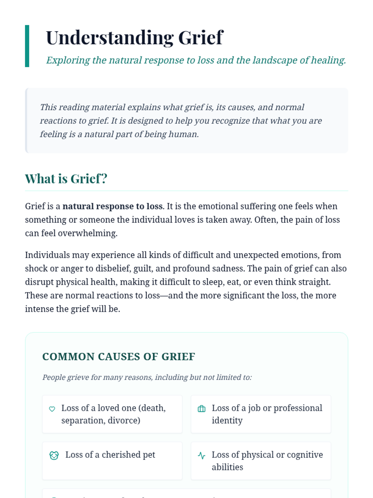 Identification of anxiety and depression symptoms alongside practical management strategies like progressive muscle relaxation and behavioral activation. Addresses the stages of grief through creative expression and routine-building to support emotional resilience.