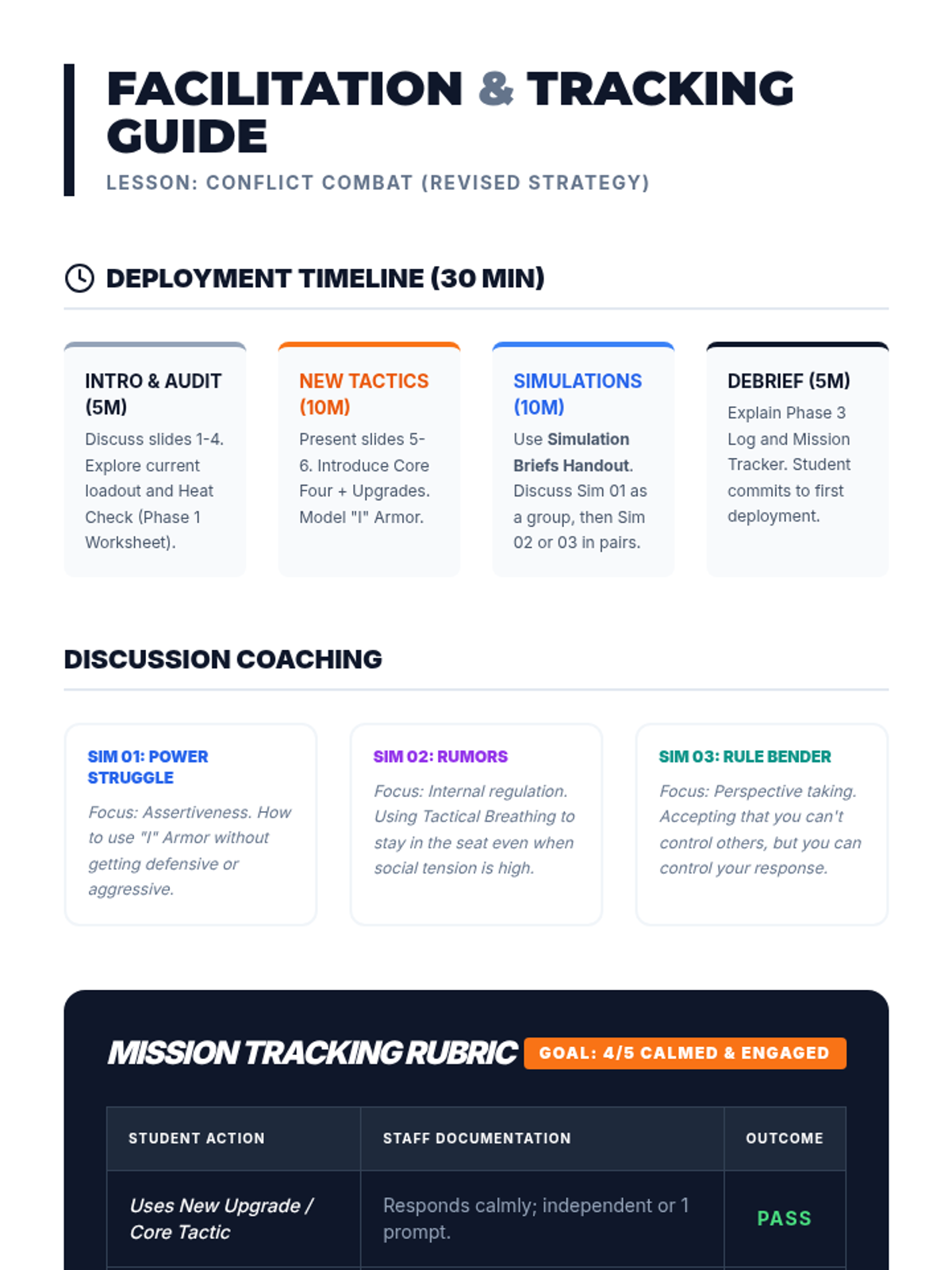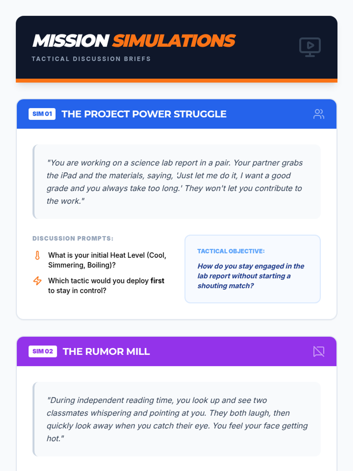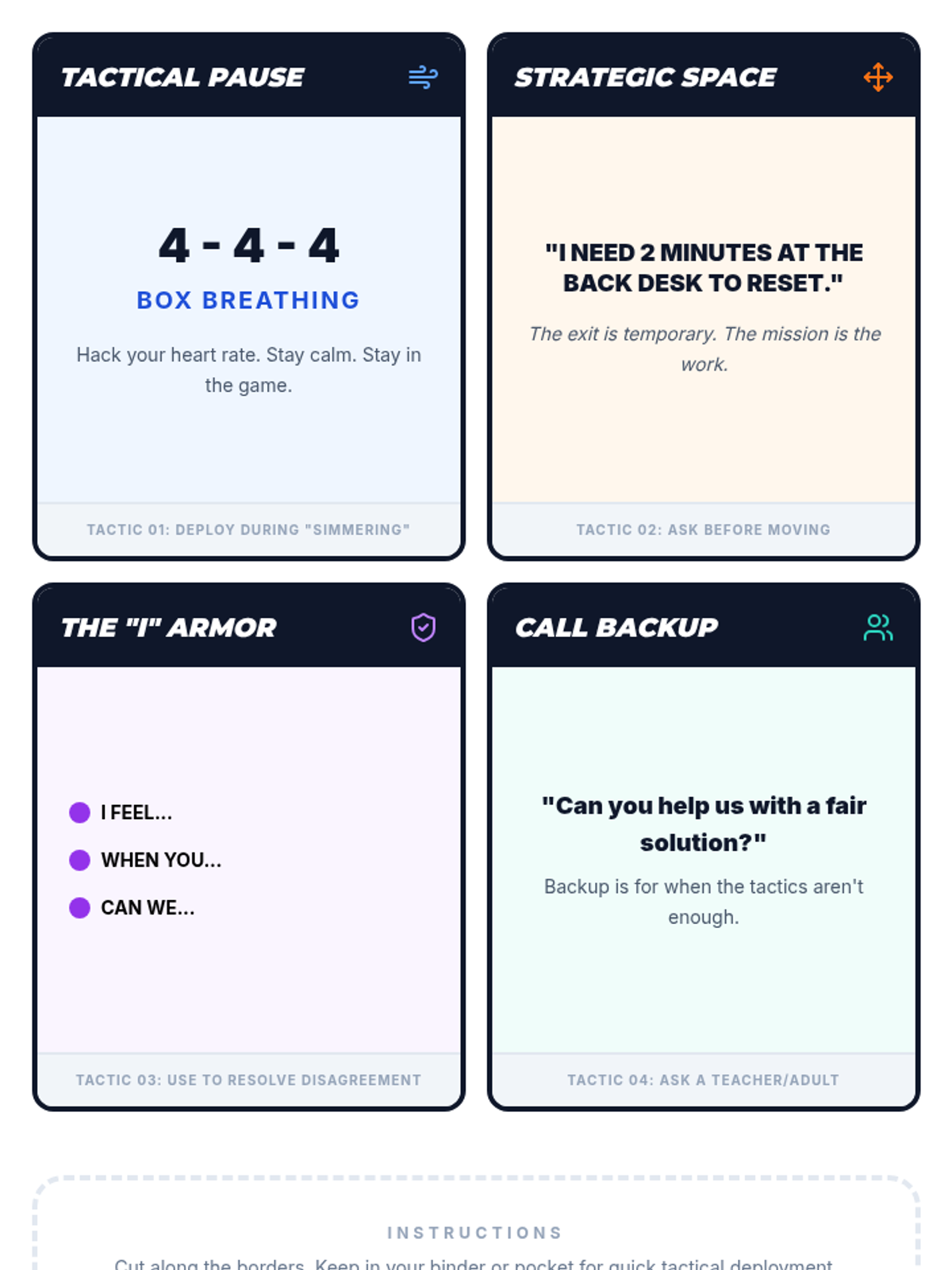 A 30-minute high-engagement lesson designed to help middle school students navigate peer conflict using four tactical coping strategies: tactical breathing, strategic space, 'I' statements, and seeking support. The lesson focuses on staying 'in the game' and maintaining engagement after a disagreement.