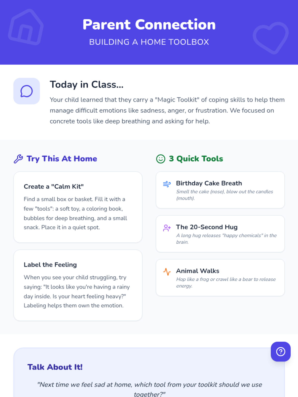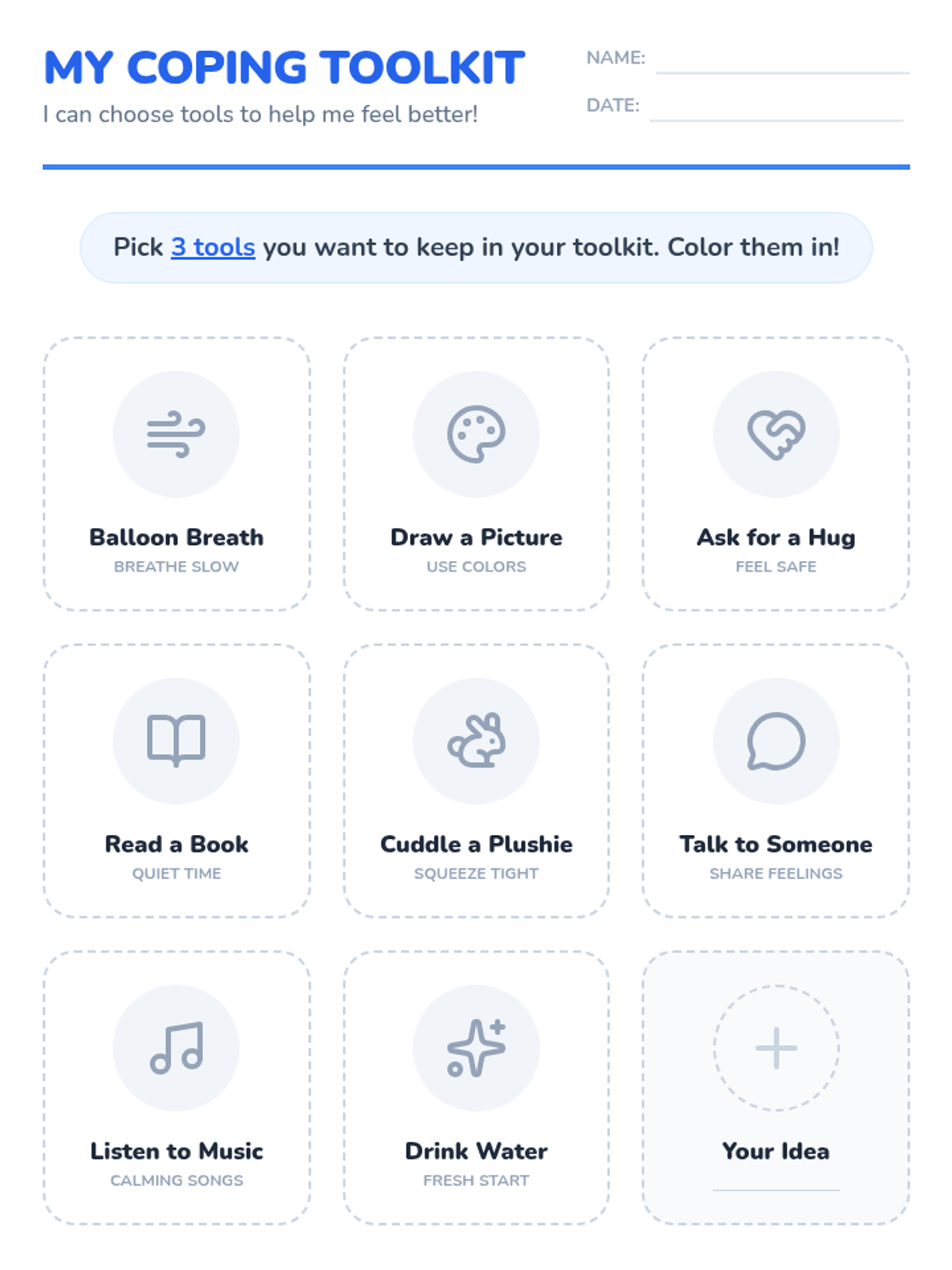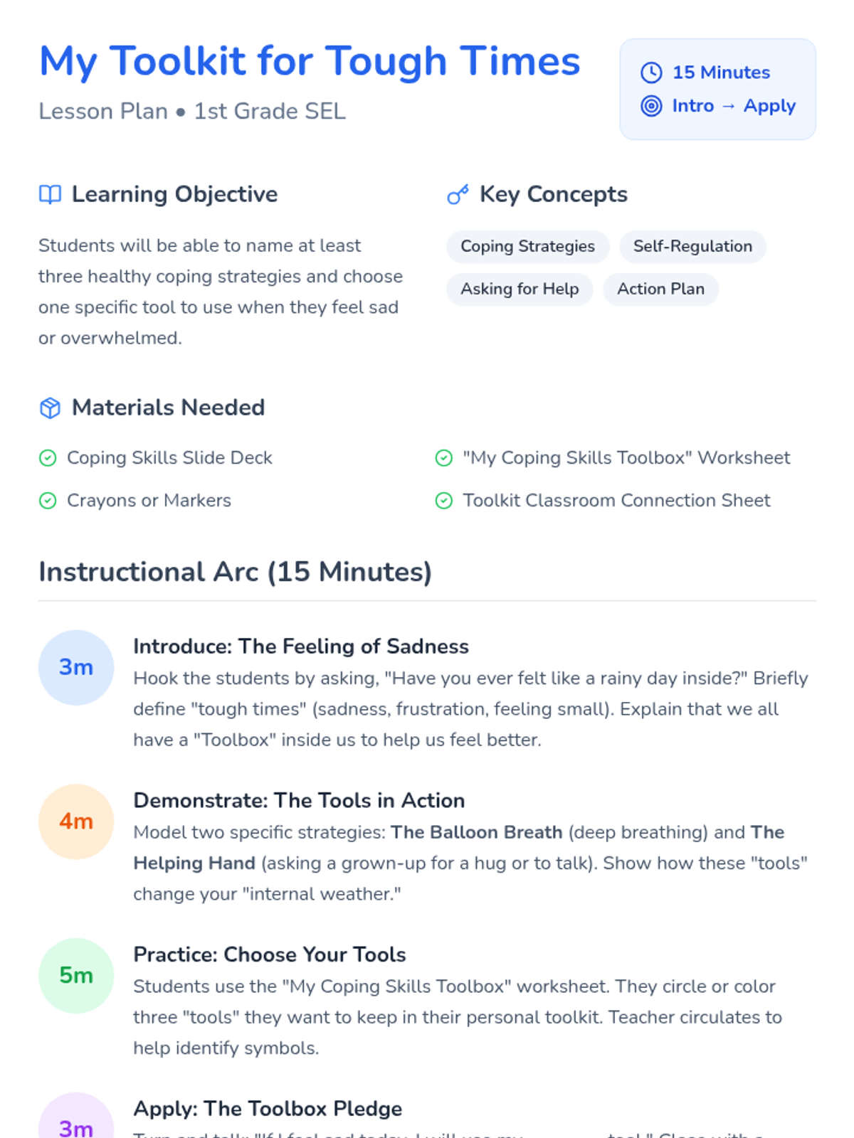 A 15-minute Social-Emotional Learning lesson for 1st graders focused on identifying and using healthy coping strategies to manage sadness and difficult emotions. Students explore a 'toolbox' of actions they can take to feel better.