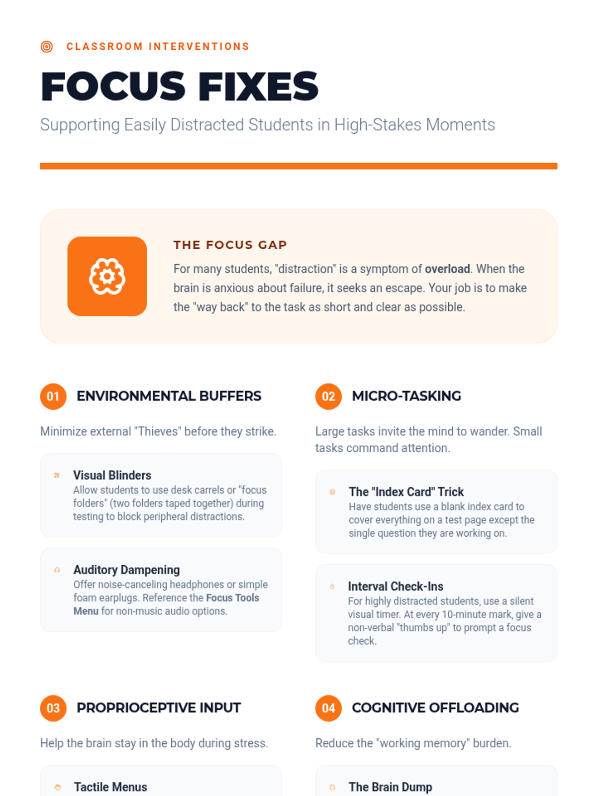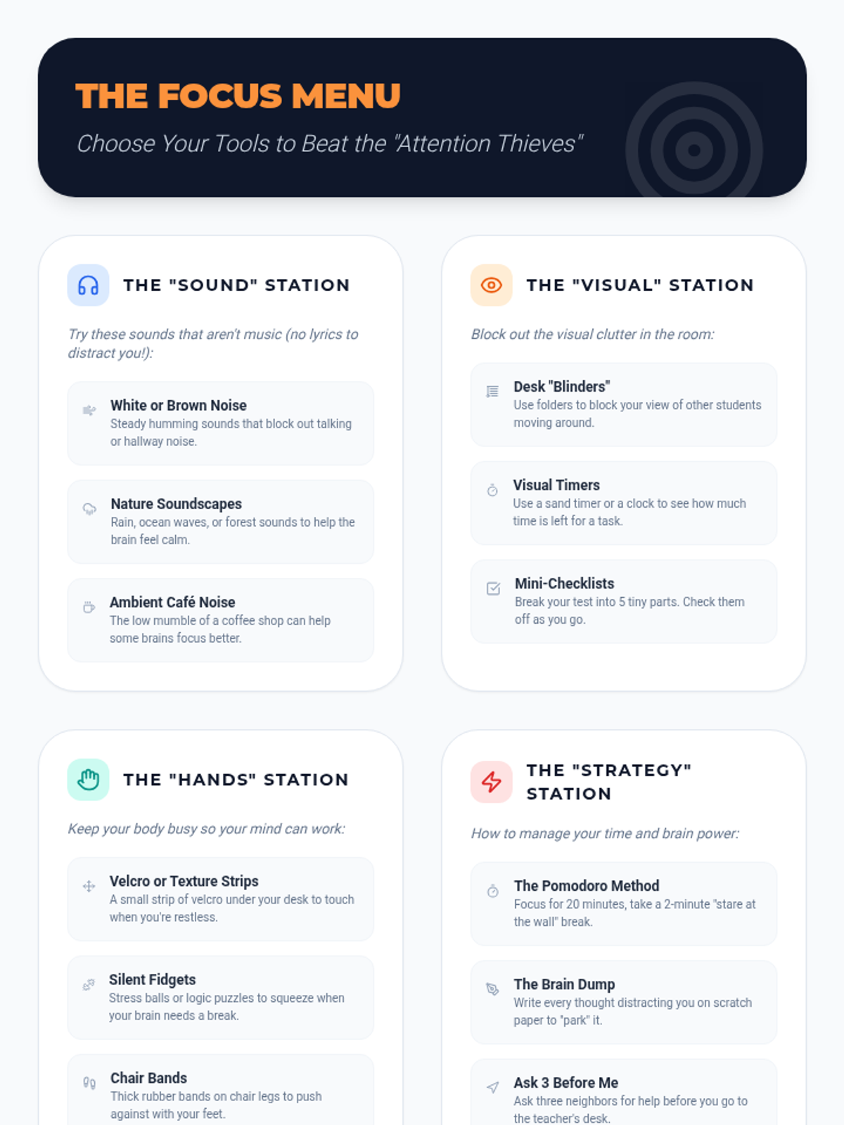 Building the 'focus muscle' through mindfulness exercises and distraction-blocking techniques.