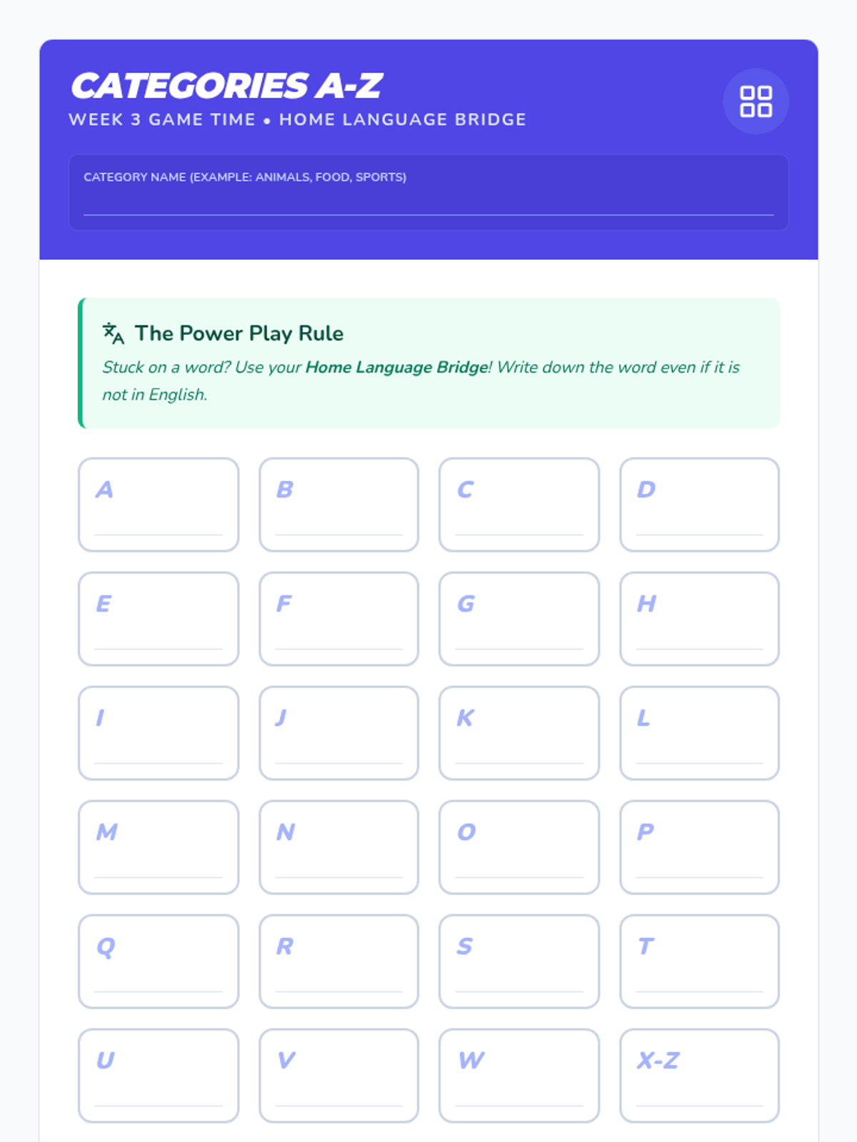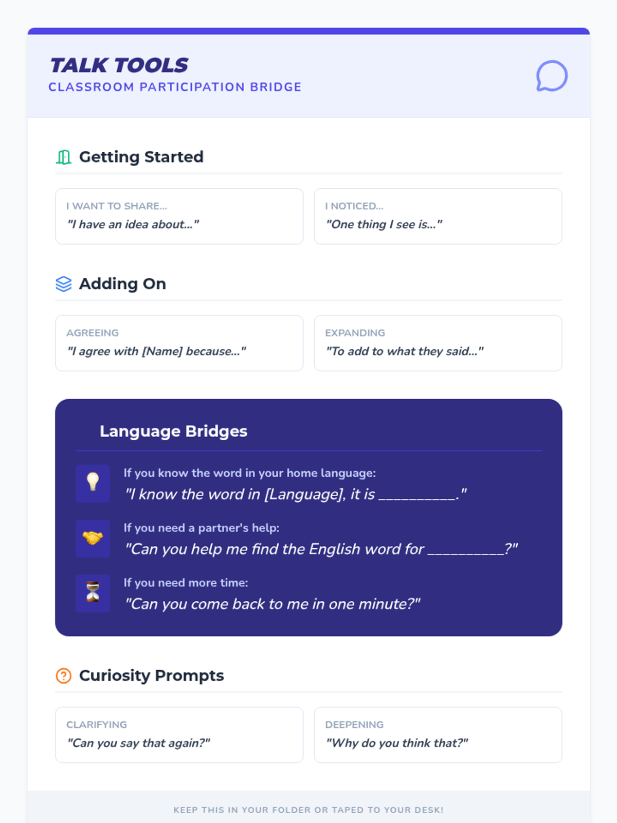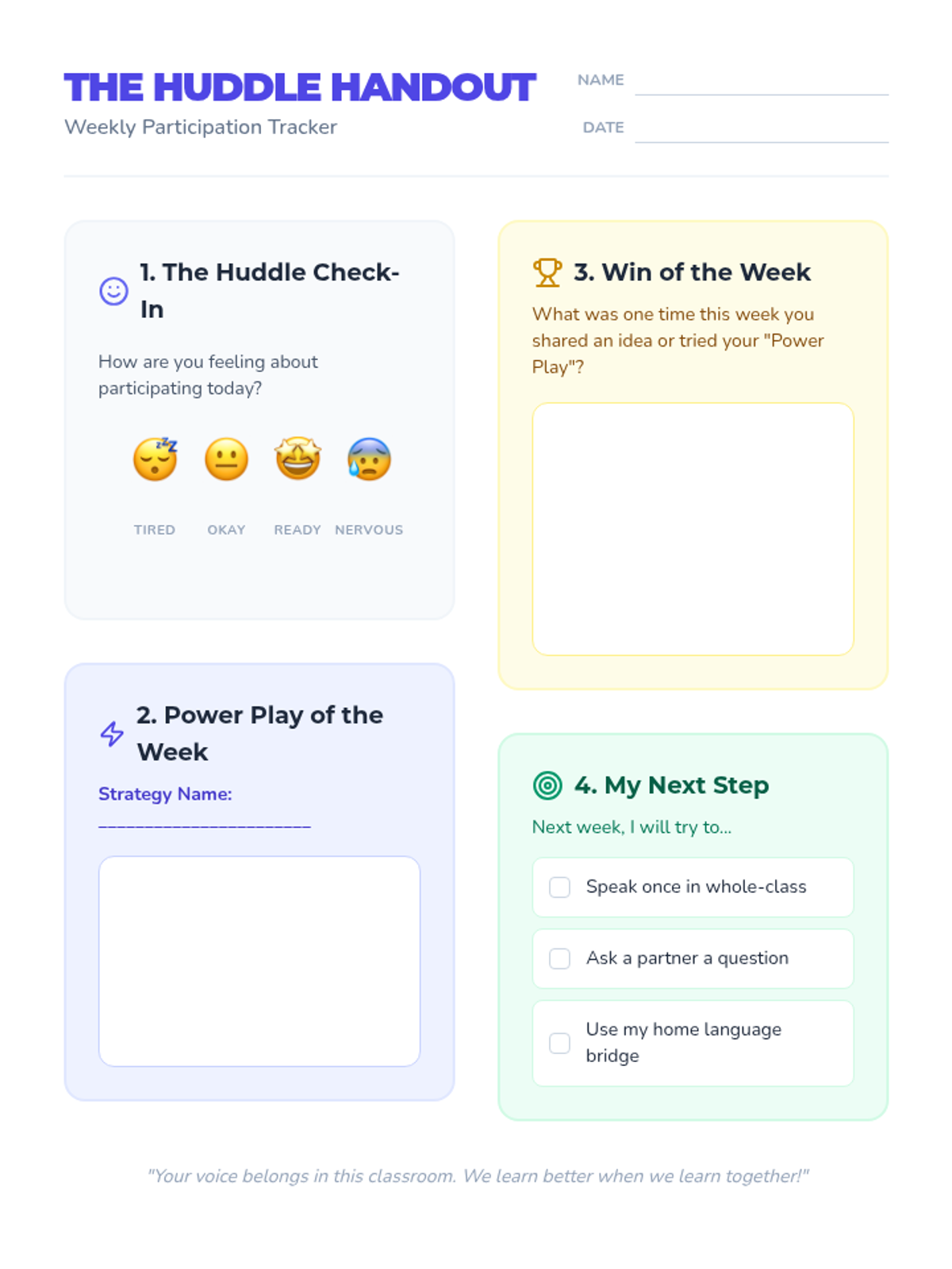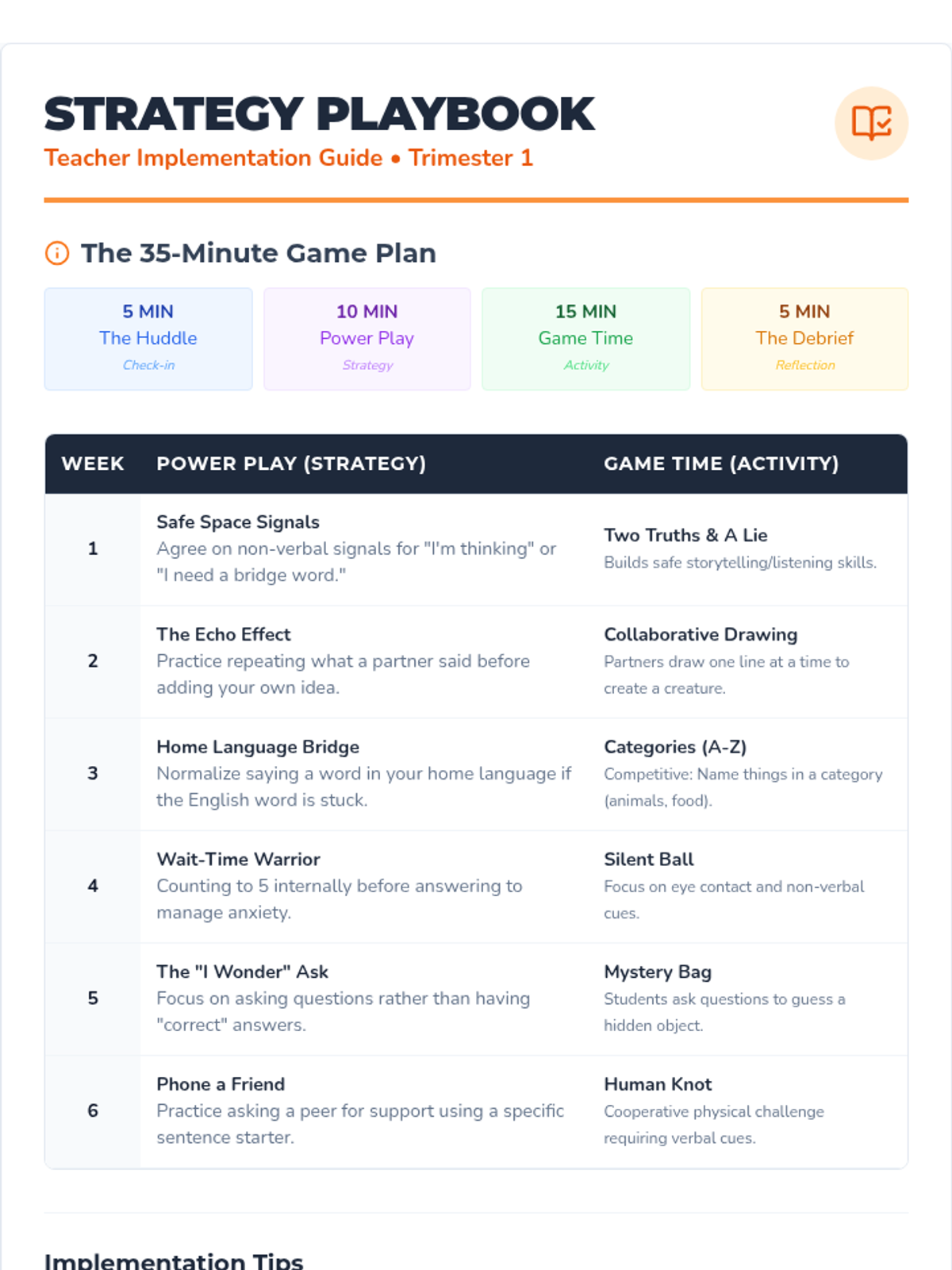 A repeatable 35-minute weekly lesson framework designed for Tier 2 6th-grade MLL students to build confidence, community, and classroom participation through explicit strategies and games.