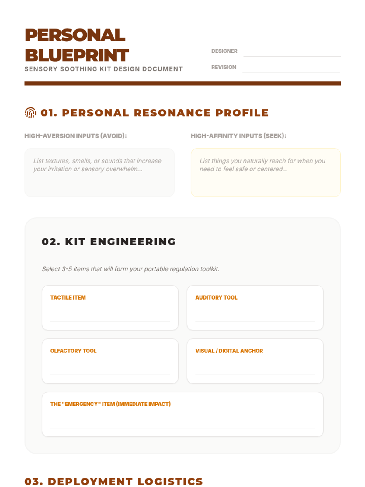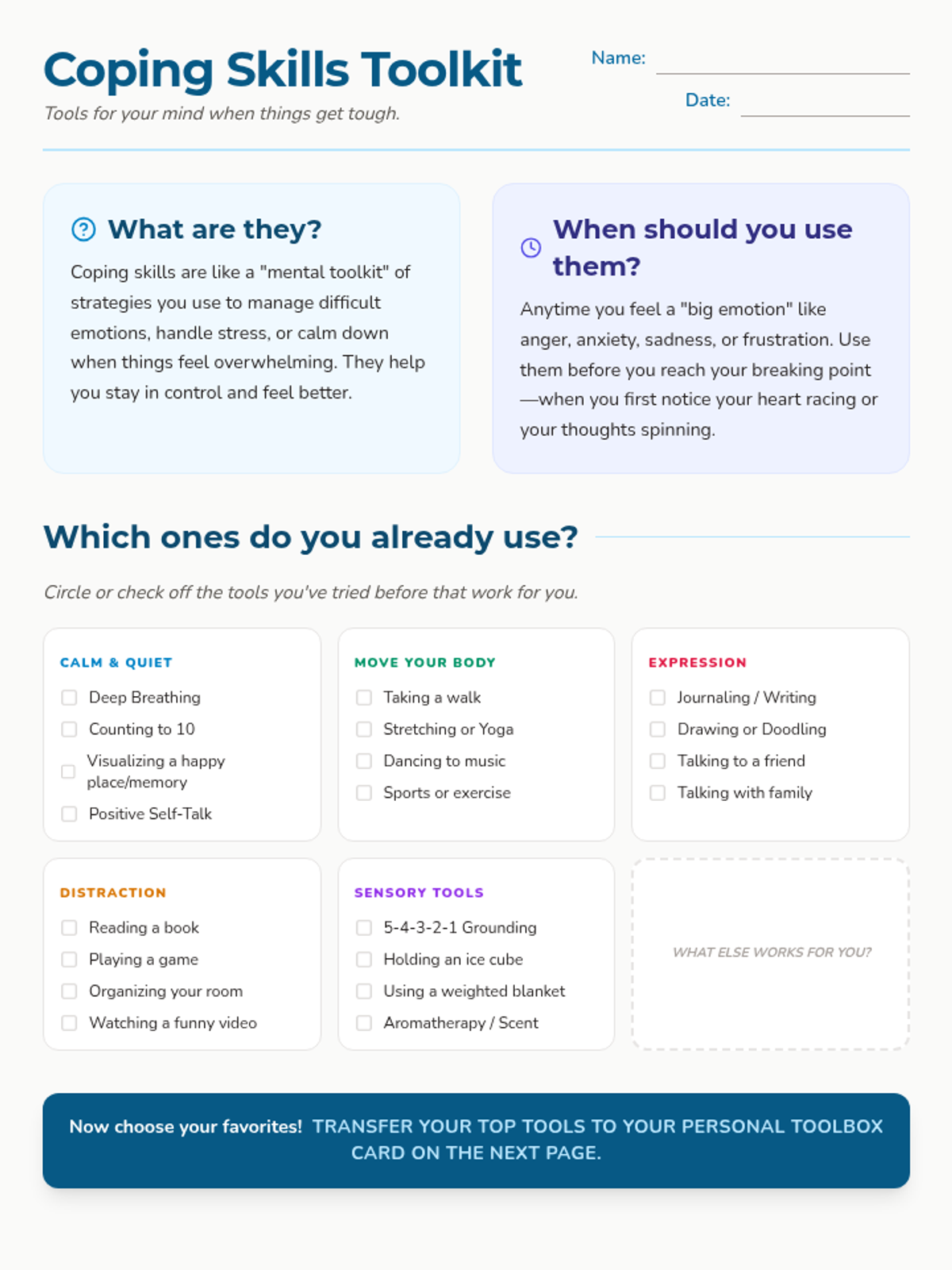 Learners identify personal sensory preferences that induce calm. They design and assemble a portable or digital 'kit' of resources to use during high-stress periods.