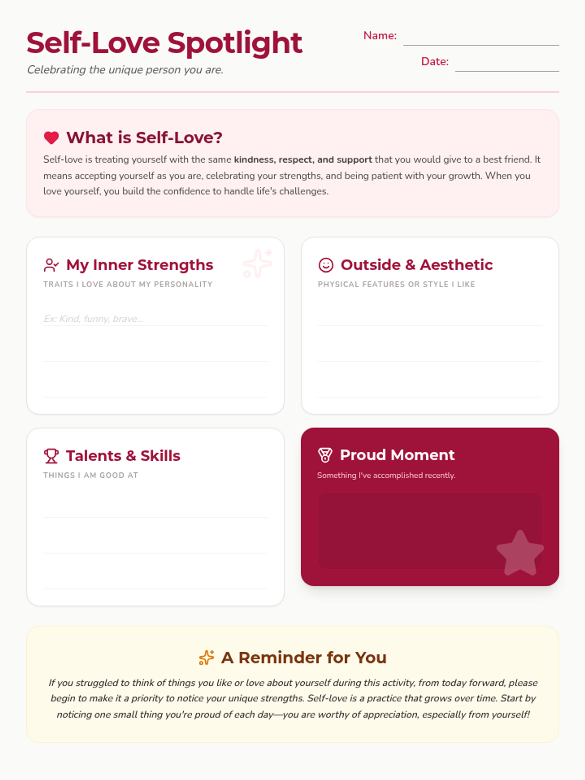 Reflecting on achievements and celebrating the internal feeling of pride through a classroom showcase.
