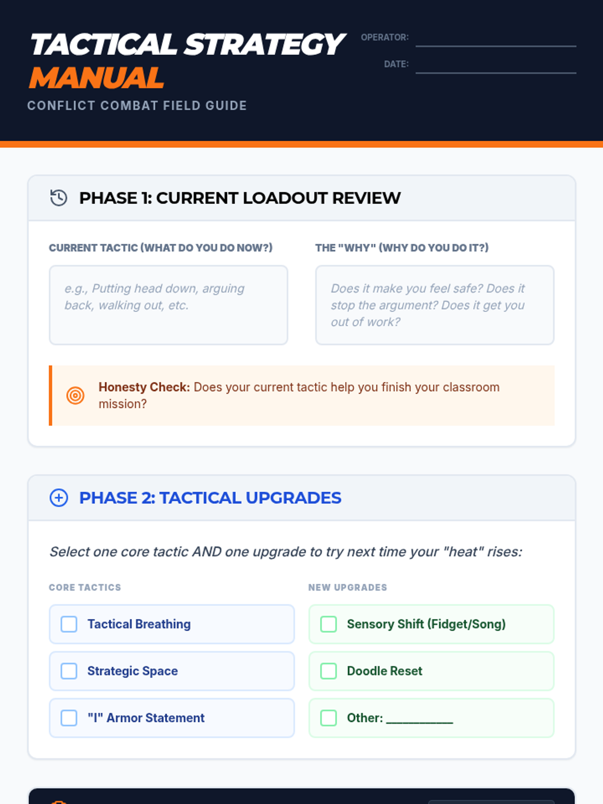 A comprehensive collection of evidence-based coping strategy handouts for middle schoolers, focusing on the biological and psychological 'why' behind each technique. Designed for 7th-grade boys with a tactical, engineering-inspired 'Survival Guide' aesthetic.