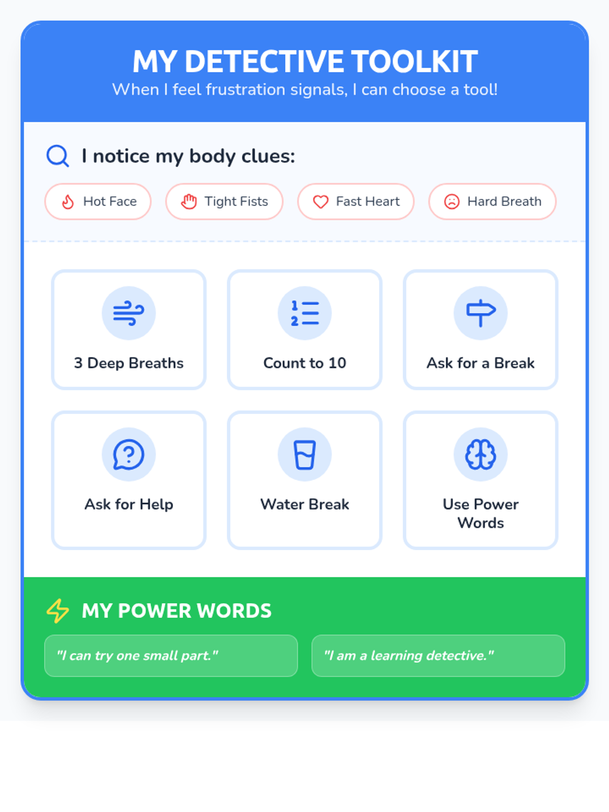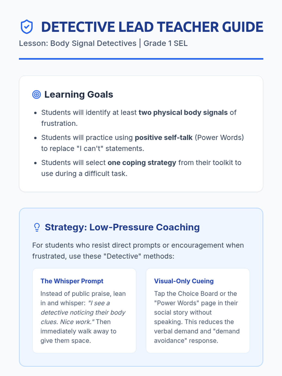 A targeted social-emotional lesson designed to help 1st grade students recognize the physical signs of frustration and use positive self-talk to persevere through challenging tasks.