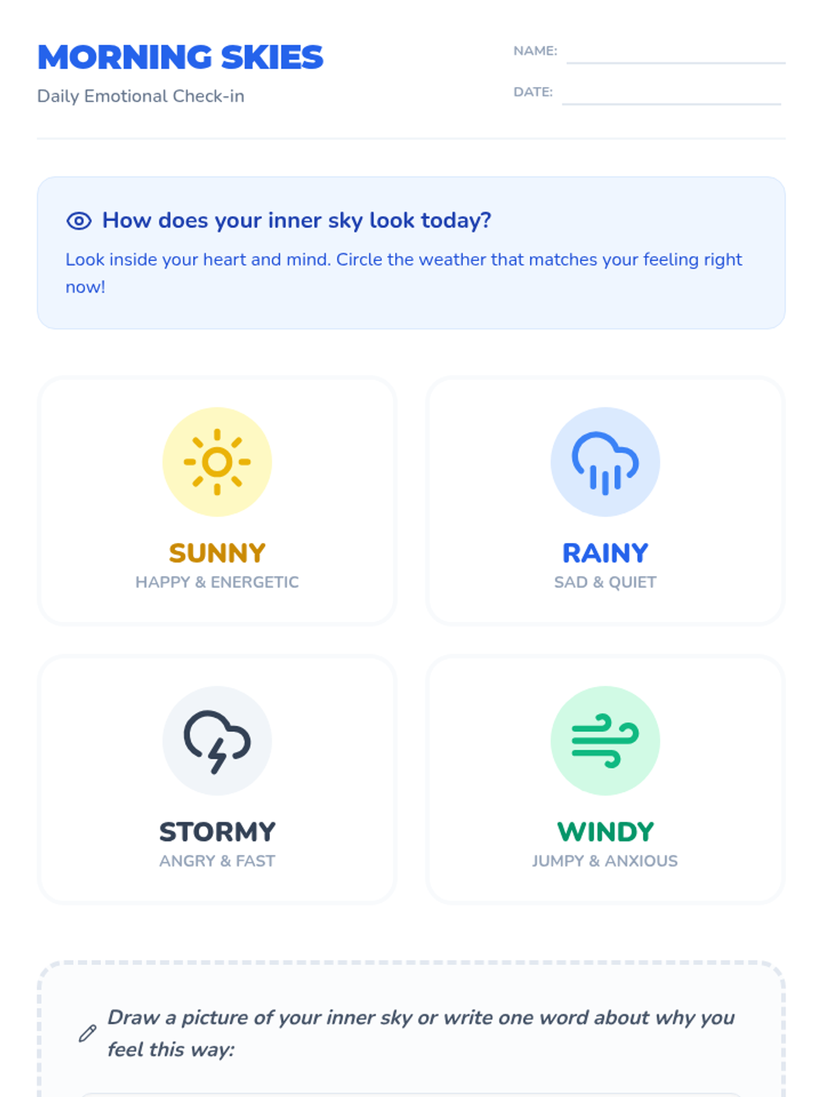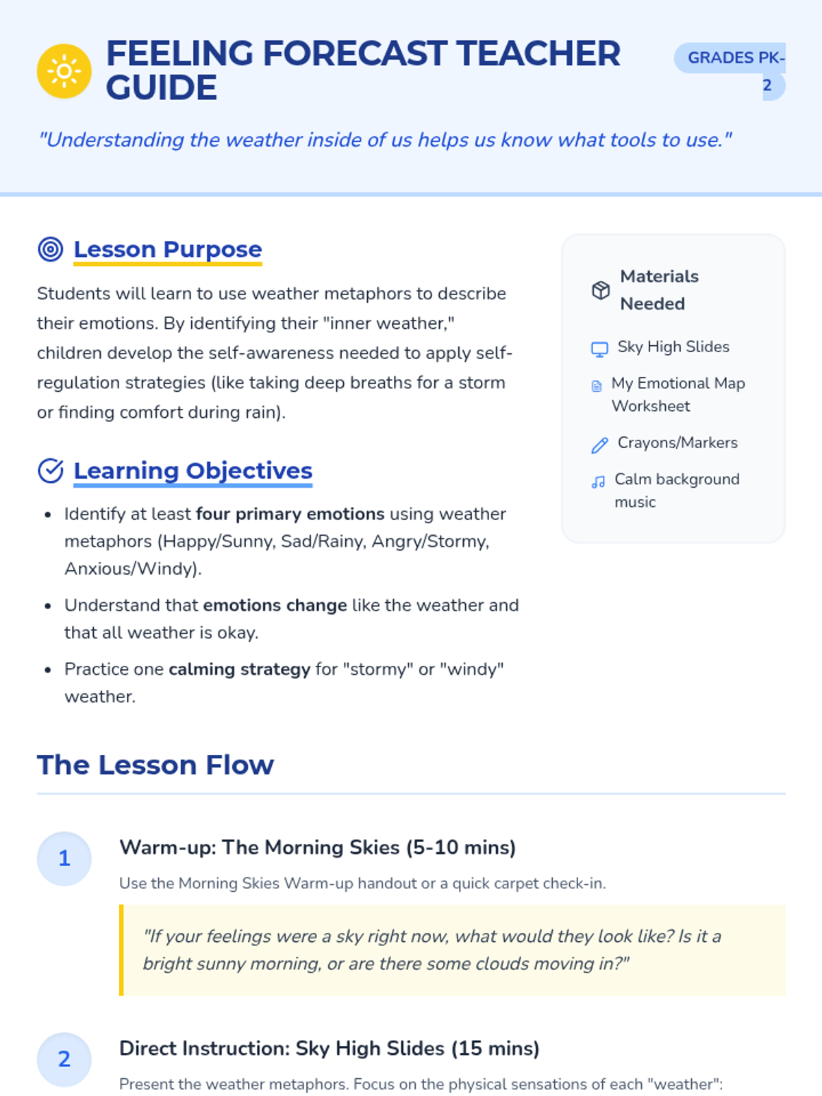 A foundational lesson for PK-2 students to identity and regulate emotions using weather metaphors, helping them build self-awareness and self-regulation skills.
