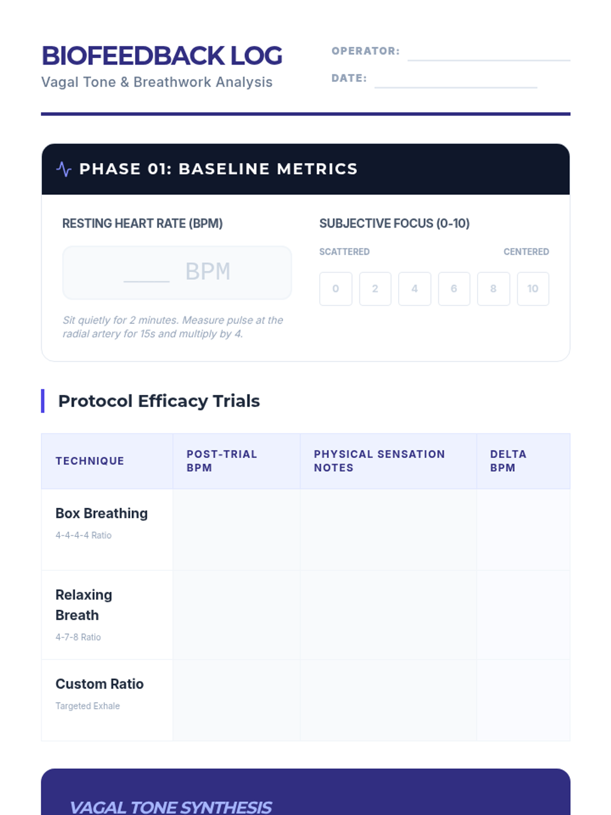 A technical workshop on breathwork, focusing on Box Breathing and 4-7-8 breathing to stimulate the parasympathetic nervous system. Students use biofeedback tools to measure the efficacy of different ratios.
