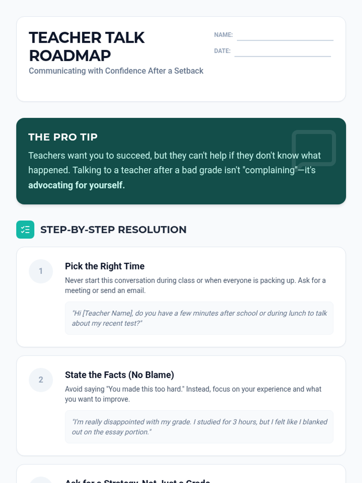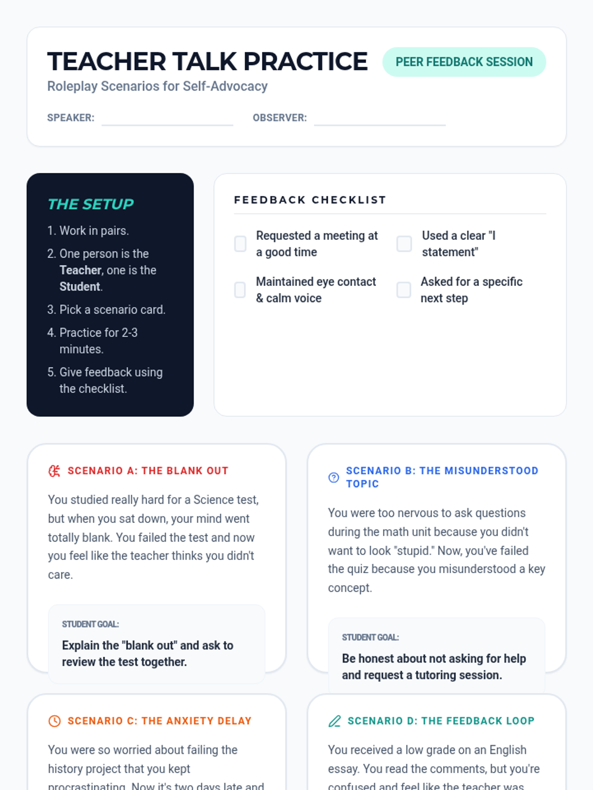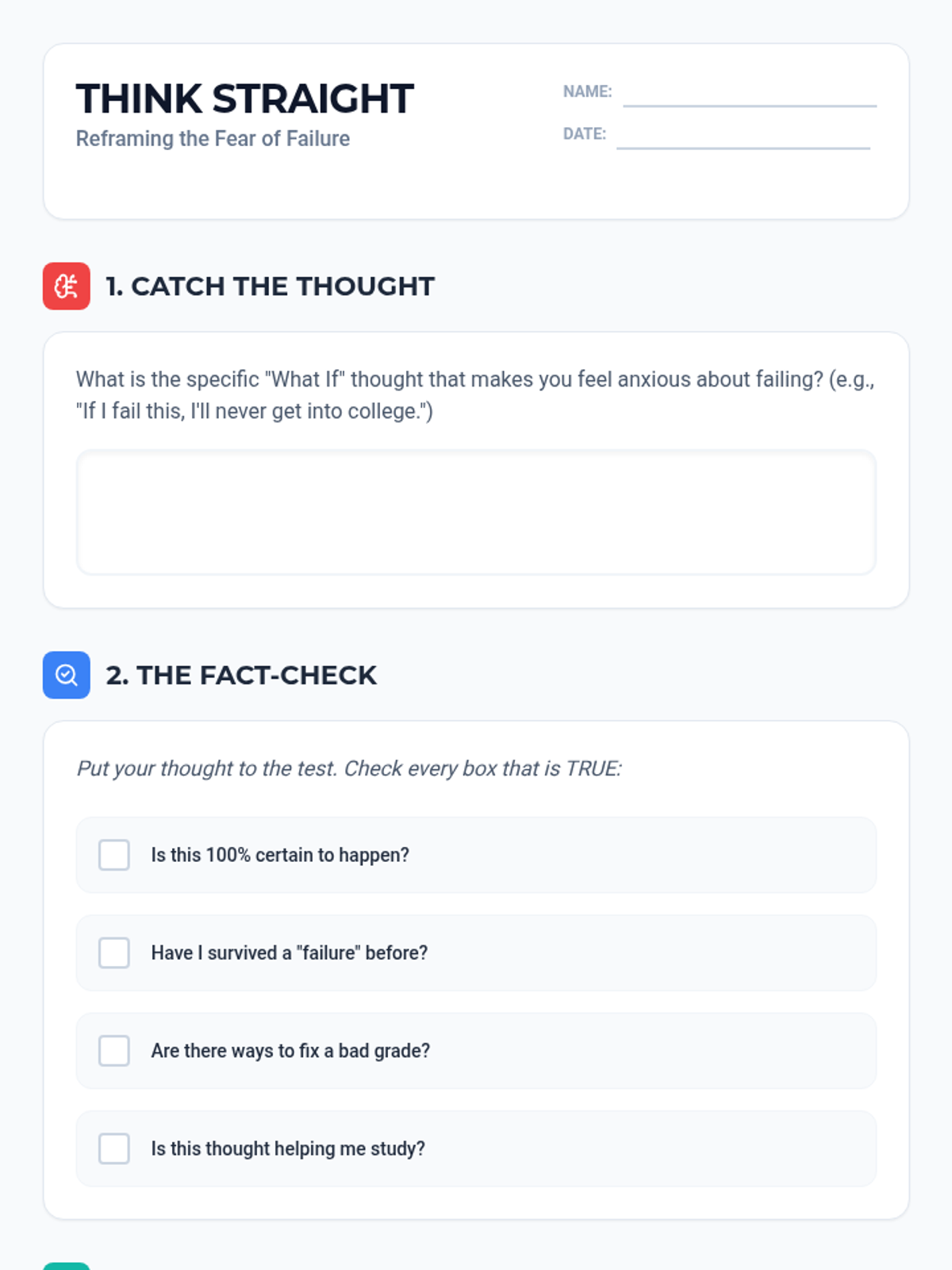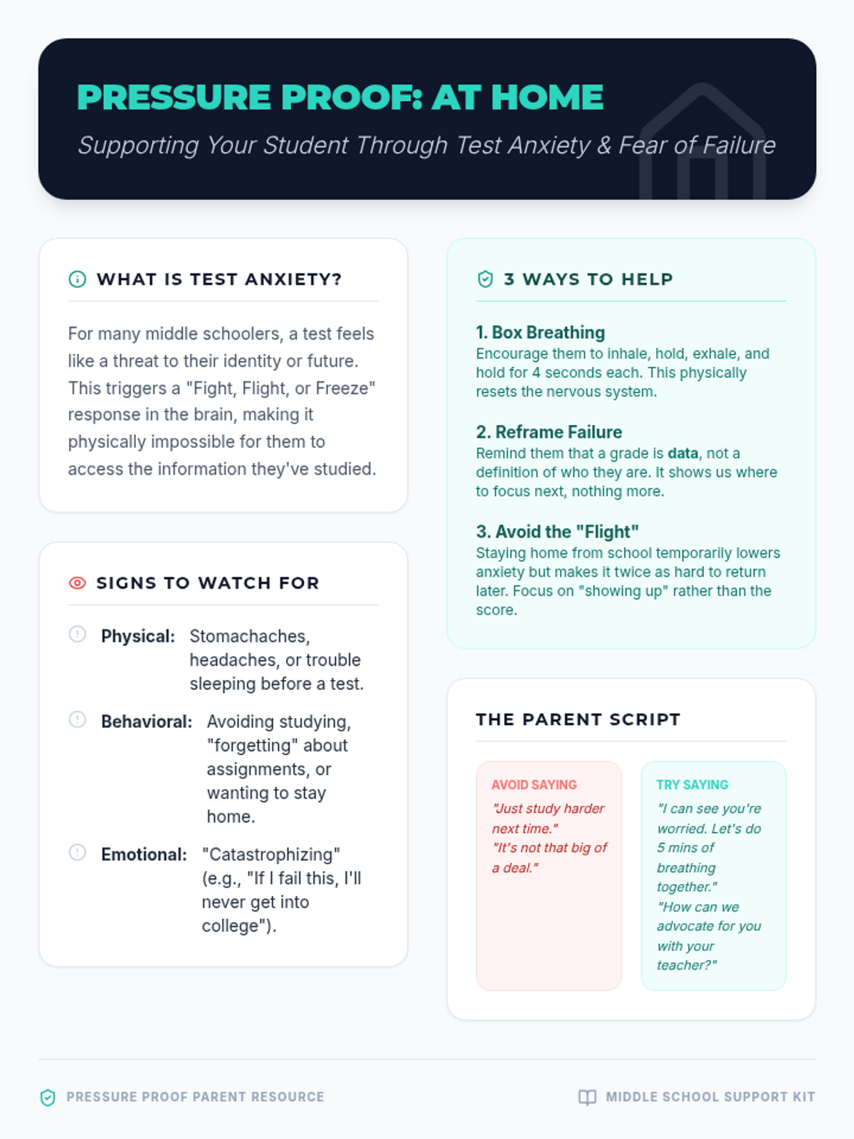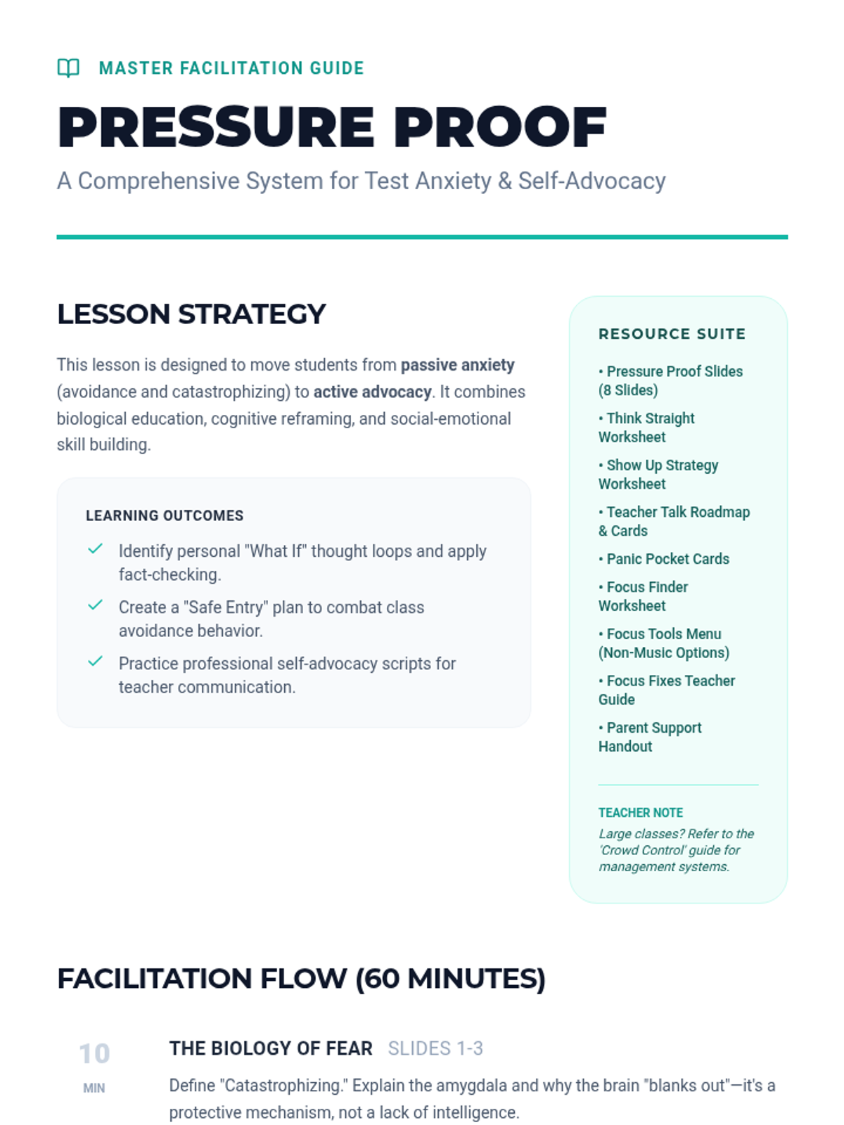 A comprehensive lesson designed for middle school students to address test anxiety, specifically the fear of failure. It includes a slide presentation for instruction, a reflective worksheet for reframing thoughts, and a portable 'emergency' strategy card.