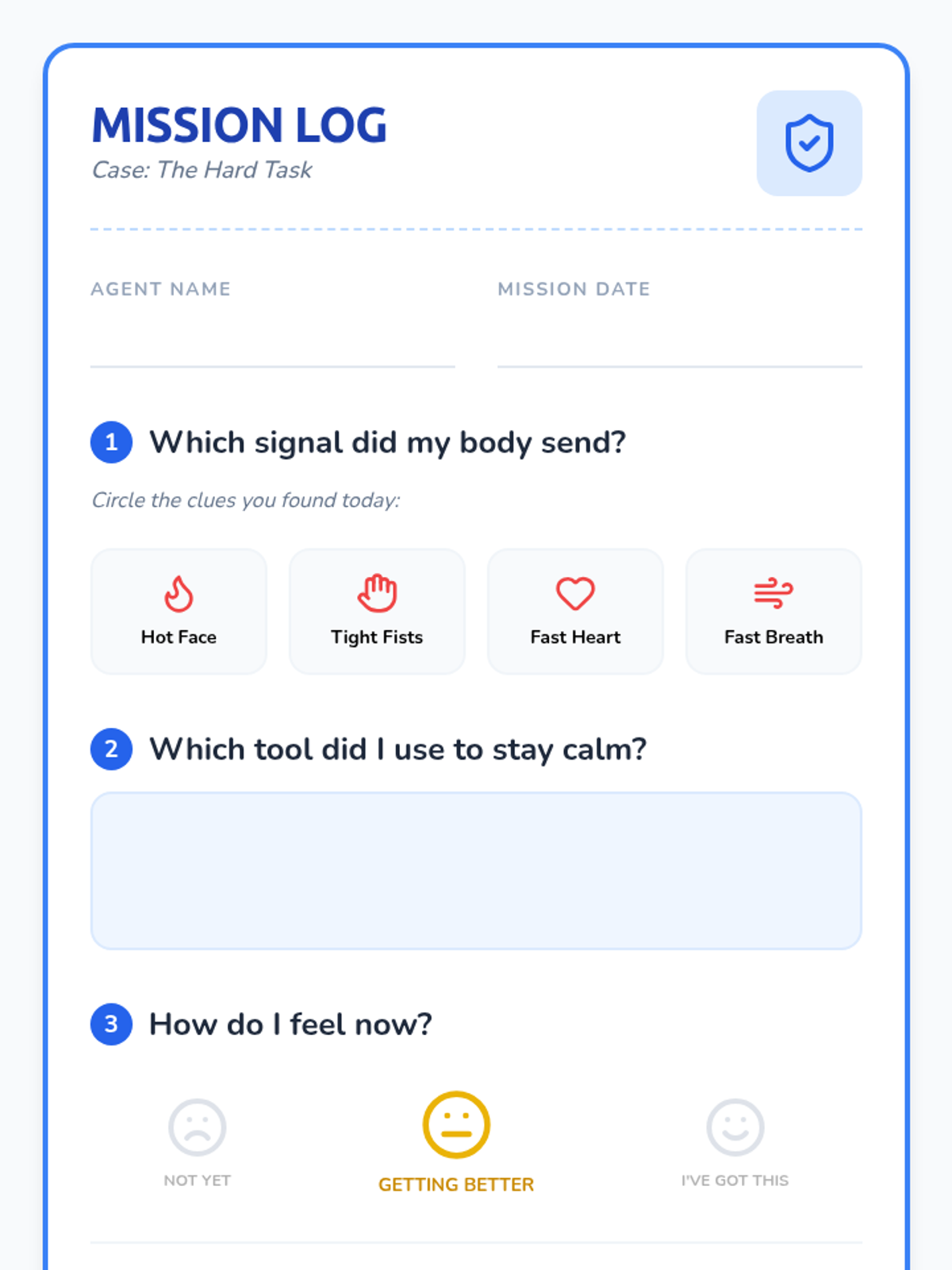 Students learn to identify their feelings using a visual scale and develop coping strategies for managing anger and big emotions.