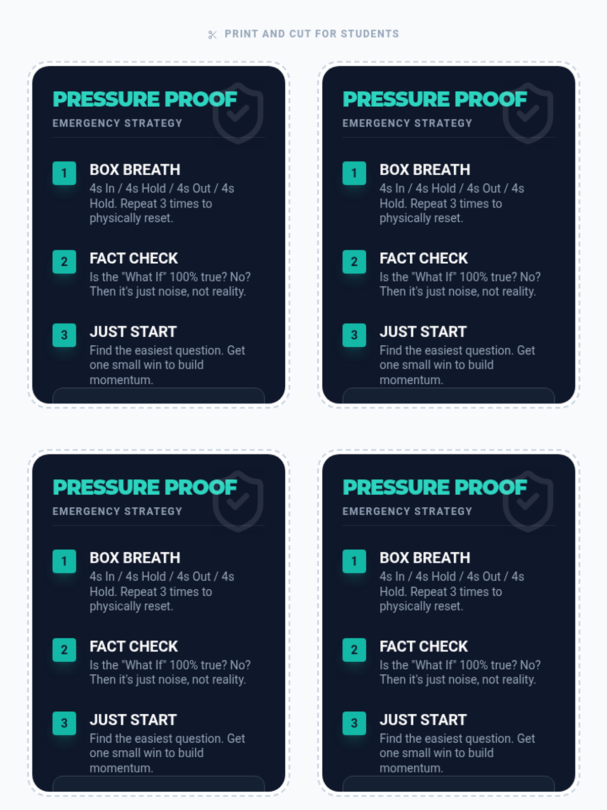 A workshop for grades 7-12 designed to manage test anxiety through cognitive reframing and grounding techniques. Students learn to transform performance pressure into focused energy using the 'Focus Filter' framework.