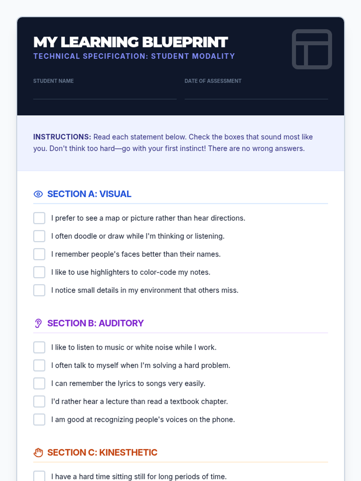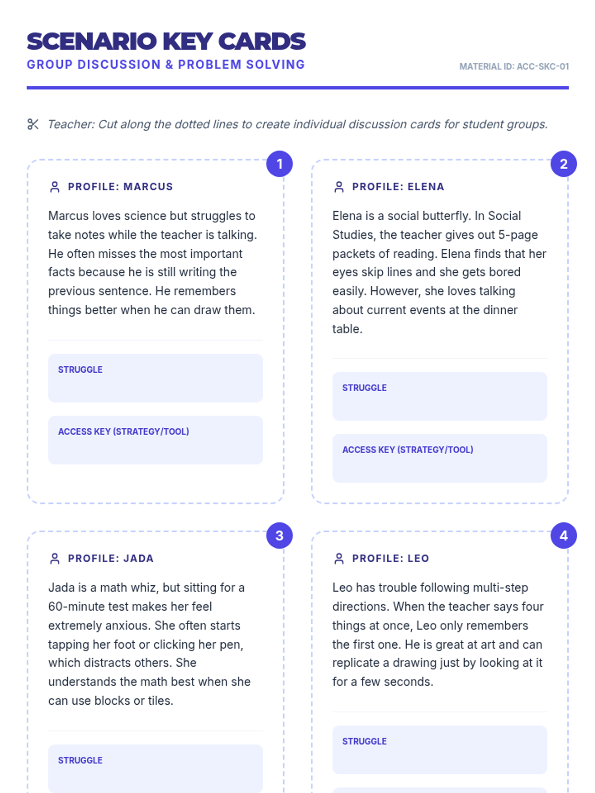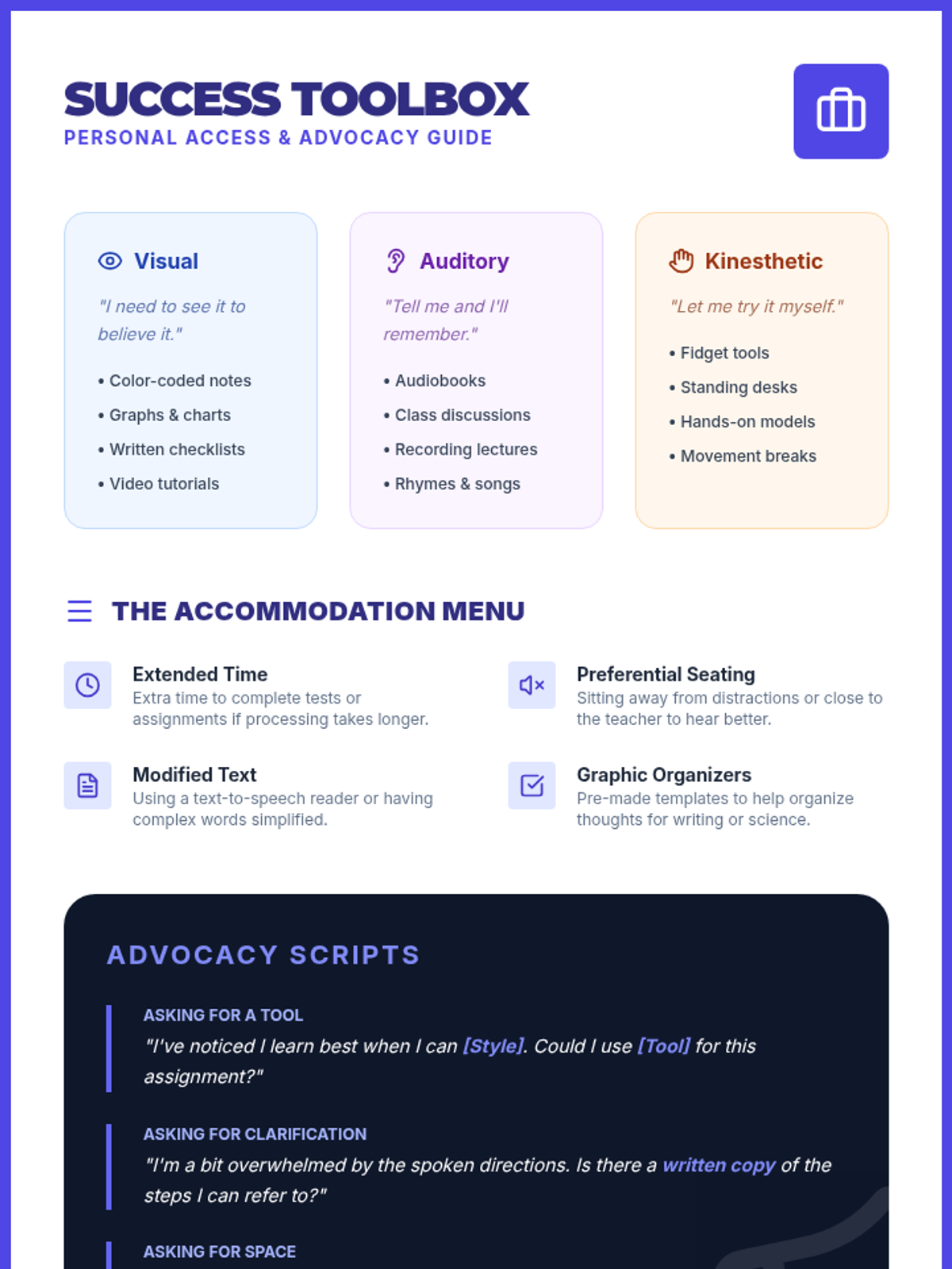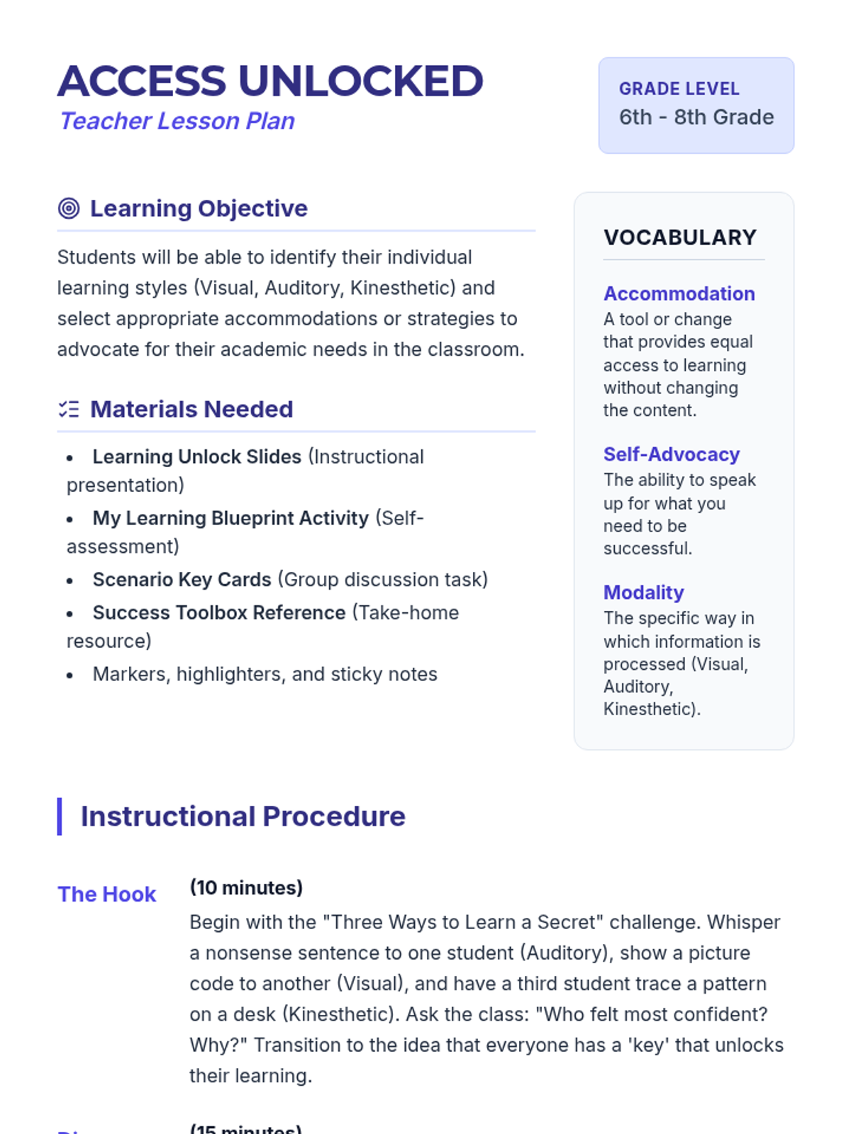 A middle school lesson designed to help students identify their learning preferences and advocate for necessary accommodations. Through self-assessment and scenario practice, students build a personalized toolkit for academic success and independence.