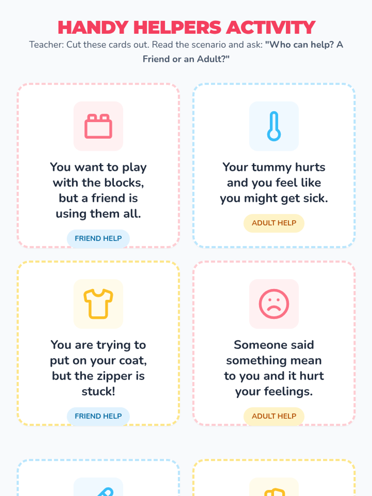A 30-minute small group lesson for kindergarten girls focusing on identifying when and how to ask friends and adults for help through interactive scenarios and creative expression.