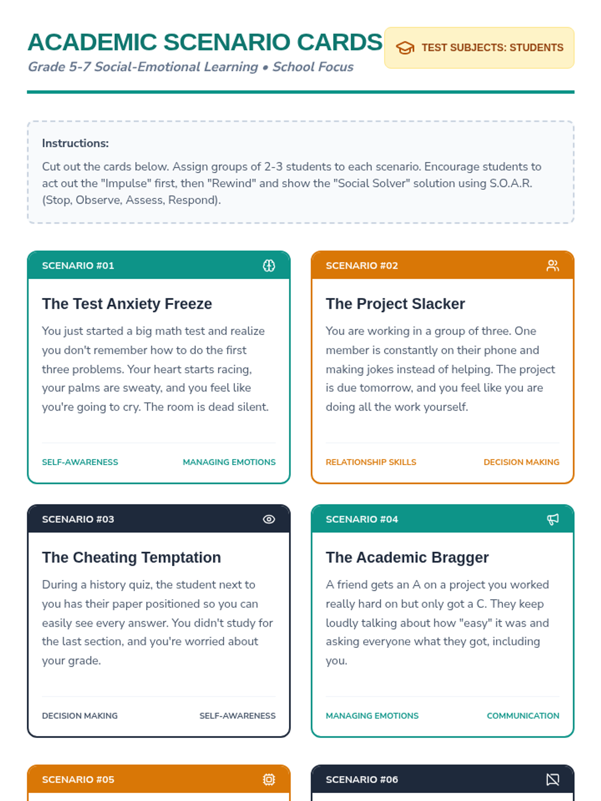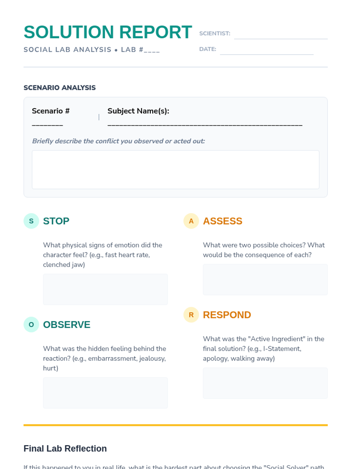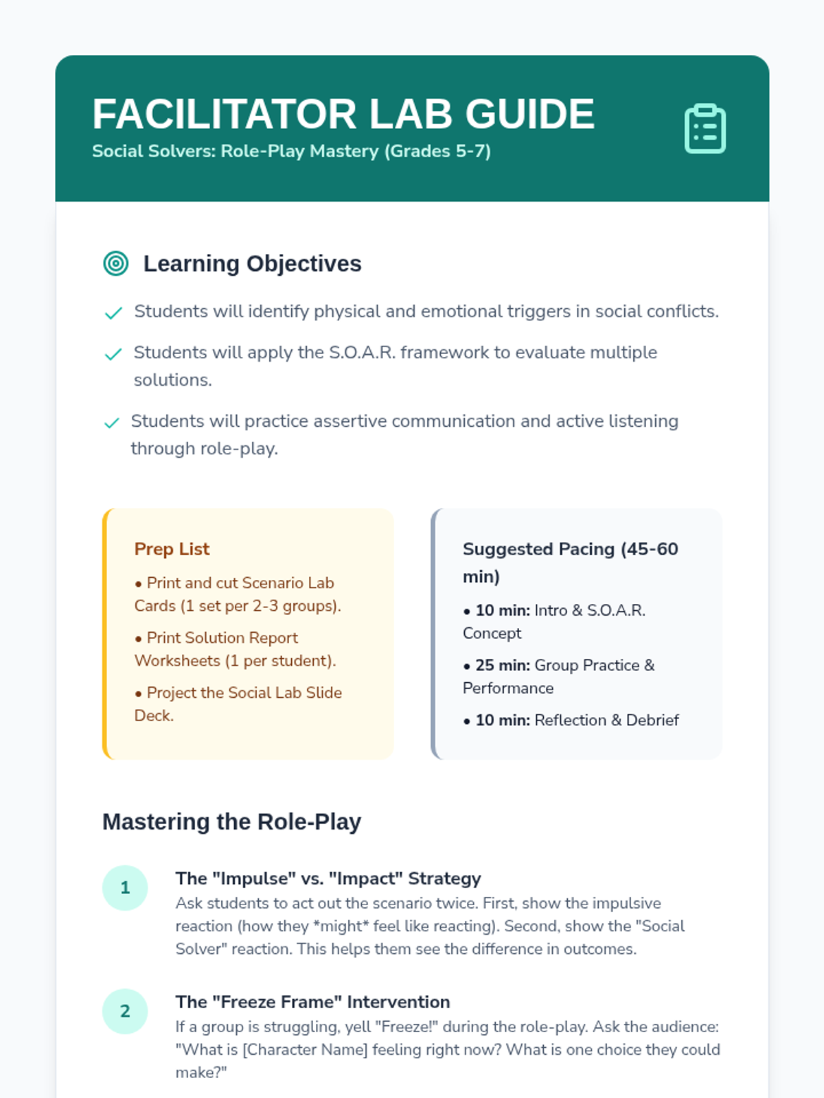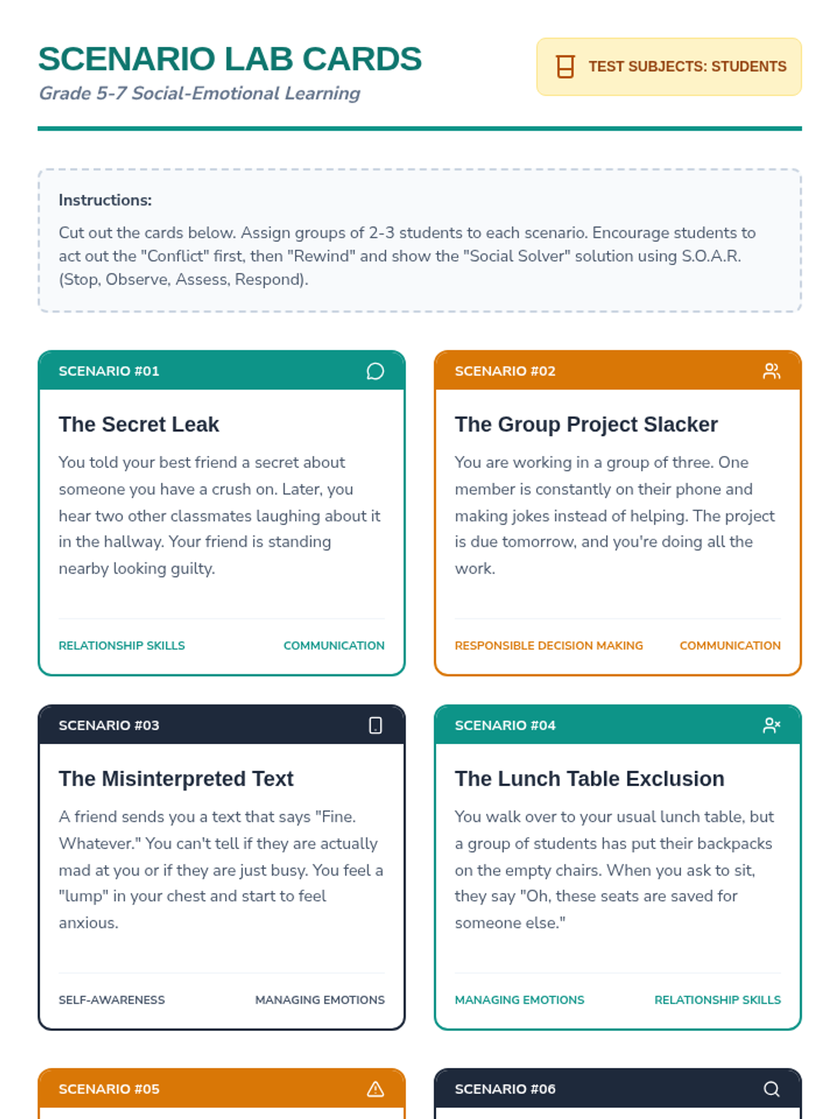 A comprehensive SEL lesson for grades 5-7 focused on role-playing social scenarios to build self-awareness, communication skills, and responsible decision-making using a 'Social Lab' experimental theme.