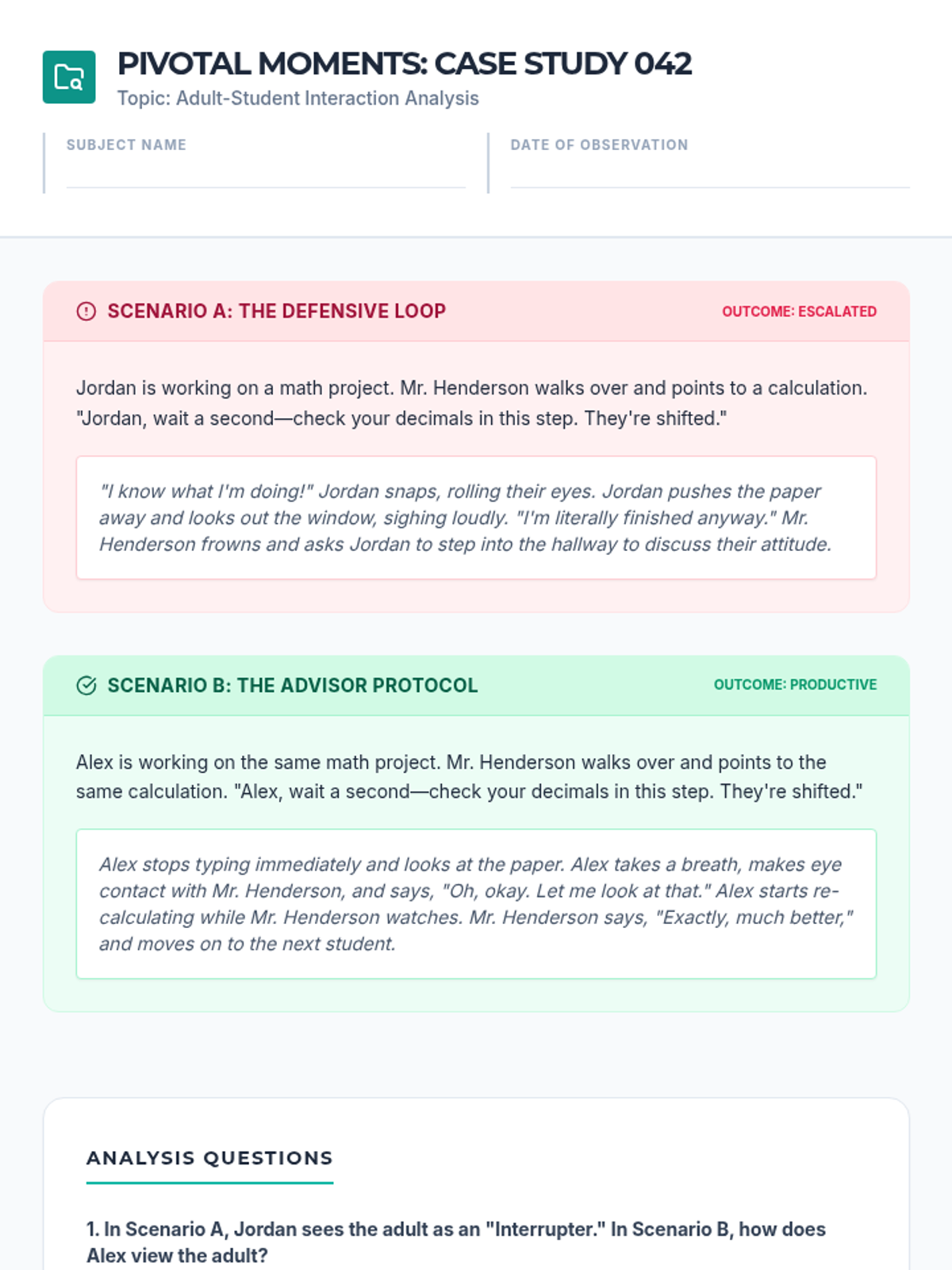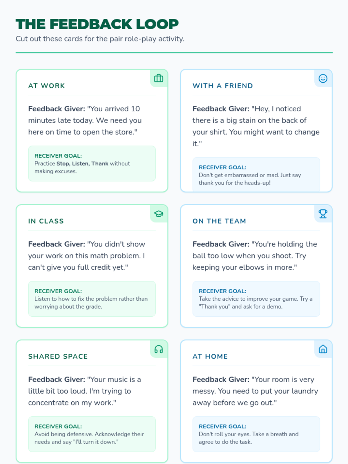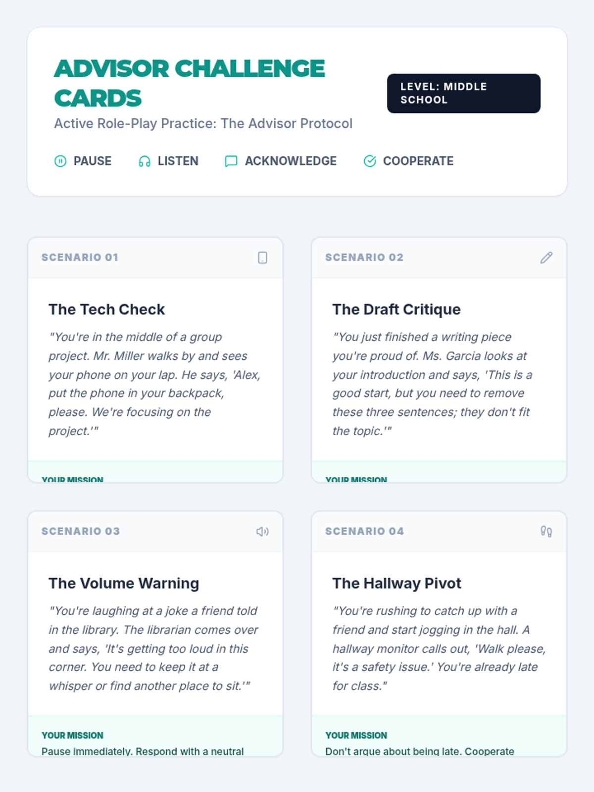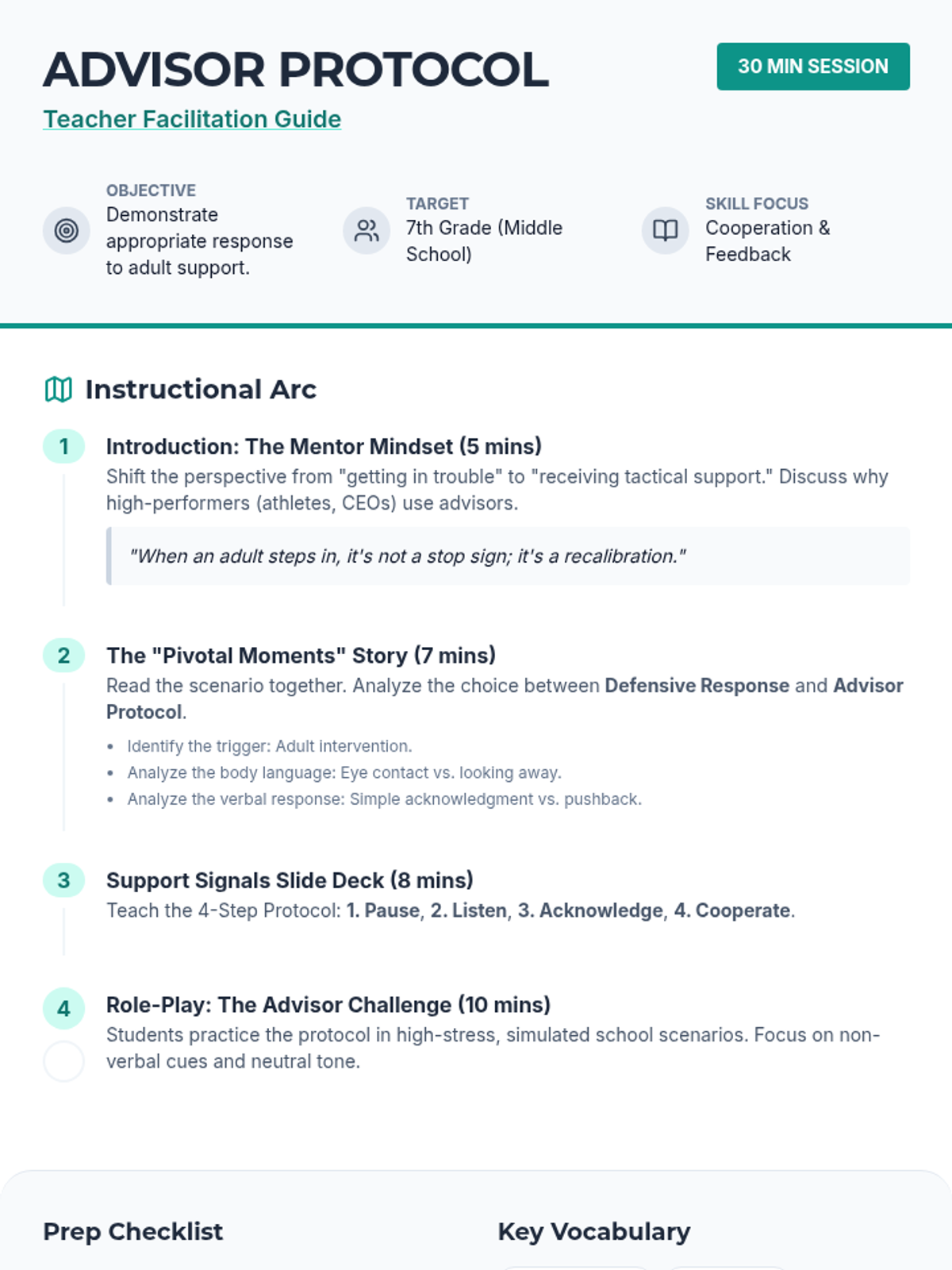 A 30-minute lesson designed for 7th graders to develop the social-emotional skill of accepting adult support and feedback through active listening and cooperation. Students will practice specific 'Advisor Protocols' to handle adult interventions productively.