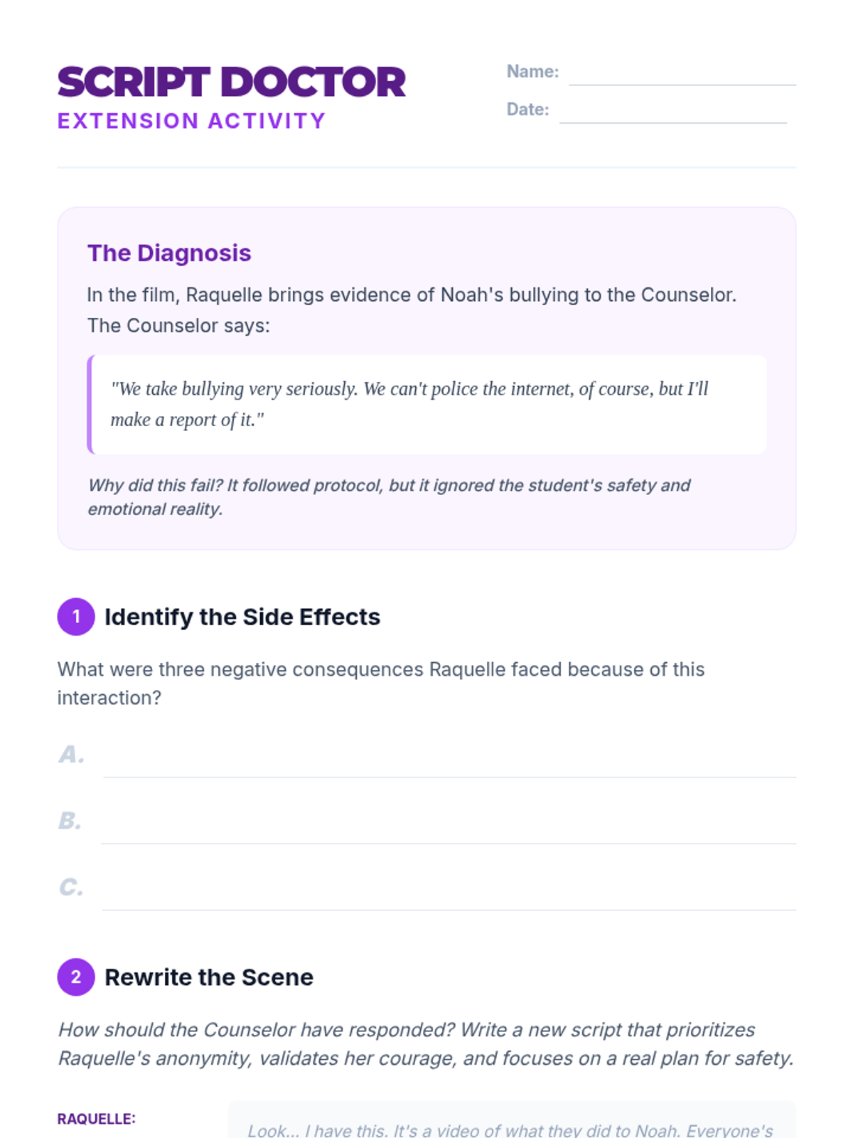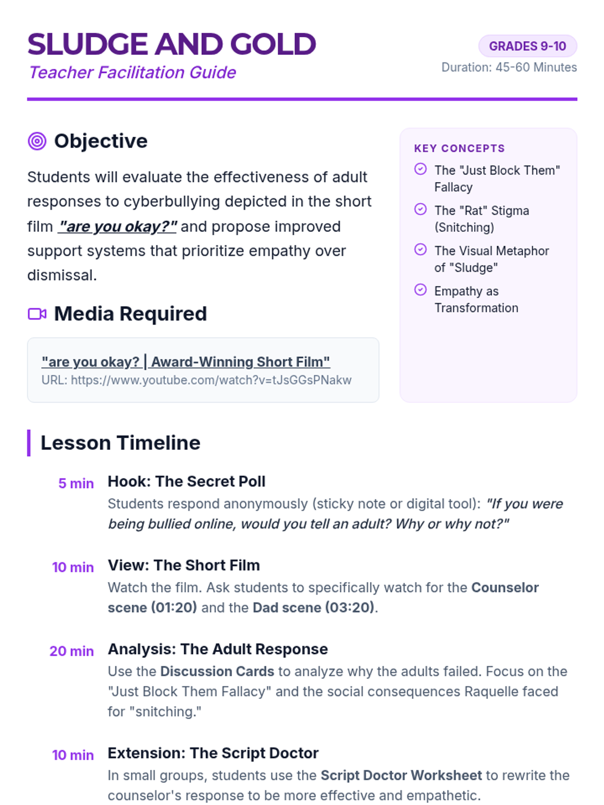 A lesson for high schoolers analyzing the effectiveness of adult responses to cyberbullying, featuring the short film 'are you okay?'. Students explore the 'just block them' fallacy and the stigma of 'snitching' through discussion and role-play.
